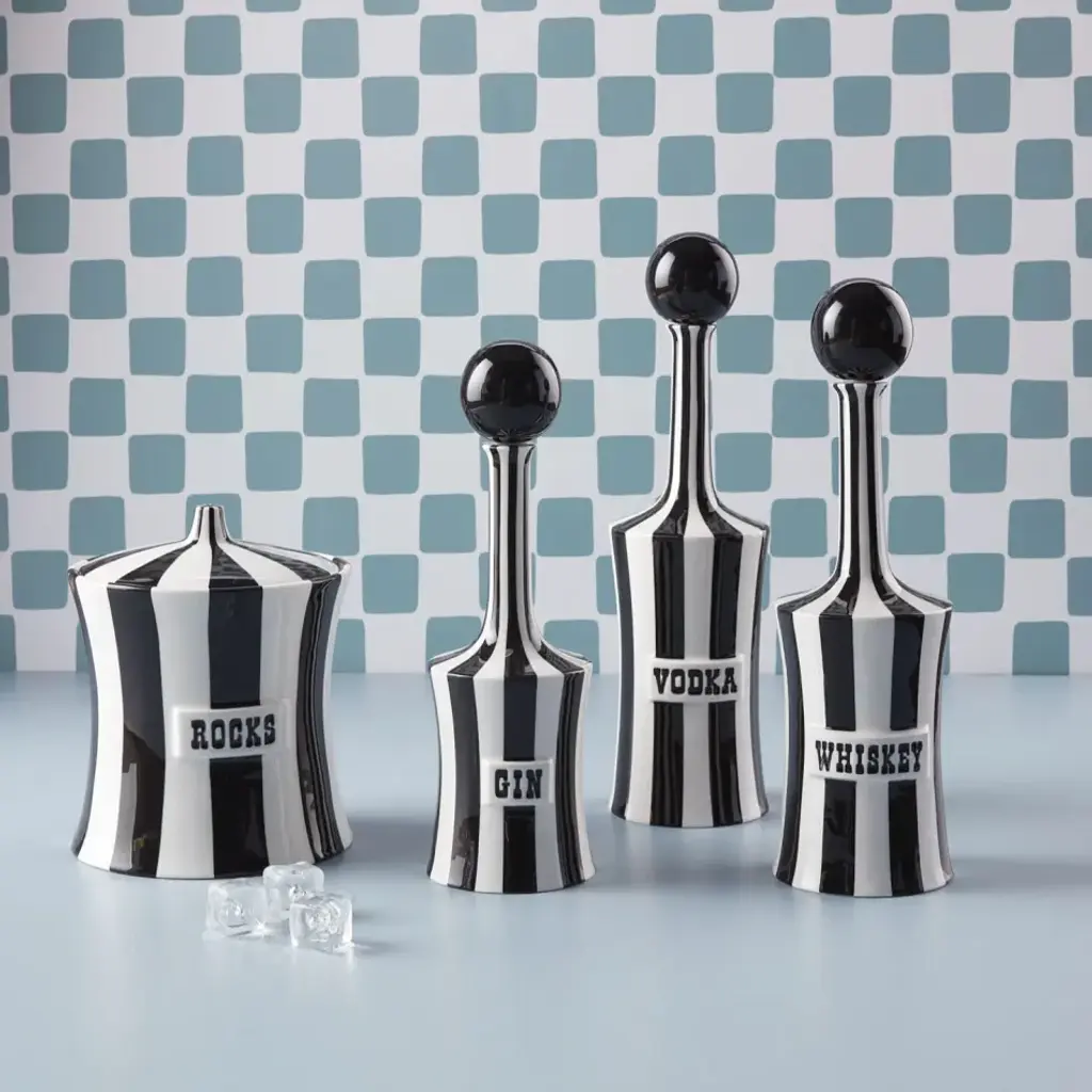 Guilty Pleasures.Our iconic Vice canisters reimagined as the spirited ice bucket your libation station needs. Parade your cubes in hand-painted porcelain with a graphic black and white finish, featuring a gasket-sealed lid for temperature control. Cluster on your counter or bar cart along with our Vice Decanters (and a few canisters for snacking while sipping!). Tongs included.
