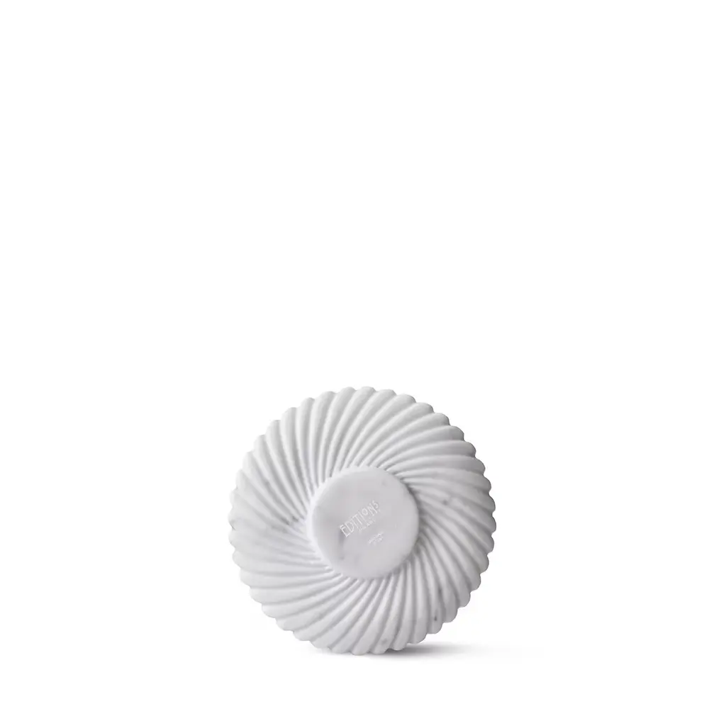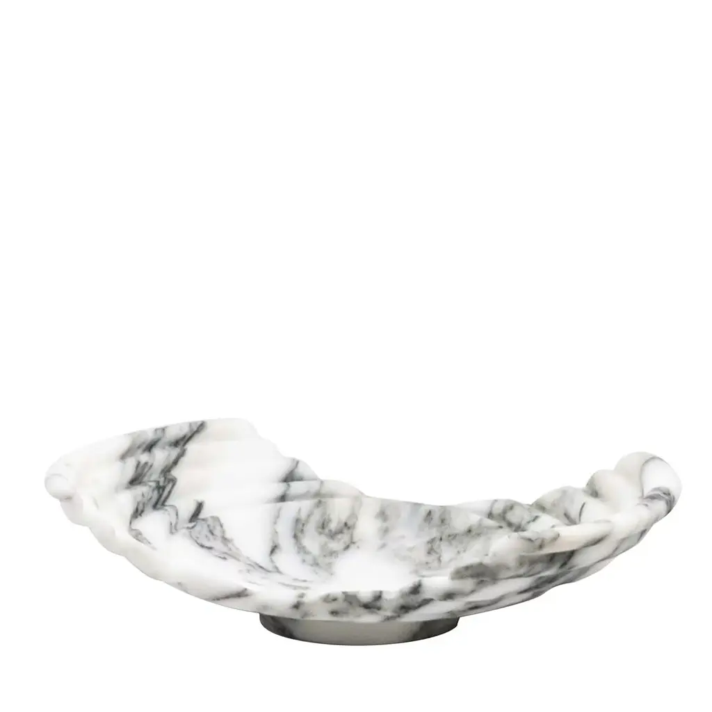 This elegant dessert plate, part of the Victoria collection, is a luxurious piece that will add sophistication to any dining room and can be paired with the other pieces from the same series to create a stunning tea set. Made entirely of Arabescato marble, this plate features a round shape and a smooth top with a pleated edge, while the bottom is strikingly carved with swirling parallel groves. Both modern and traditional, this is unique piece of great visual impact.