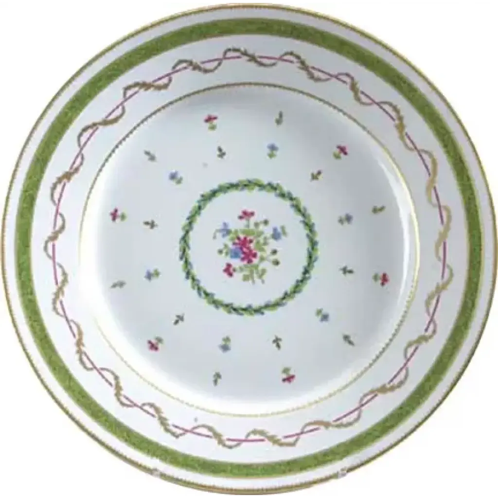 Haviland’s Vieux Paris Vert dinnerware is as romantic and charming as the city of light. Sweet flowers, green garlands and gold accents decorate each piece. Five piece place setting includes dinner plate, dessert plate, bread & butter plate, teacup & saucer. Haviland Porcelain was founded by David Haviland, an American who moved from New York to France after he was brought a broken tea cup to match and recognized the quality and color of the old piece of porcelain. Filled with curiosity, he went to France to find the factory where the cup had been made, but the samples he was sent were not up to his standards. So in 1841, he moved to Limoges to set up his own factory. Traditional French dinnerware was usually produced in Limoges and sent to Paris for decoration. Haviland insisted on setting up a studio within his factory to have more control over the designs. Renowned artists, including Cocteau, Dali, and Kandinsky have played a role in the company's designs. Today, Haviland is one of the premier names in French porcelain dinnerware, sought by collectors all over the world. Clients have included the White House, Empress Eugenie, General de Gaulle, Jacques Chirac, the Emperor of Japan, and the Royal Court of Morocco.