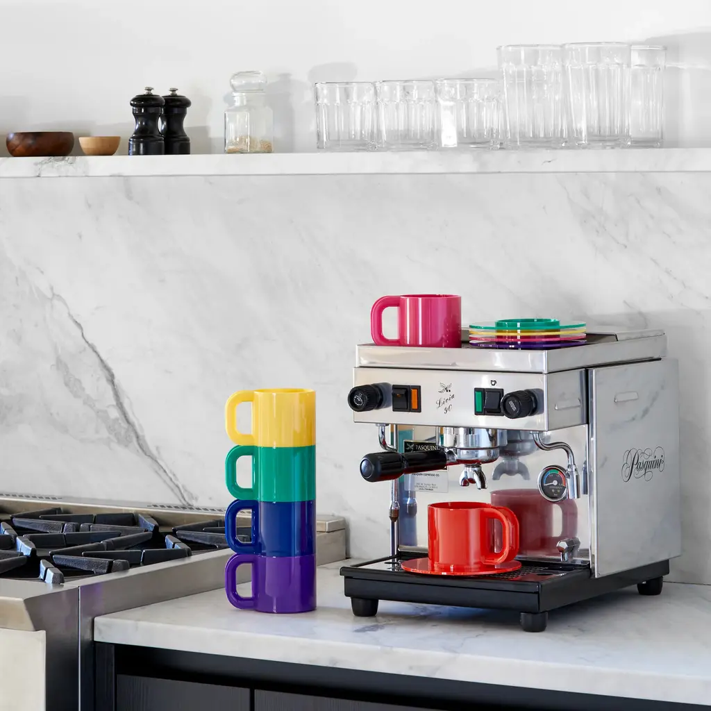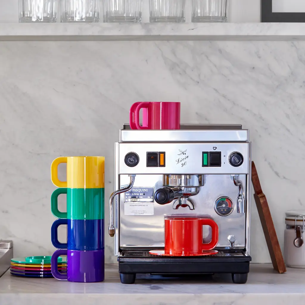 Designed by Lella and Massimo Vignelli in 1964, this Max Cups & Saucers is from their revolutionary Hellerware stacking tabletop concept. Made from durable polystyrene plastic, this set of six cups and six saucers is made for everyday use. They stack up for compact storage in your cupboard, or leave them out on your counter for an interesting visual and colorful statement. Each cup measures 2.5h x 3.5"diam and each saucer measures 0.25h x 5.75"diam.FDA safe and BPA- and BPS-free. Wash before use. Not safe for microwave, oven, heat lamps or warming drawers. High acidity foods may discolor the finish, but will not degrade the food safety qualities. If this occurs, soak with apple cider vinegar to return the coloration. When serving hot food items, especially soups and beverages, they should not exceed 212°F. Wash before use. Dishwasher-safe (top rack only).