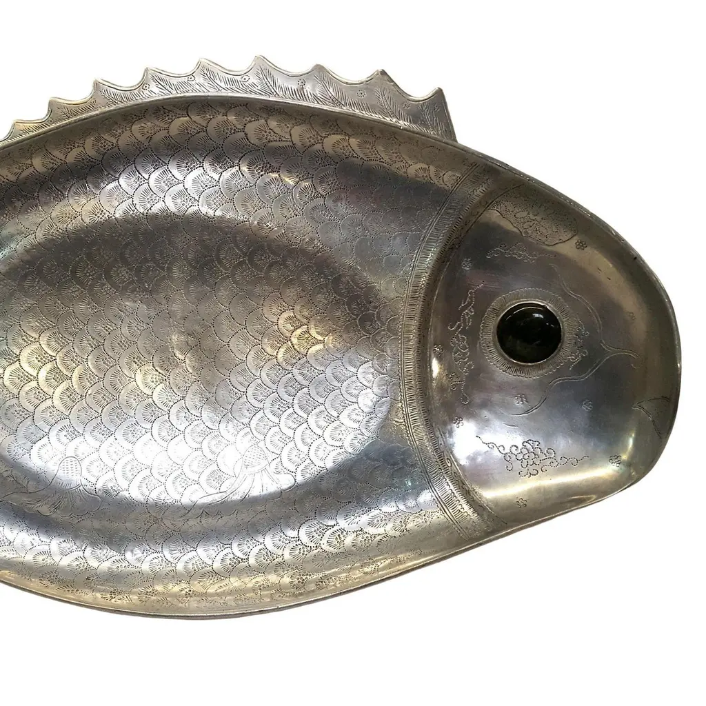 Vintage Arthur Court Aluminum Fish Serving PlatterYear manufactured: 1975Dimensions: 24 inches long X 13 inches wide X 2-1/2 inches tallInfo: Gorgeous aluminum fish serving platter designed by Arthur Court in 1975. The piece has intricate detailing in the eye (green Jadeite), scales, tail, and fins. The back is stamped "Arthur Court Copyrighted 1975". Polished aluminum back. A wonderful piece for display in a china cabinet, shelf or on the table.Designer Info: In business since 1966, Arthur Court Designs has always been at the forefront of innovative designs and function. With a flair for the whimsy and a passion for nature, their designs have become a timeless addition to the countless connoisseurs who continue to add to their collections with each new introduction.All of their products are designed in CaliforniaEach creation has the individuality of the craftsmen who have cast these pieces from the raw aluminum to the beautiful table decorations you see today.