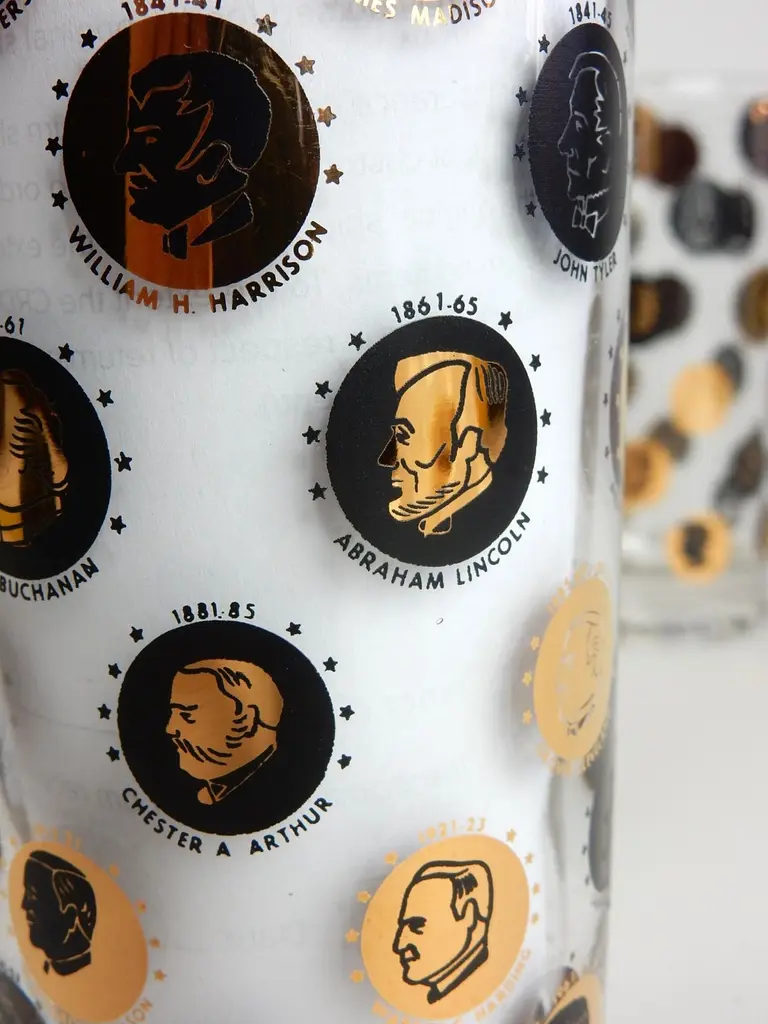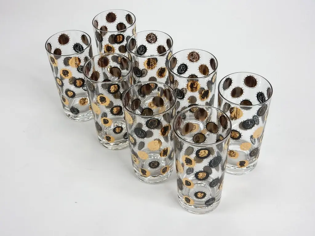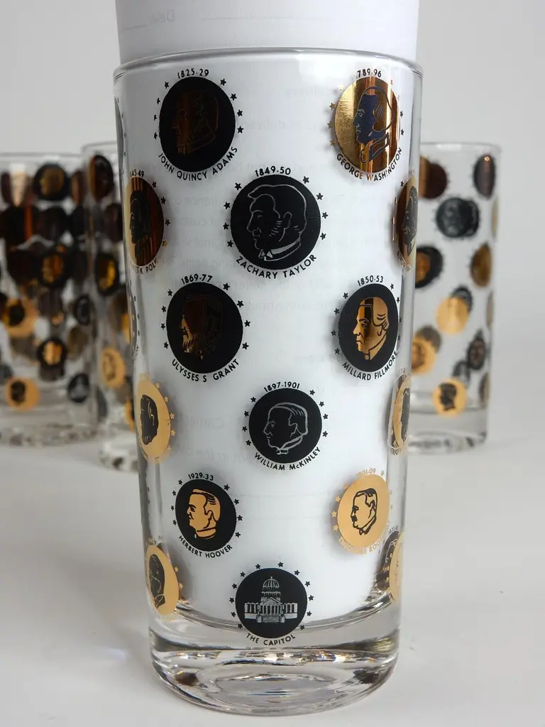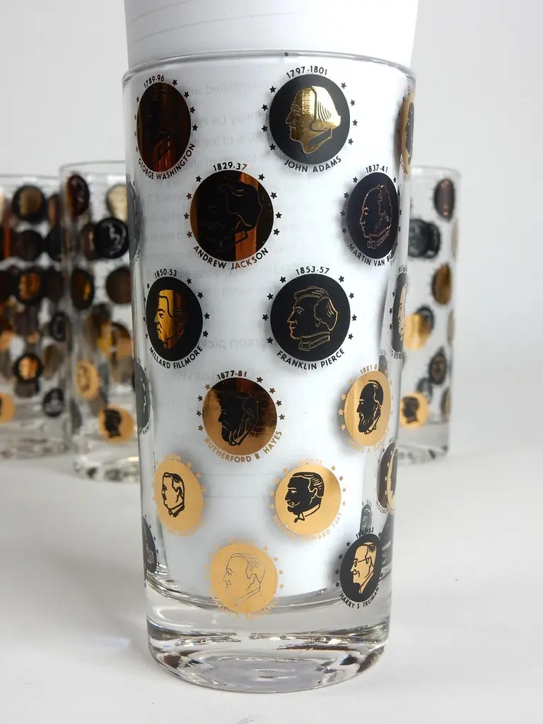 Nice clean set of 8 hi-ball bar glasses from the 1960'swith president profiles in gold and black.