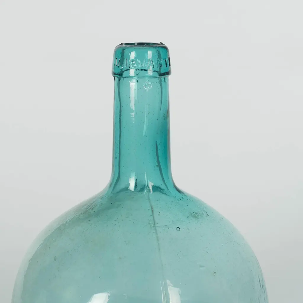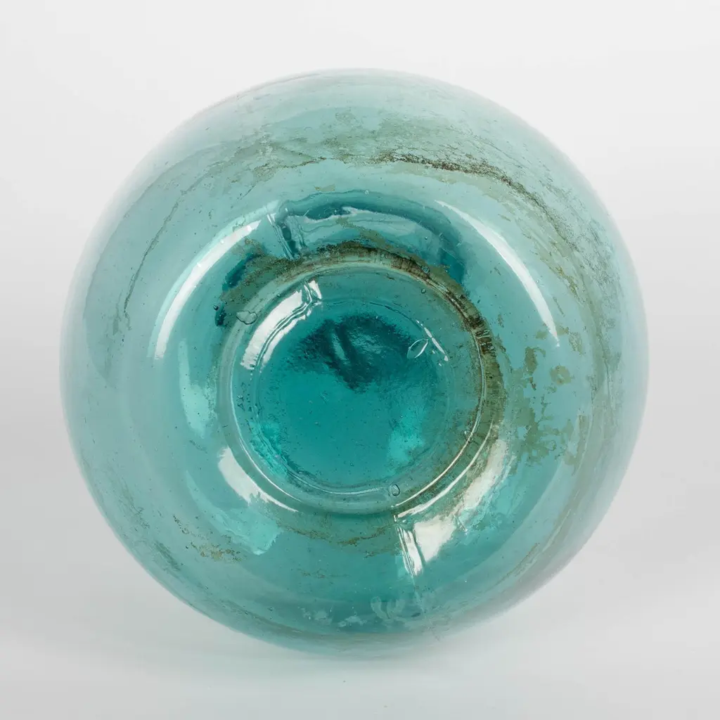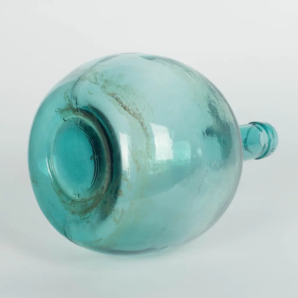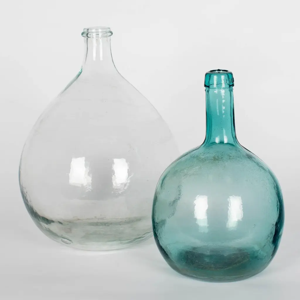 A pair of globular form hand blown glass dame Jeanne, or demijohn bottles. Clear bottle is likely French and the aqua bottle is Spanish, marked V. Levante. Perfect decorative elements for a beach house. Circa 1950sDimensions: Clear: 15"H x 10" Diameter Aqua: 12"H x 7.5" Diameter