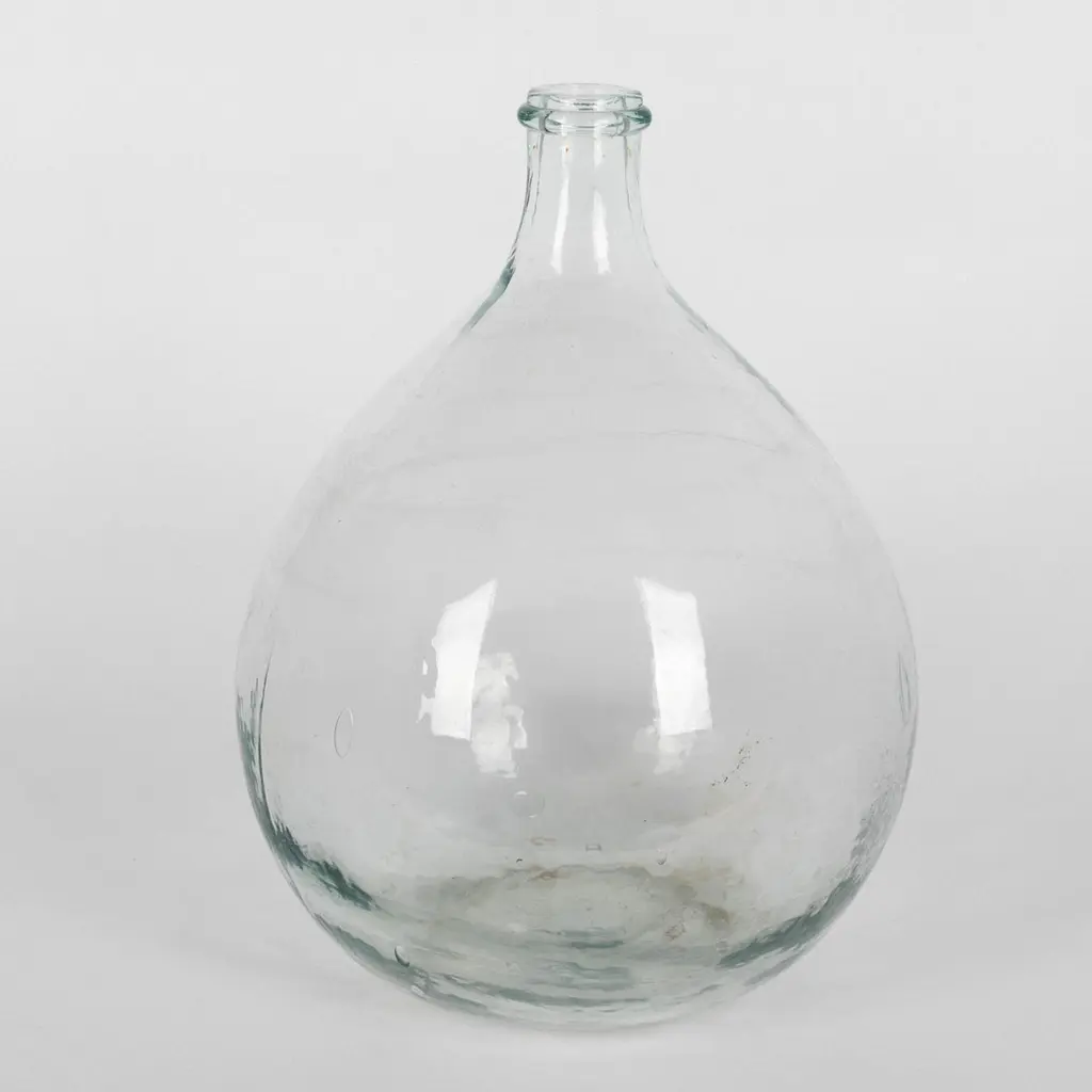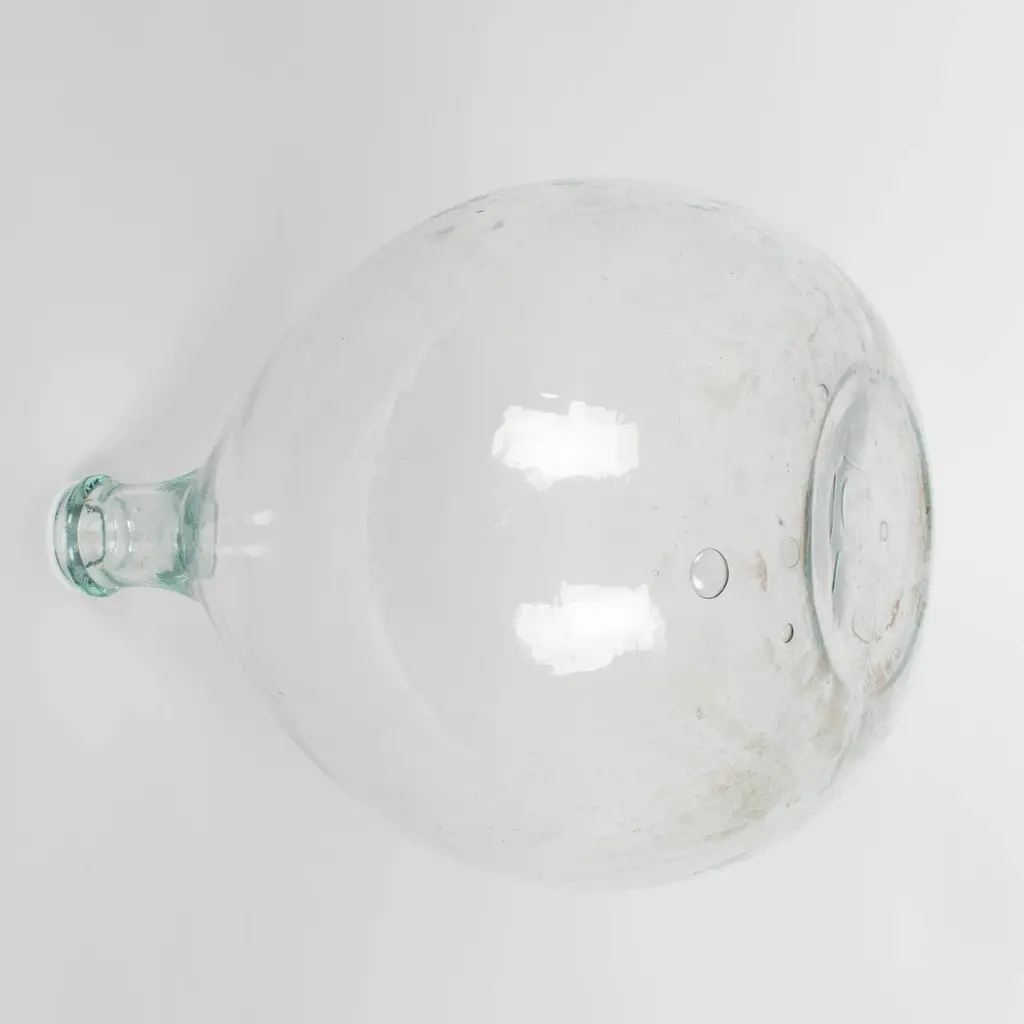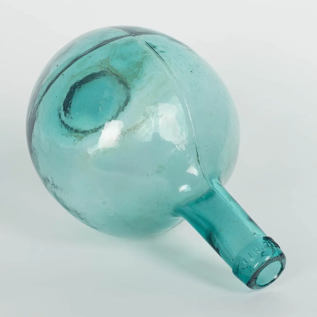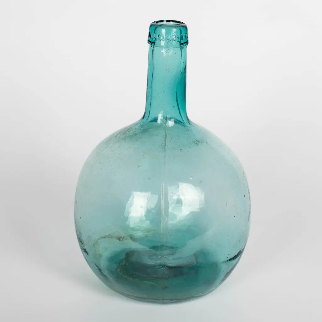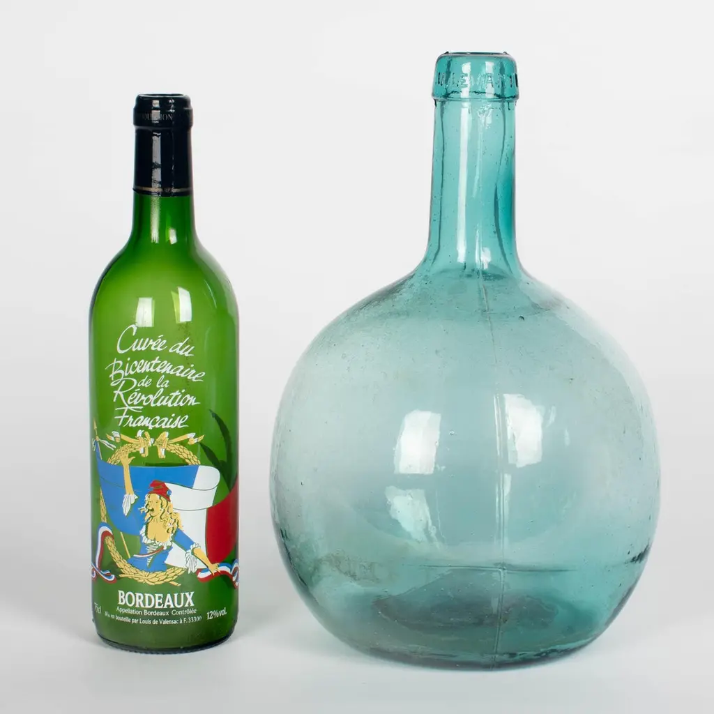 A pair of globular form hand blown glass dame Jeanne, or demijohn bottles. Clear bottle is likely French and the aqua bottle is Spanish, marked V. Levante. Perfect decorative elements for a beach house. Circa 1950sDimensions: Clear: 15"H x 10" Diameter Aqua: 12"H x 7.5" Diameter