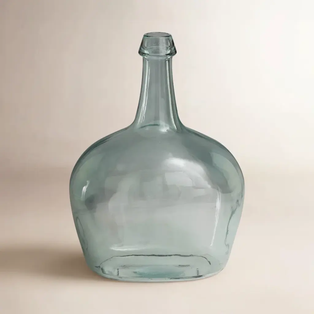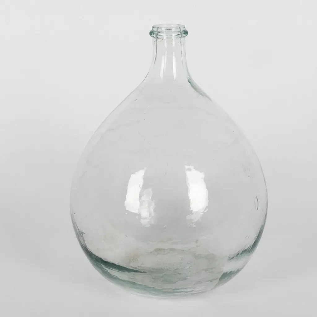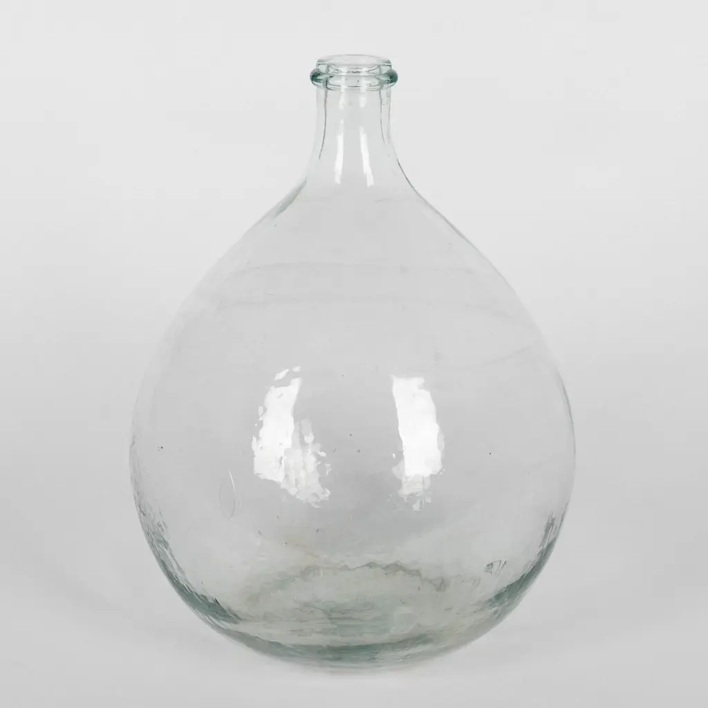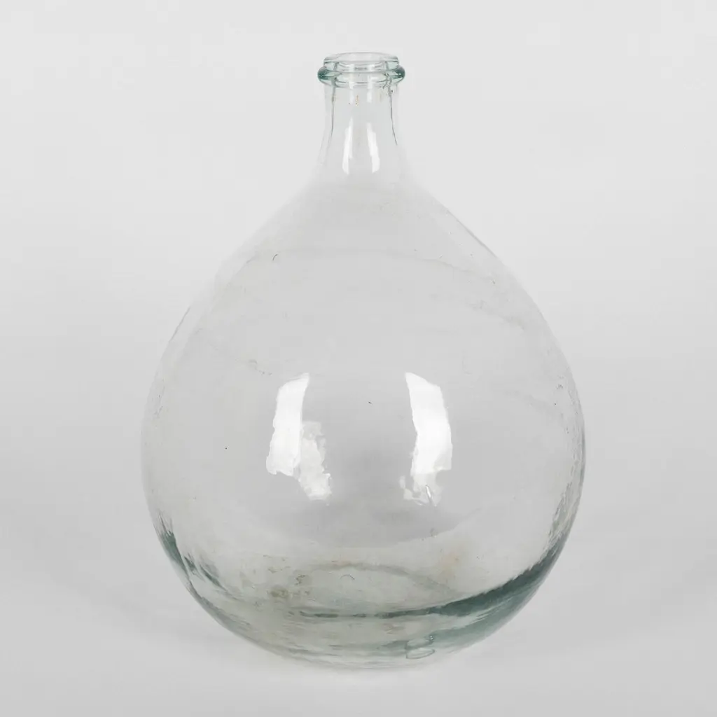 A pair of globular form hand blown glass dame Jeanne, or demijohn bottles. Clear bottle is likely French and the aqua bottle is Spanish, marked V. Levante. Perfect decorative elements for a beach house. Circa 1950sDimensions: Clear: 15"H x 10" Diameter Aqua: 12"H x 7.5" Diameter