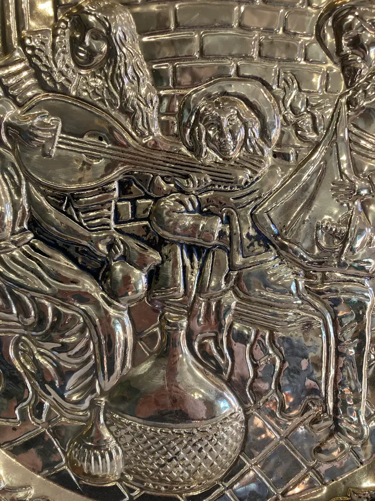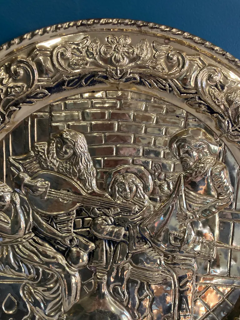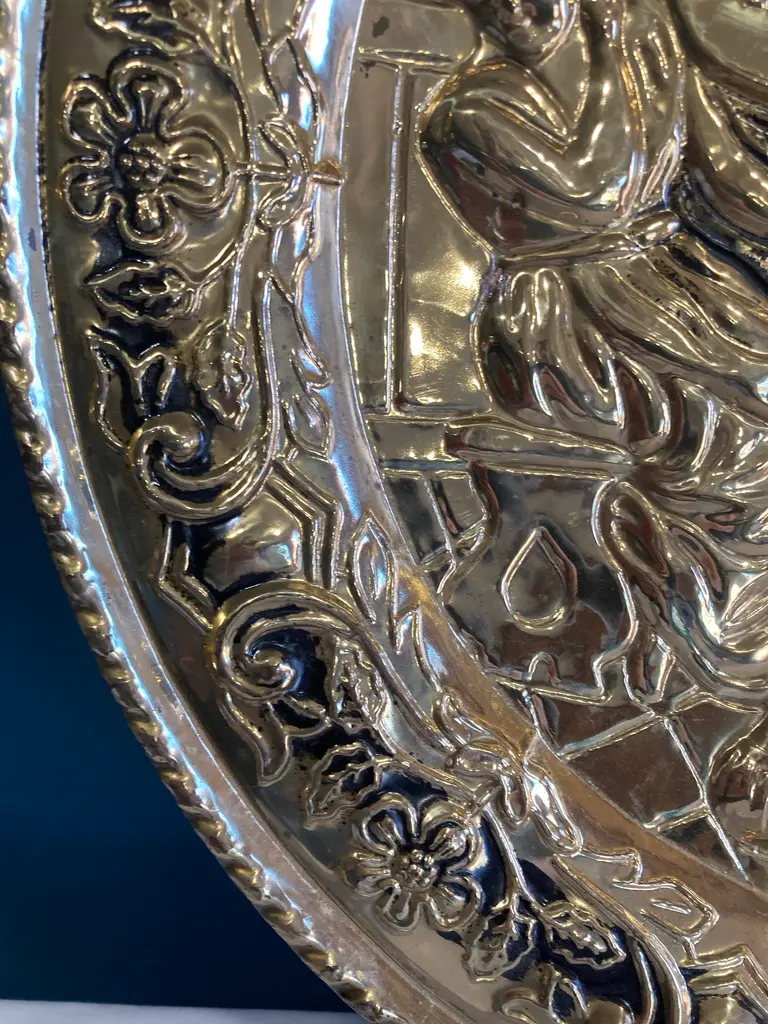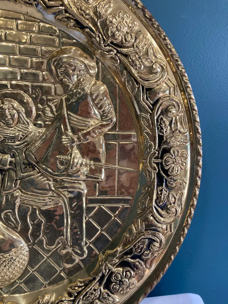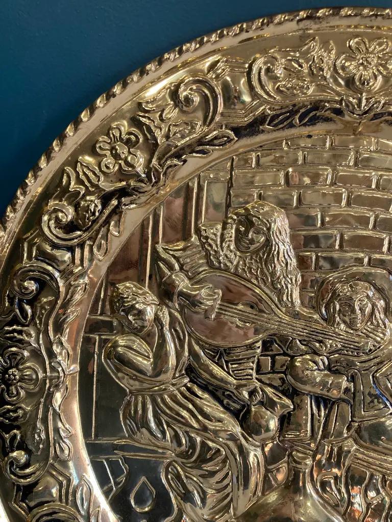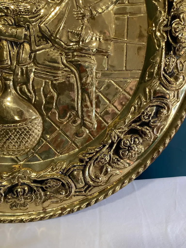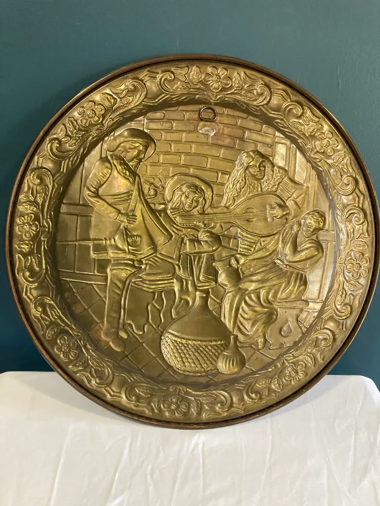 This large brass plate has an embossed pub scene with decorative border. Made in England.