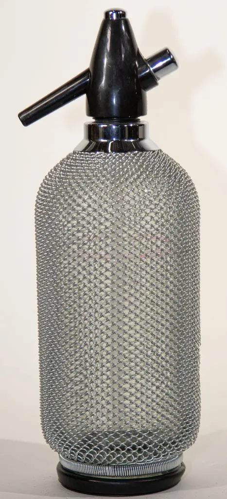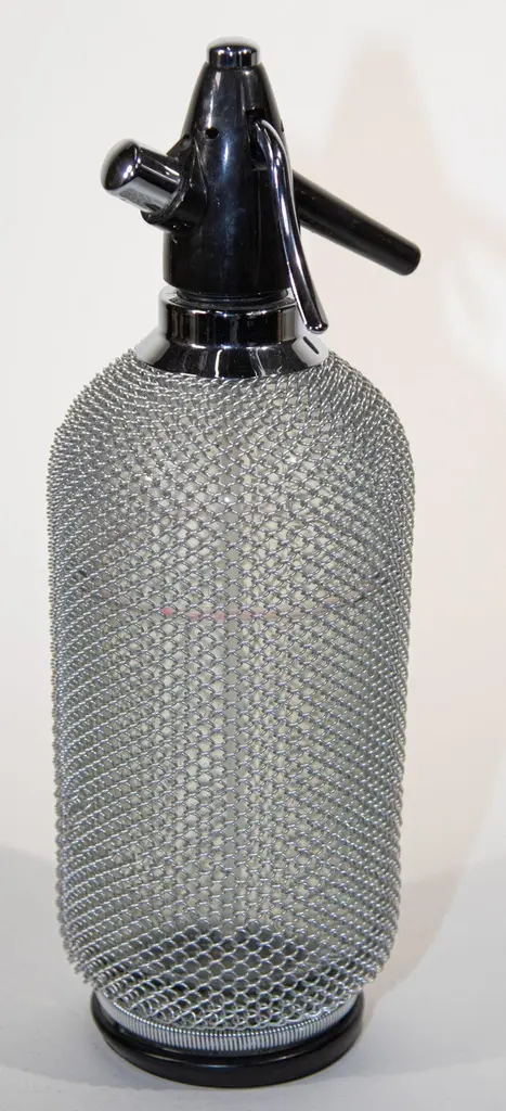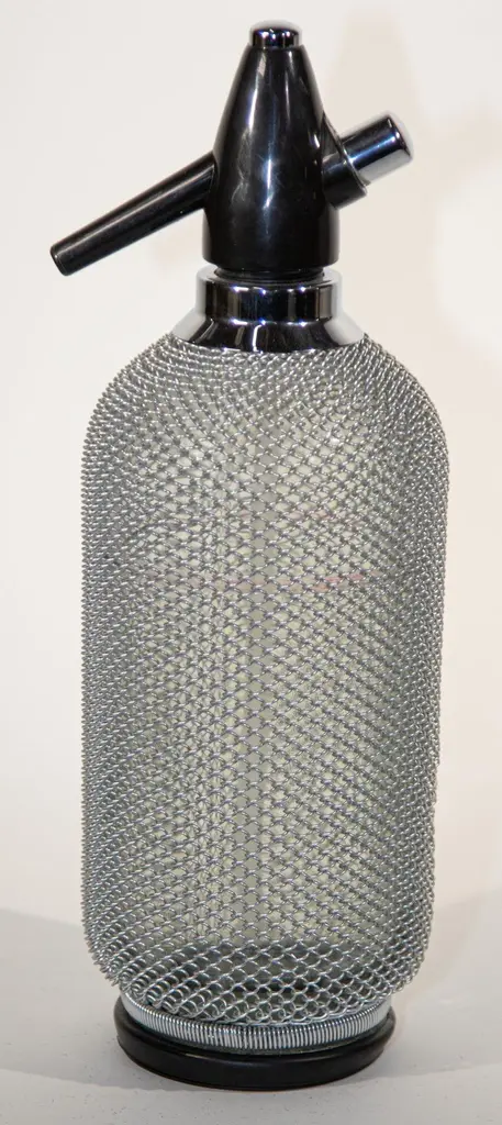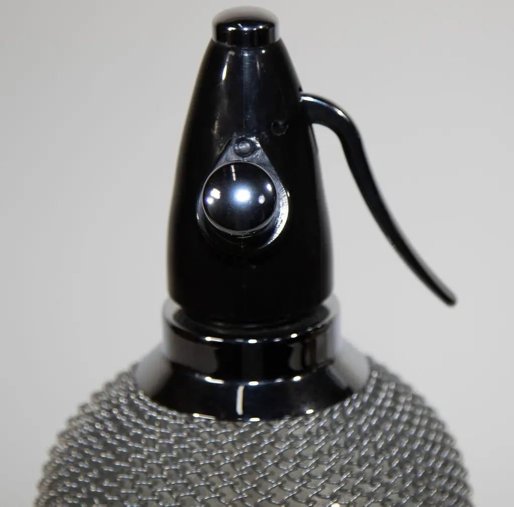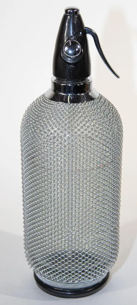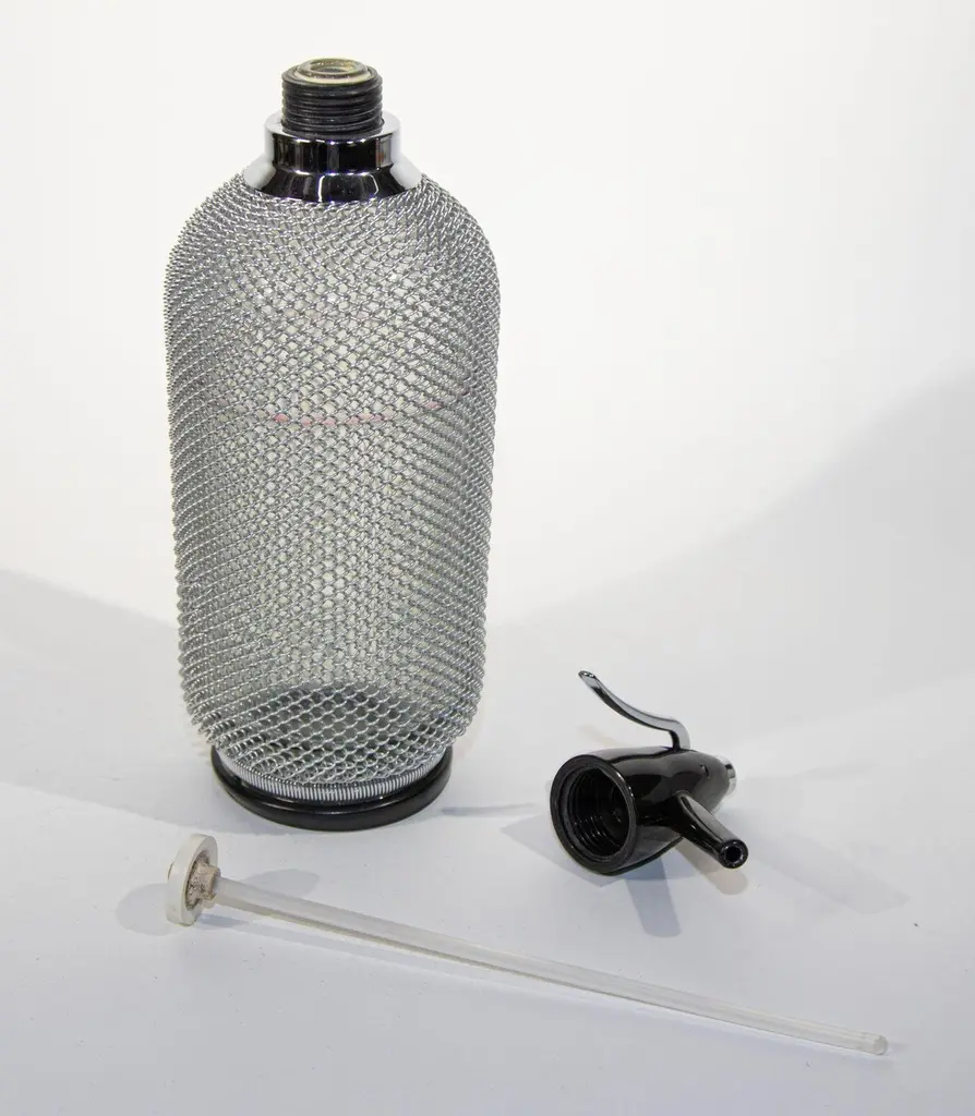 Vintage Classic Soda Siphon Seltzer Glass Bottle with Wire Mesh.This is a fantastic vintage seltzer bottle with a metal wire mesh casing around the glass.Vintage seltzer bottle made in Germany.Enjoy the fresh and healthy fizz of sparkling water, carbonated juice drinks, wine spritzers, and handcrafted cocktails.Vintage barware decor soda siphon gorgeous piece, ideal for display purposes or to use.Mid century glass Soda siphon, seltzer bottle with wire mesh decor and black bakelite top.Vintage seltzer bottle soda maker sparkling water maker seltzer maker seltzer bottle dispenser soda bottle.Measurements: Height: 14.5 inches. Diameter: 5 inches.Great condition.Glass bottle stamped at back. Circa 1970's-80sManufactured in Germany. Gorgeous bar accessory.