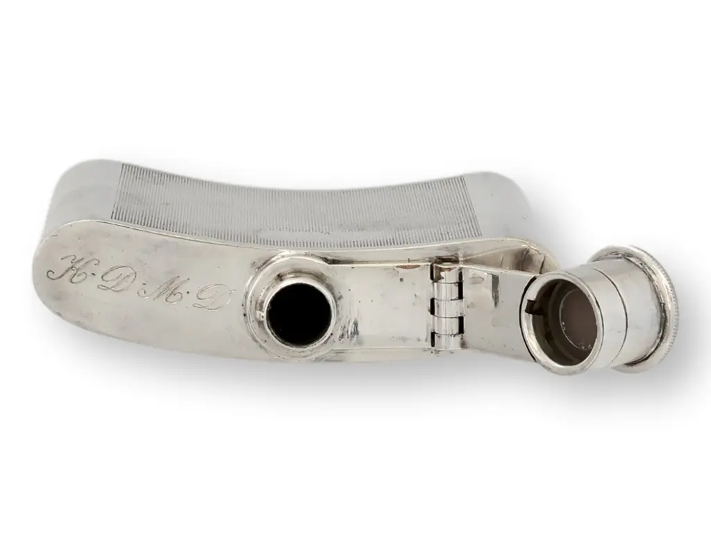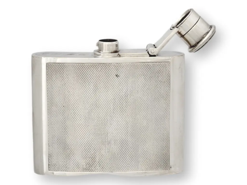 An English mid-century silverplate hip flask with classic engine-turned guilloché panels and a curved body for pocket carry. The hinged cap twists and snaps tightly shut and opens with a satisfying mechanical click������perfect for those who appreciate the refinement of a well-made object. Understated yet dashing, it's a stylish barware collectible or a gentleman’s gift with vintage flair.