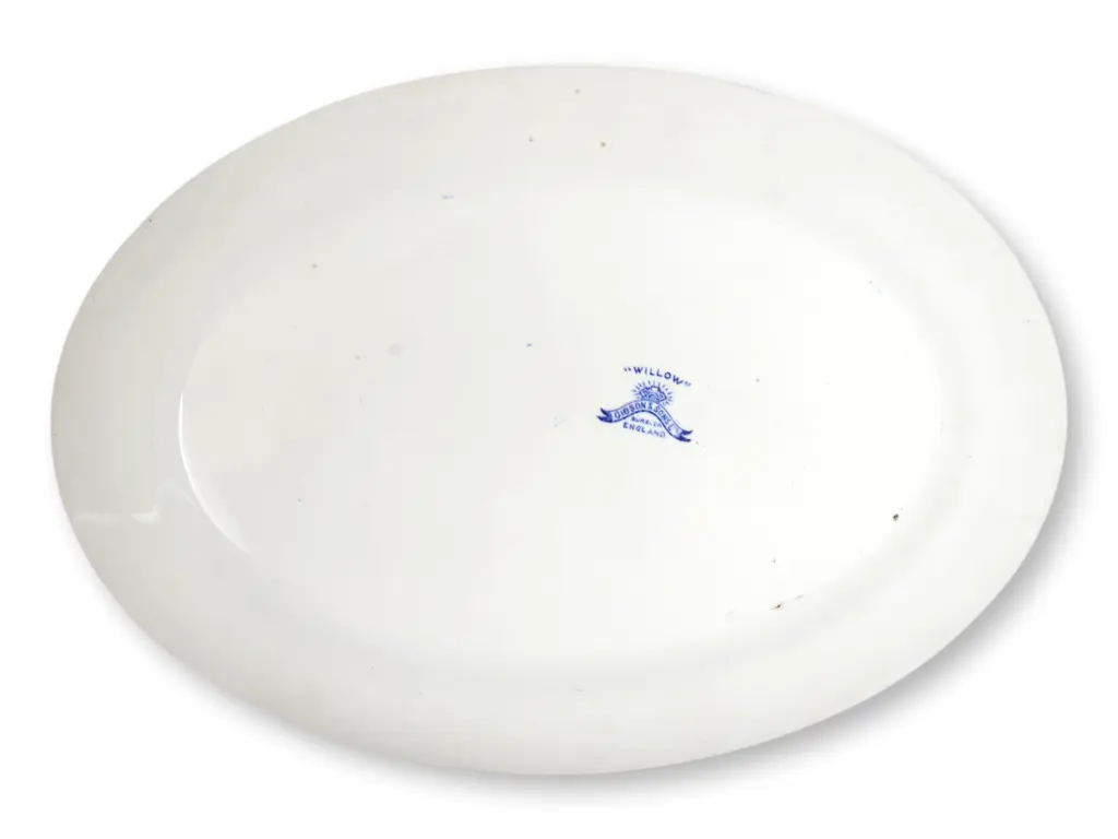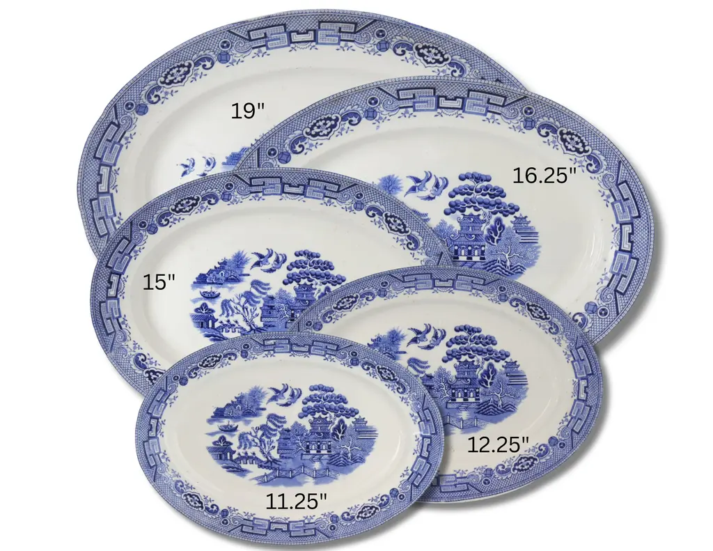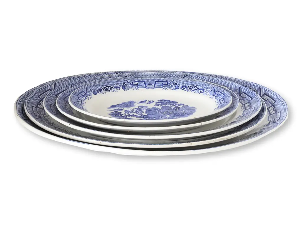 Set of five vintage English blue and white transferware platters in the classic ����Willow���� pattern by Gibson & Sons. A timeless design with pagodas, trees, and lovebirds�������������beloved for generations. Varying sizes nest beautifully for display or serving. Dimensions: ranges- small: 11.25"L x 7.75"W x 1"H med: 12.25"L x 9"W x 1.25"H large: 15"L x 11"W x 1.5"H XL: 16.75"L x 12.25"W x 1.5"H XXL: 20"L x 14"W x 1.75"H