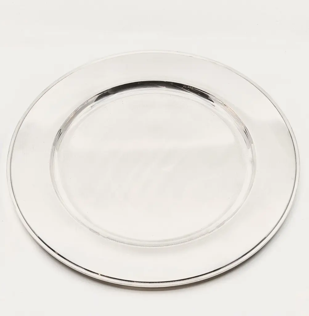 This is a sterling silver Georg Jensen serving platter in the Pyramid pattern, design #600M by Harald Nielsen from 1930.Additional information:Material: Sterling silverStyles: Art DecoHallmarks: Georg Jensen hallmarks from 1945-1977.Dimensions: Measures 15 5/8″ (40cm) in diameter.Weight: 51.85oz (1,470g).Condition: Excellent vintage condition