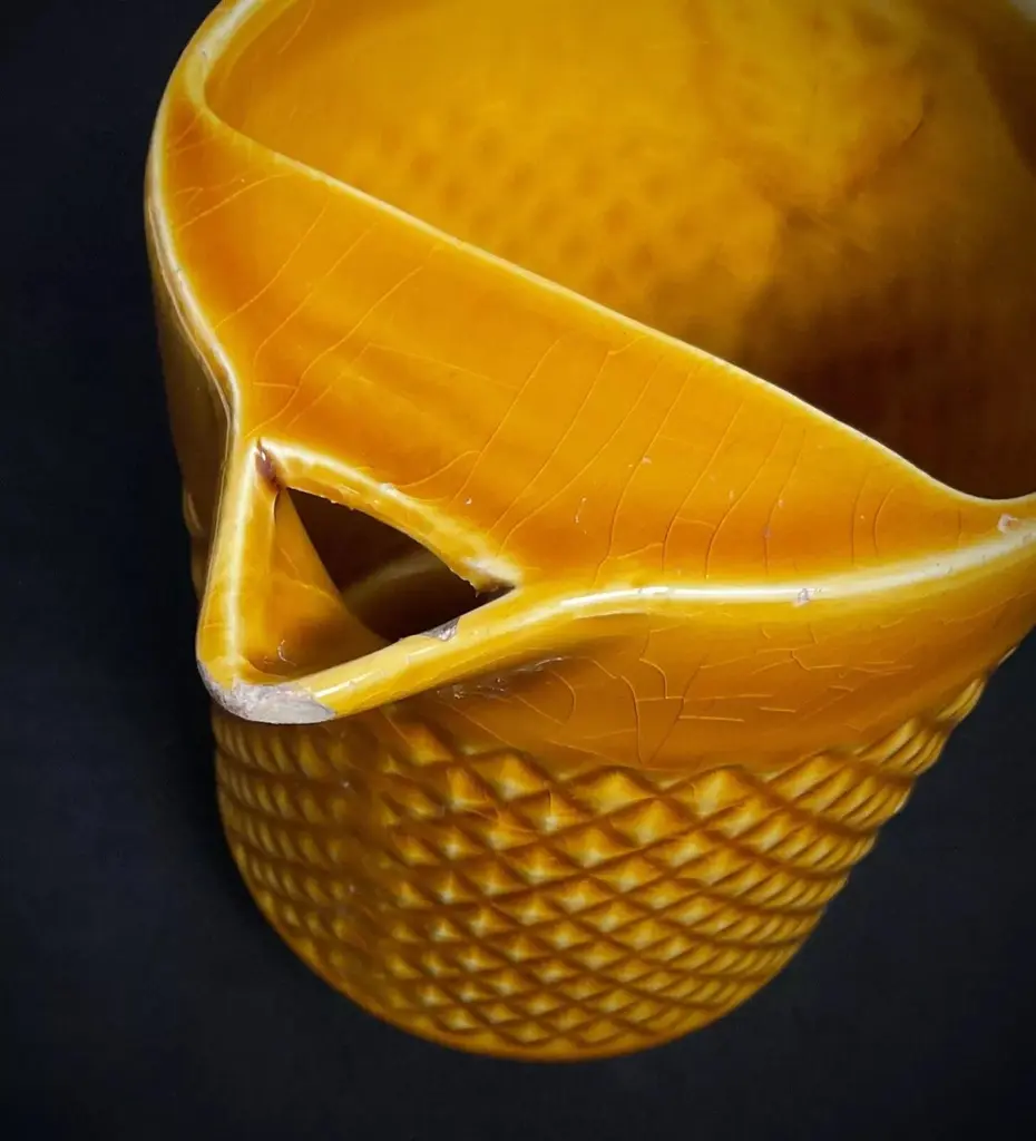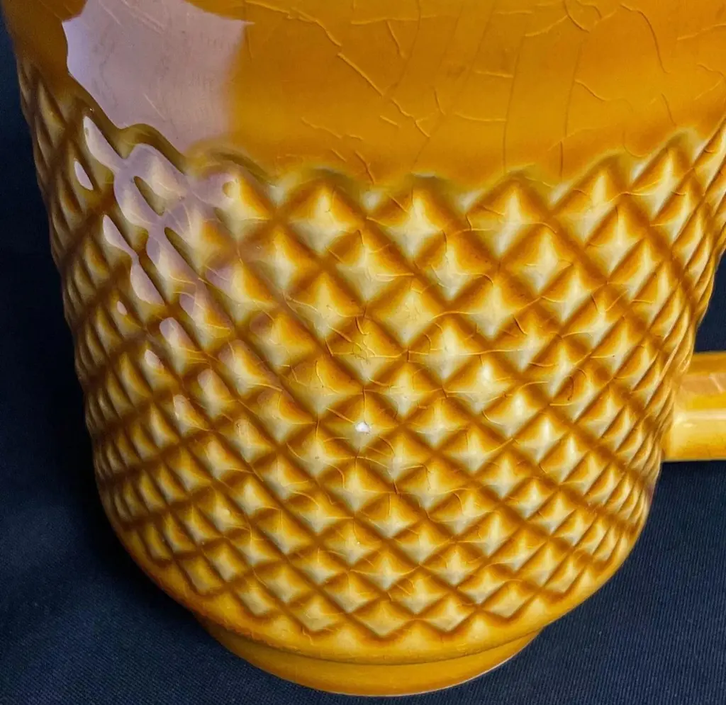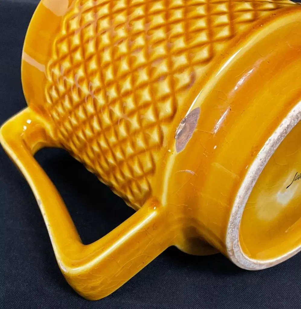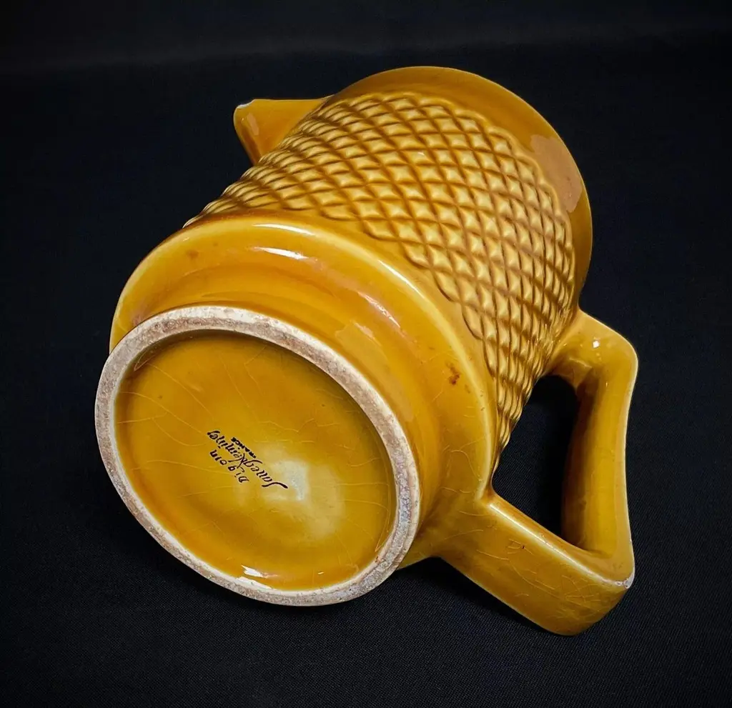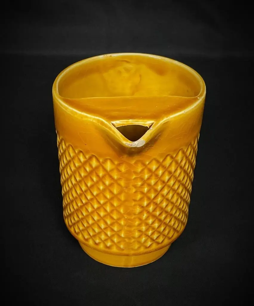 This vintage ceramic pitcher by Digoin Sarreguemines is a beautifully crafted piece that showcases traditional French ceramic artistry. Measuring 6.1 inches (15.5 cm) in height, 4.3 inches (11 cm) in diameter, and 6.5 inches (16.5 cm) in length, this elegant pitcher weighs 1.37 lbs (620 g). Its crackled glazed finish and textured diamond pattern make it a unique and timeless addition to any collection.The pitcher features a soft yellow color and an embossed diamond pattern on its body. It includes a curved handle and a spout for ease of pouring. While it remains in good overall condition, there are several small chips on the rim and spout, as noted in the photos. These imperfections add charm and authenticity to the piece, emphasizing its vintage appeal.Key features:Vintage ceramic pitcher by Digoin Sarreguemines with a crackled glazeDimensions: Height: 6.1 in (15.5 cm), Diameter: 4.3 in (11 cm), Length: 6.5 in (16.5 cm)Weight: 1.37 lbs (620 g)Condition: Good, with minor chips on the rim and spout (see photos)Material: Glazed ceramic with a crackled finishDesign: Embossed diamond pattern with a yellow glazeAuthenticity: OriginalOrigin: FranceStyle: VintageThis exquisite pitcher is perfect for collectors and enthusiasts of vintage ceramics. Its timeless design and detailed execution make it an excellent decorative piece for your dining table, kitchen, or as part of a curated collection, adding a touch of sophistication and cultural richness to any space.