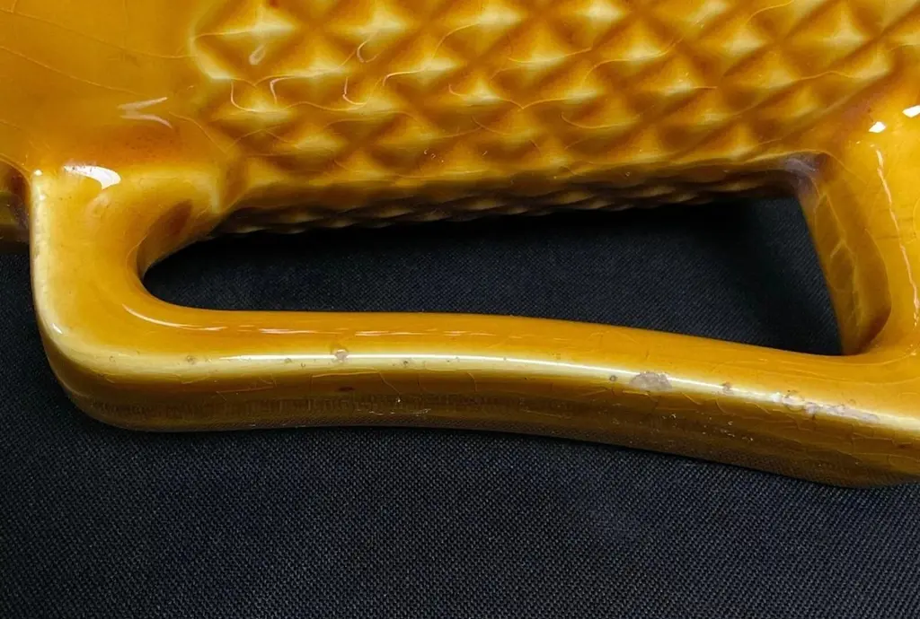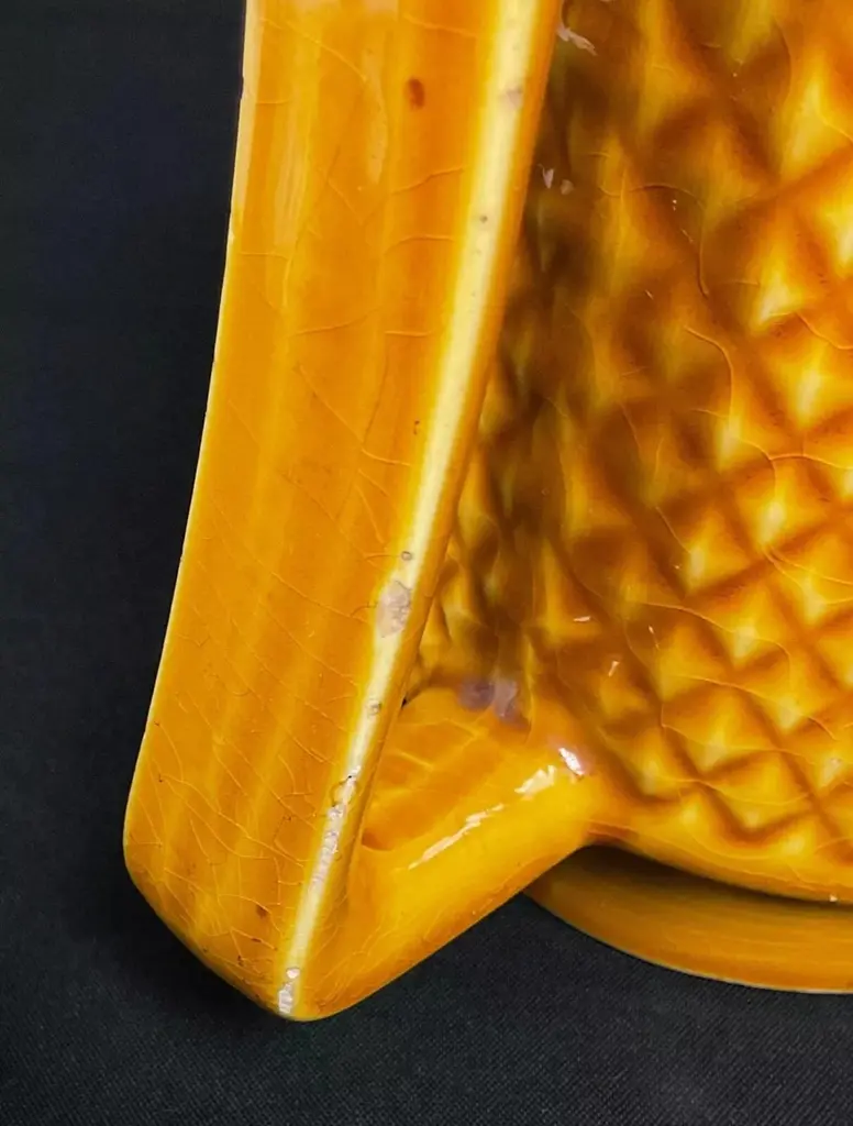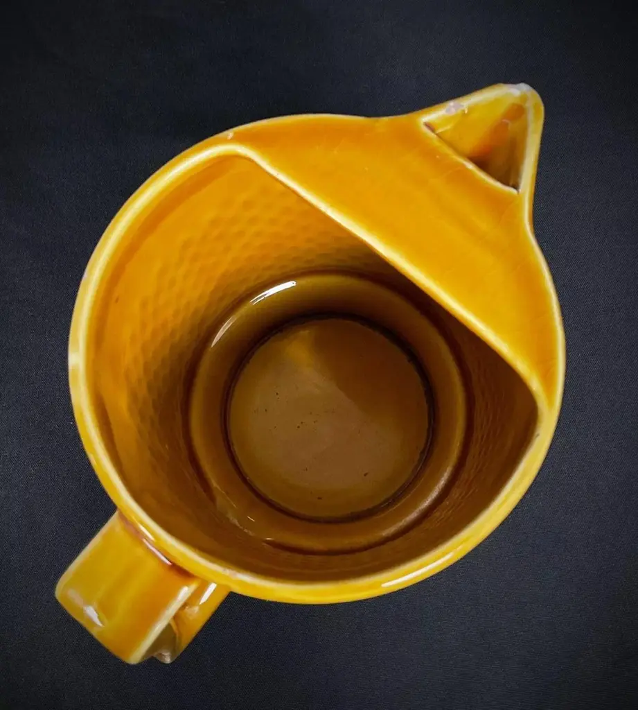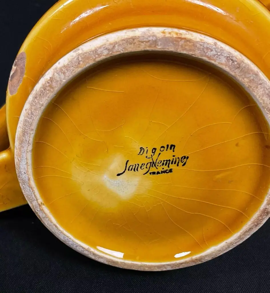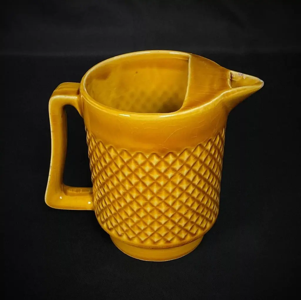 This vintage ceramic pitcher by Digoin Sarreguemines is a beautifully crafted piece that showcases traditional French ceramic artistry. Measuring 6.1 inches (15.5 cm) in height, 4.3 inches (11 cm) in diameter, and 6.5 inches (16.5 cm) in length, this elegant pitcher weighs 1.37 lbs (620 g). Its crackled glazed finish and textured diamond pattern make it a unique and timeless addition to any collection.The pitcher features a soft yellow color and an embossed diamond pattern on its body. It includes a curved handle and a spout for ease of pouring. While it remains in good overall condition, there are several small chips on the rim and spout, as noted in the photos. These imperfections add charm and authenticity to the piece, emphasizing its vintage appeal.Key features:Vintage ceramic pitcher by Digoin Sarreguemines with a crackled glazeDimensions: Height: 6.1 in (15.5 cm), Diameter: 4.3 in (11 cm), Length: 6.5 in (16.5 cm)Weight: 1.37 lbs (620 g)Condition: Good, with minor chips on the rim and spout (see photos)Material: Glazed ceramic with a crackled finishDesign: Embossed diamond pattern with a yellow glazeAuthenticity: OriginalOrigin: FranceStyle: VintageThis exquisite pitcher is perfect for collectors and enthusiasts of vintage ceramics. Its timeless design and detailed execution make it an excellent decorative piece for your dining table, kitchen, or as part of a curated collection, adding a touch of sophistication and cultural richness to any space.