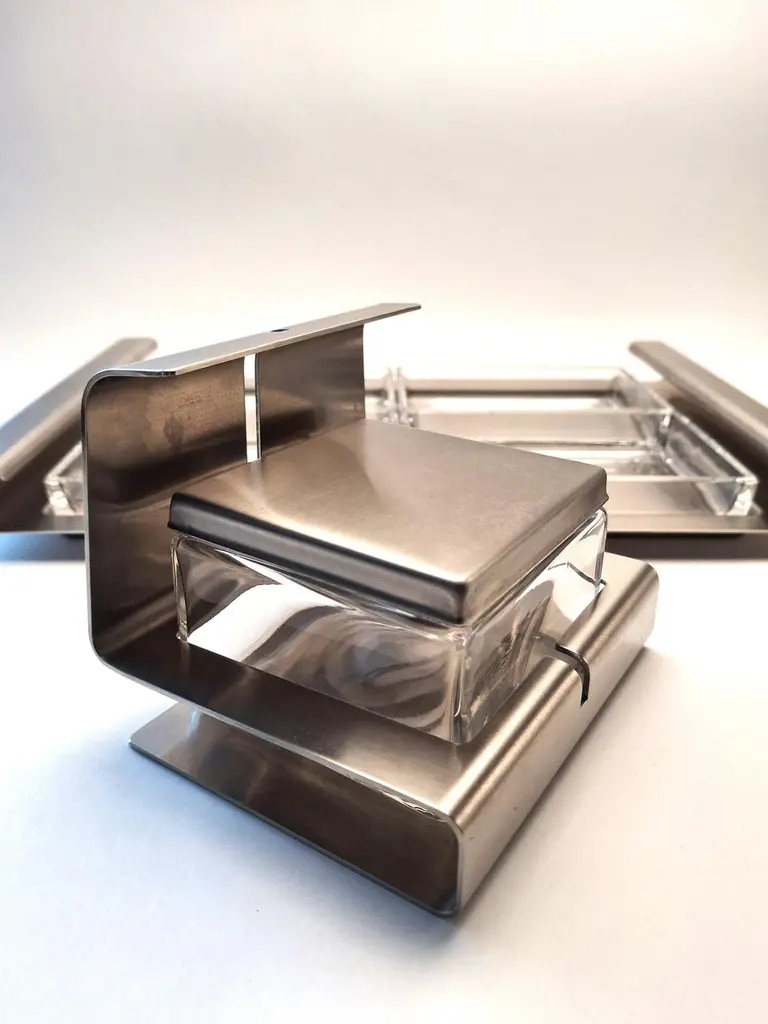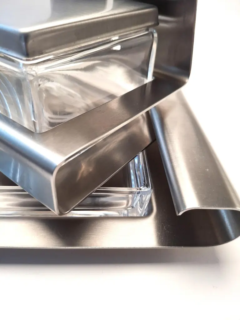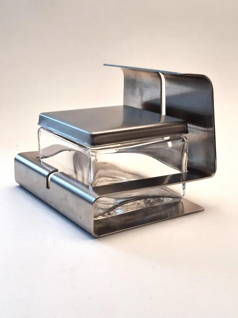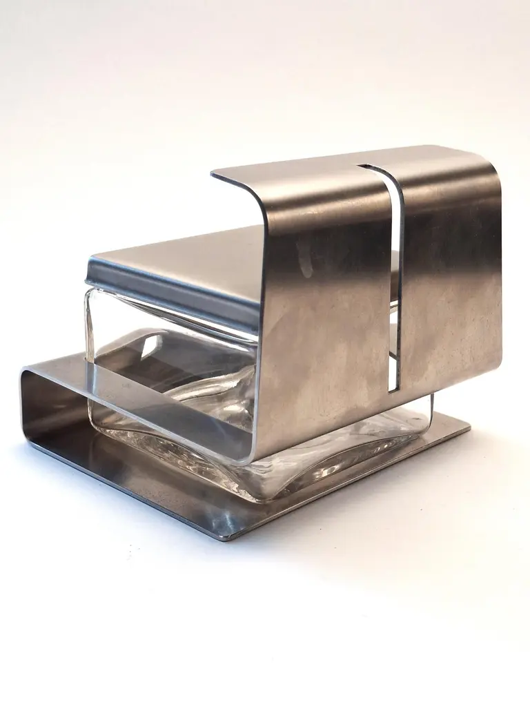This stunning vintage set includes a sleek stainless steel tray, four rectangular crystal glass serving plates, and a stylish Parmesan container. Designed in Italy in the 1980s by the renowned Zani Bonomi Group for Facix, it combines timeless elegance with modern design, perfect for any dining table.Crafted from durable stainless steel and high-quality crystal, this set is not only functional but also a beautiful table centerpiece. Serve appetizers, snacks, or cheese in style and impress your guests with this sophisticated touch.The set is in excellent vintage condition, with minimal signs of use. It will be carefully packaged to ensure it arrives safely at your door.What’s included:1 Stainless steel tray (35 cm x 22.5 cm x 4 cm)4 Crystal glass plates (10 cm x 12 cm)1 Parmesan container with stainless steel detail (13.5 cm x 9 cm)Bring elegance and Italian craftsmanship to your home!