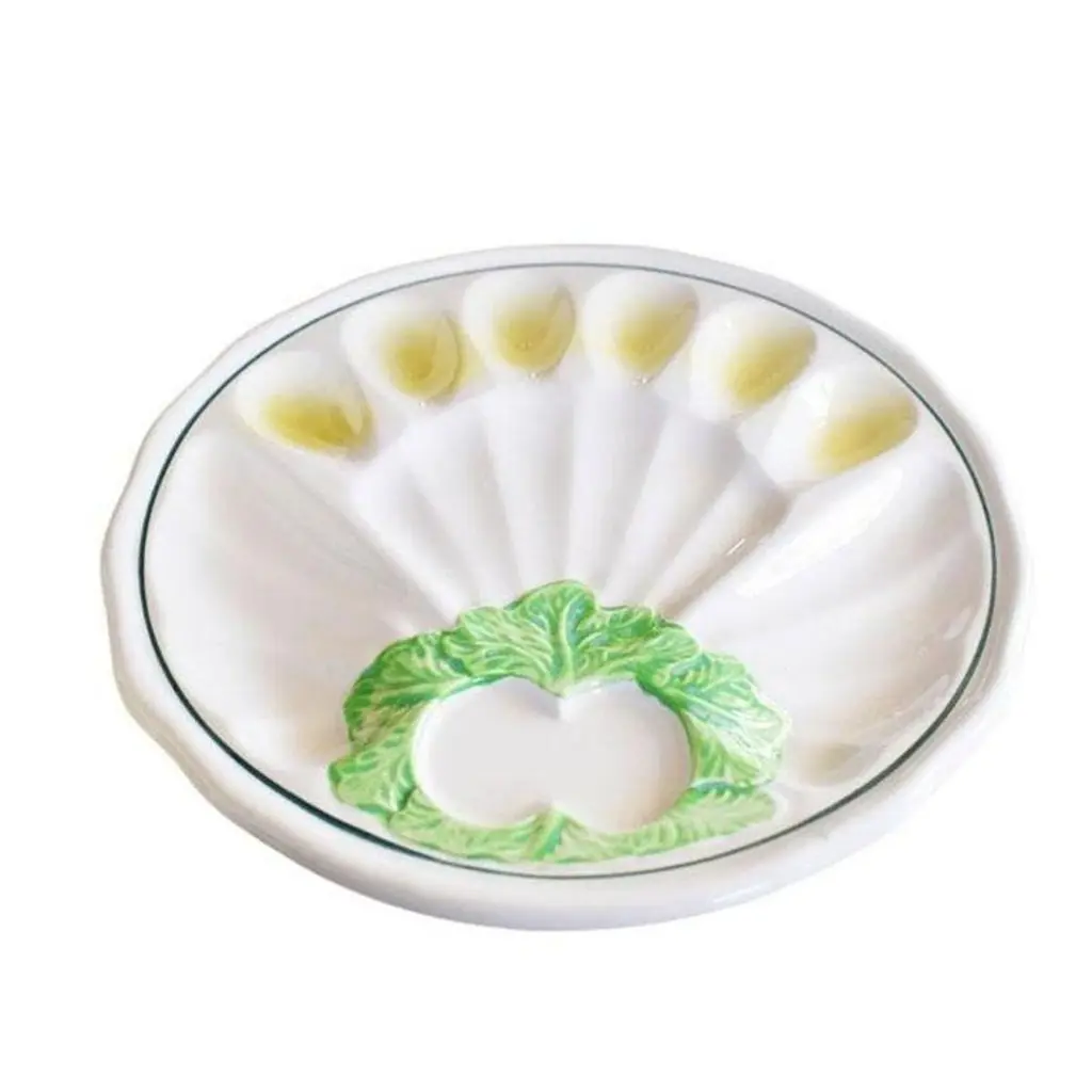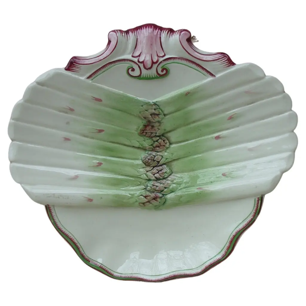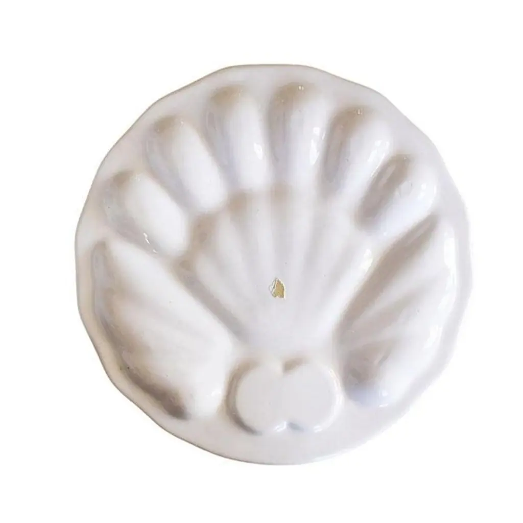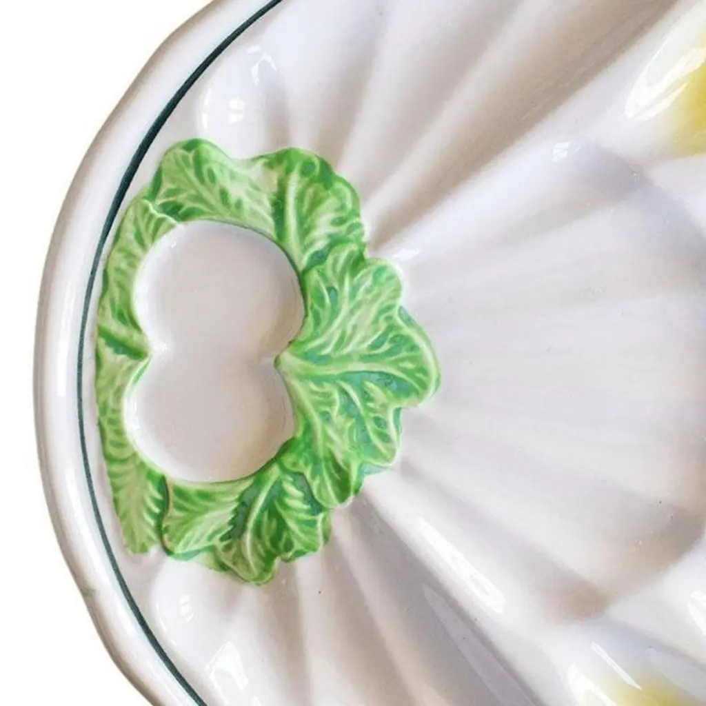 This exquisite vintage majolica oyster plate showcases timeless elegance and intricate craftsmanship. Featuring a scalloped edge design, the plate is adorned with delicate green leafy details and soft yellow highlights that create a visually stunning contrast. The center showcases a charming motif of stylized lettuce leaves and shells, enhancing its seaside-inspired aesthetic. Perfect as a statement piece for coastal or garden-themed table settings, it offers both functionality and decorative appeal.Styling Ideas:Display this egg or oyster plate as a centerpiece on a dining table (Perhaps for Easter) or pair it with a set of complementary majolica ceramics for a curated look. It also works beautifully in a coastal-inspired kitchen, mounted on a wall, or within a curated china cabinet.Dimensions:10.25" Diameter.75" TallDimensions:10.25" Diameter.75" Tall