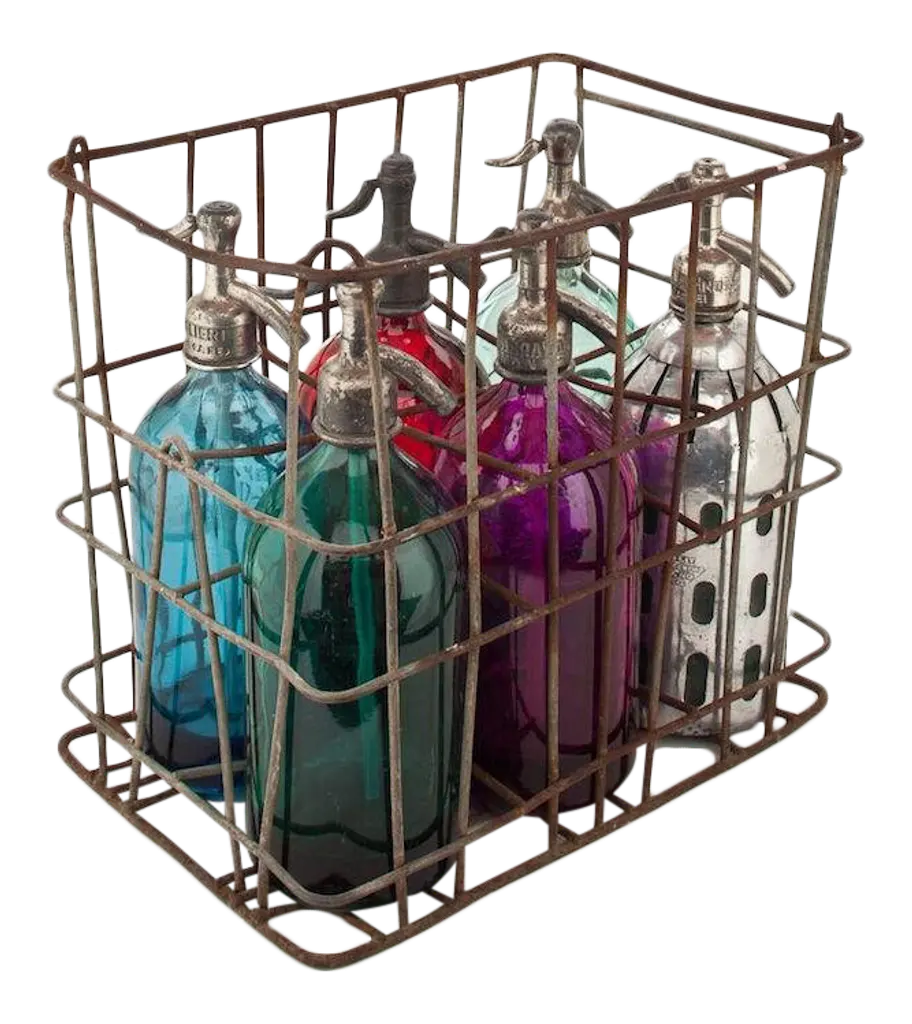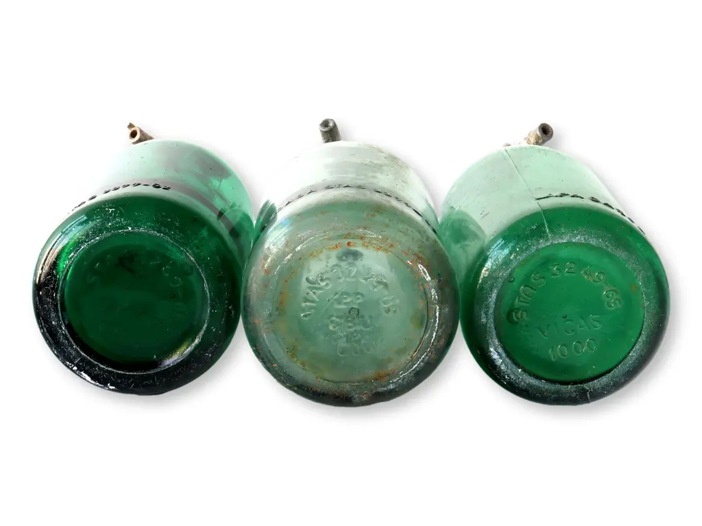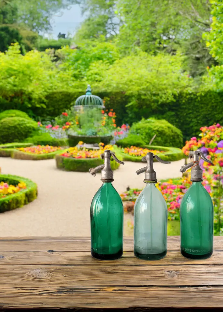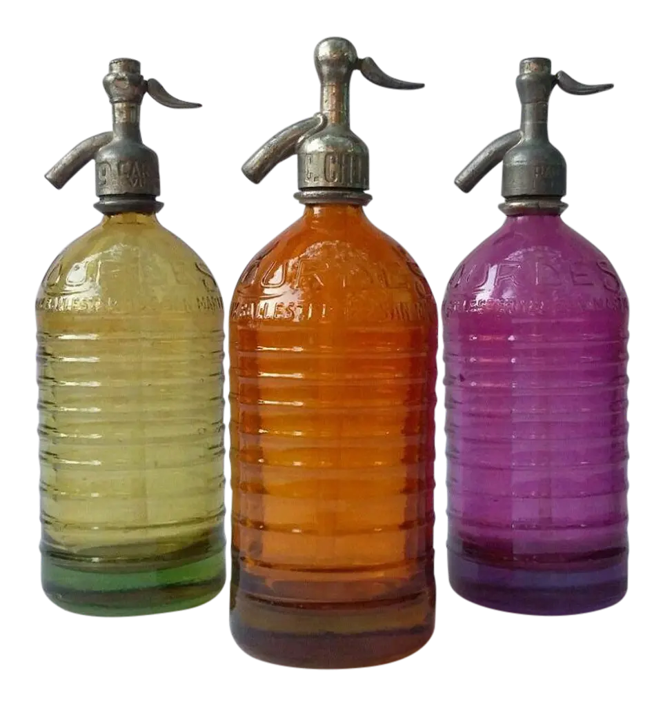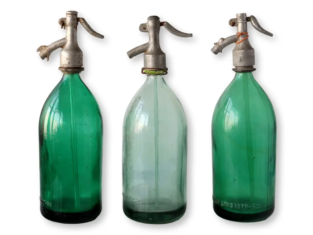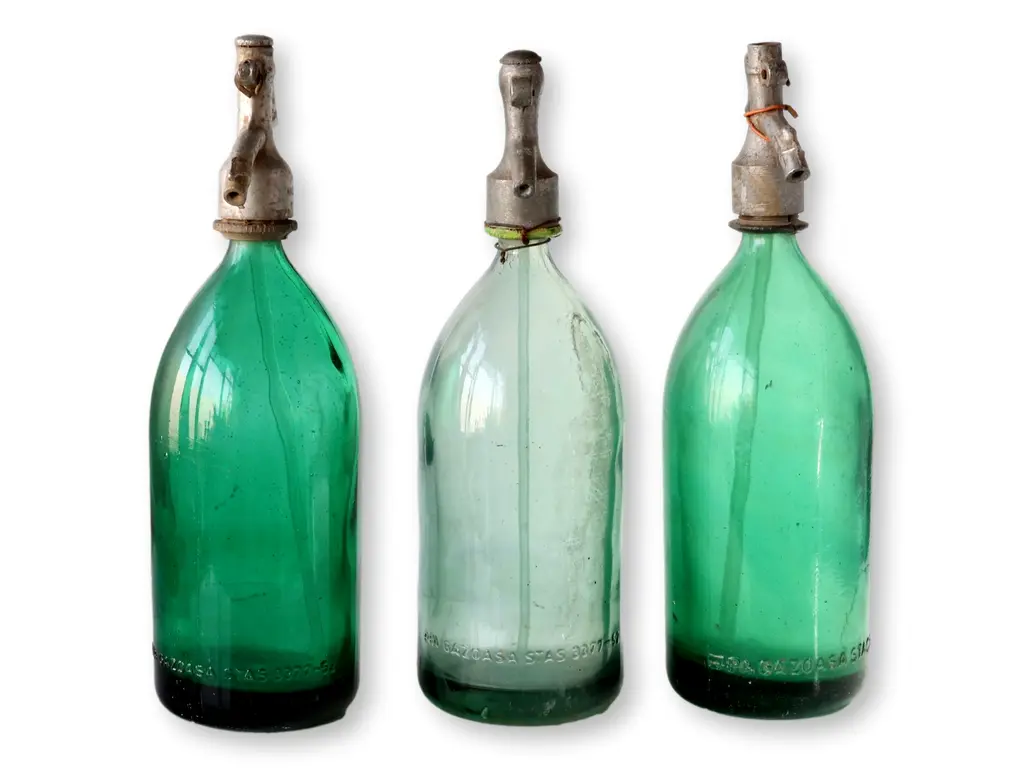 Set of three vintage Spanish seltzer bottles, each made from thick green or clear blown glass with original metal siphon tops. Molded marks on the bases read “Vicas,” with production numbers dating them to the 1960s. Once used to dispense carbonated water, these siphons are now coveted as sculptural accents on bar carts, kitchen shelves, or industrial-style d��cor. Wear, residue, and patina to metal and glass are consistent with their utilitarian past����just as they should be.
