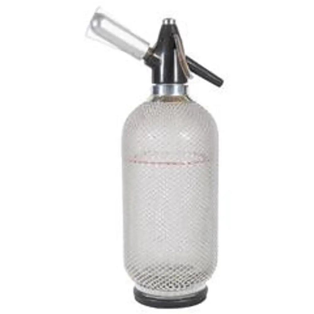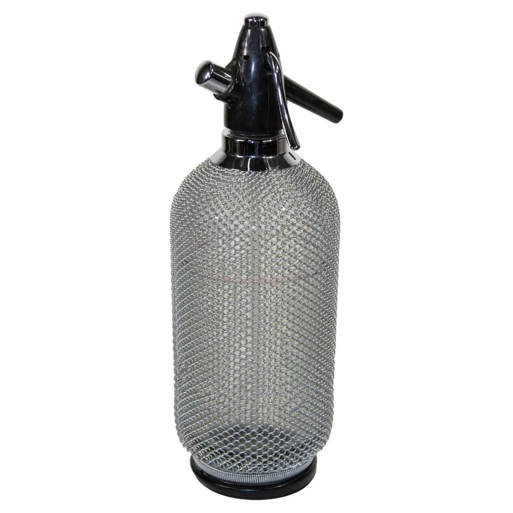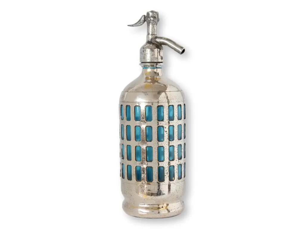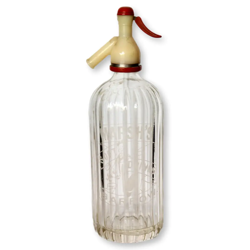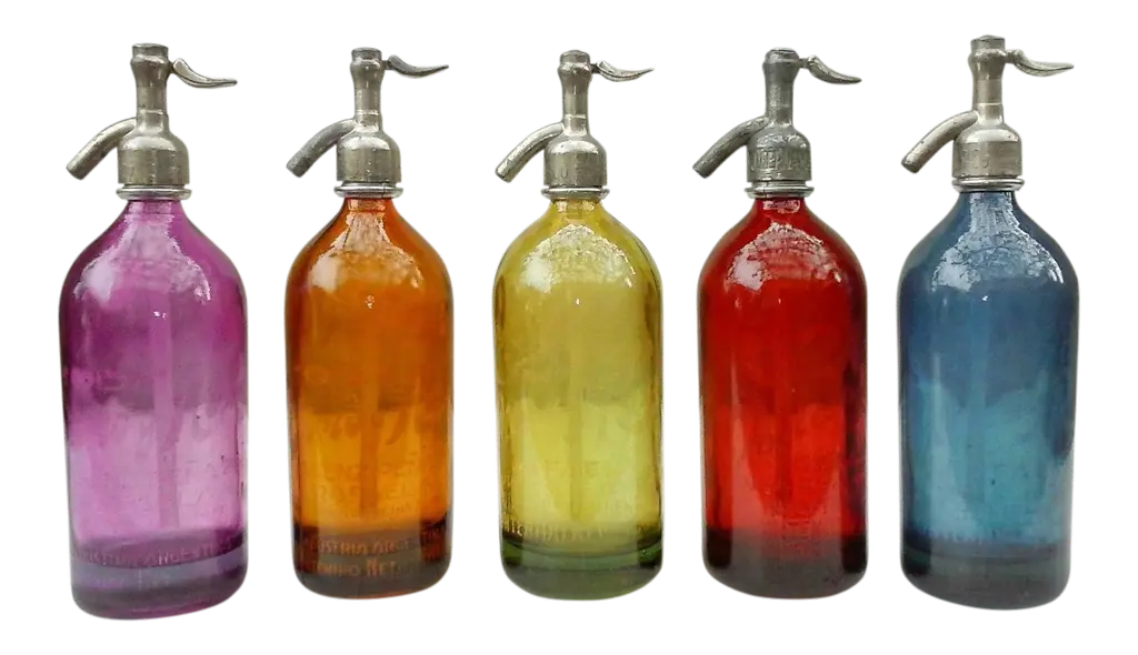 Set of three vintage Spanish seltzer bottles, each made from thick green or clear blown glass with original metal siphon tops. Molded marks on the bases read “Vicas,” with production numbers dating them to the 1960s. Once used to dispense carbonated water, these siphons are now coveted as sculptural accents on bar carts, kitchen shelves, or industrial-style d��cor. Wear, residue, and patina to metal and glass are consistent with their utilitarian past����just as they should be.