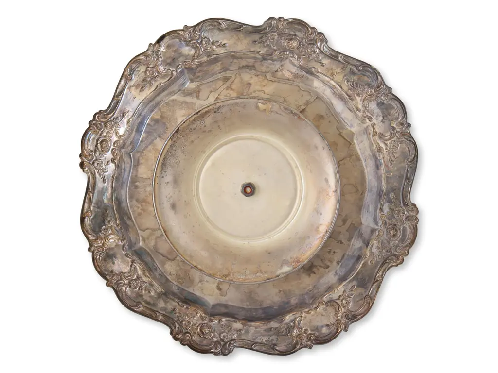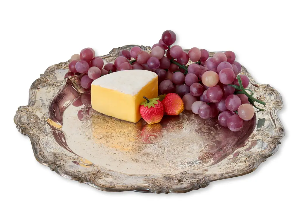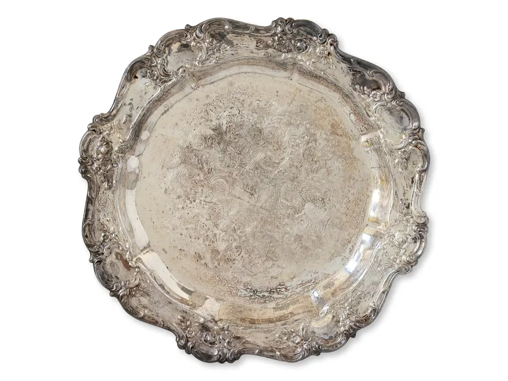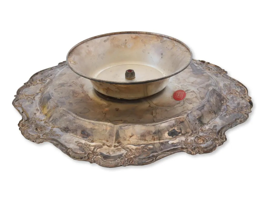 Vintage silver-plate lazy Susan dish, bearing a rich patina accrued over years, offering an authentic charm that simply can't be replicated. While its aged appearance adds a layer of history and character, those looking for a more gleaming presentation could opt to polish it. A timeless piece that effortlessly merges function with storied elegance Would be perfect for a grand layer cake!