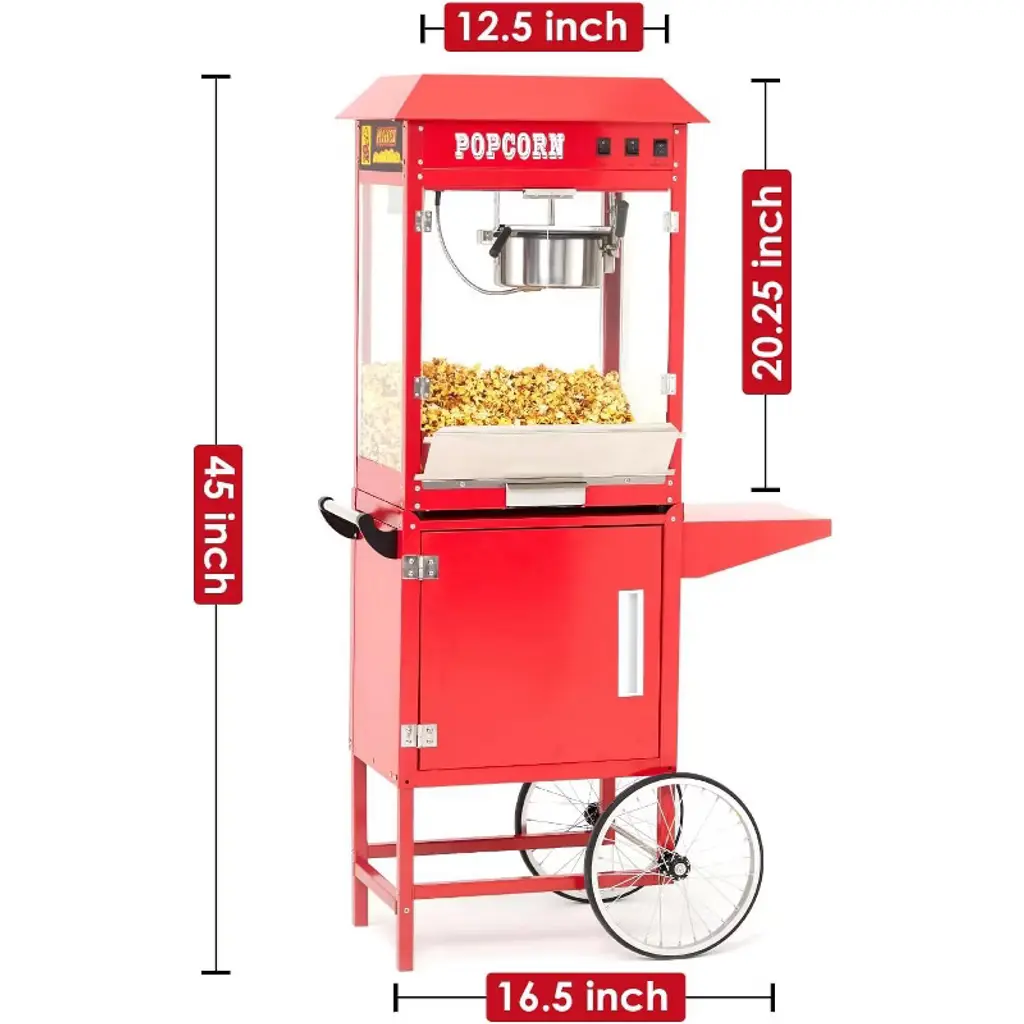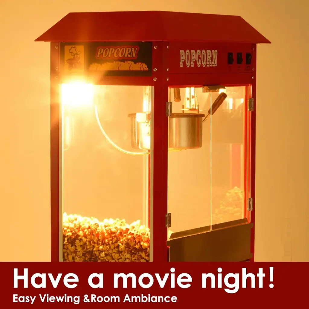 Bring the nostalgic movie theater experience home or to your event with this Vintage Style Commercial Popcorn Machine with Cart. Powered by an 850W heating element and featuring a large 10 oz kettle, it can produce up to 64 cups of fresh popcorn per batch in just 3 minutes. The machine is built with high-quality tempered glass and sturdy materials for durability and frequent use. Its easy-to-use control panel includes Warm, Stir, and Pot Heat switches, while the 60W warming deck keeps popcorn fresh and warm until serving. Equipped with a convenient cart, this popcorn maker is perfect for carnivals, amusement parks, parties, or any large gathering. Cleaning is simple thanks to the removable crumb tray and hinged cover below the warming deck for easy popcorn access. Quick Production: 850W heating device pops fresh delicious popcorn in as little as 3 minutes, ensuring fast service at your events. Large 10 oz Kettle Capacity: Produces up to 64 cups of popcorn per batch, perfect for serving large crowds efficiently. Durable Upgraded Glass & Construction: Made with premium tempered glass and robust materials, designed to withstand frequent use without compromising reliability. Simple Operation: Three easy-to-use switches control Warm, Stir, and Pot Heat functions, making it simple for any user to operate efficiently. Warming Deck: The 60W heating tube keeps popped popcorn warm and fresh on the serving deck until ready to serve. Easy Cleaning: Hinged cover below the warming deck allows easy access to popcorn, and the removable crumb tray simplifies cleanup by catching debris. Specifications: Kettle Size: 10 oz Popcorn Output: Up to 64 cups per batch Power: 850W heating element, 60W warming deck Material: Tempered glass, sturdy metal frame Color: Red Includes: Mobile cart with storage shelf Package Includes: 1 × Popcorn Machine with 10oz Kettle and Cart Customer Support: Available for product inquiries and assistance