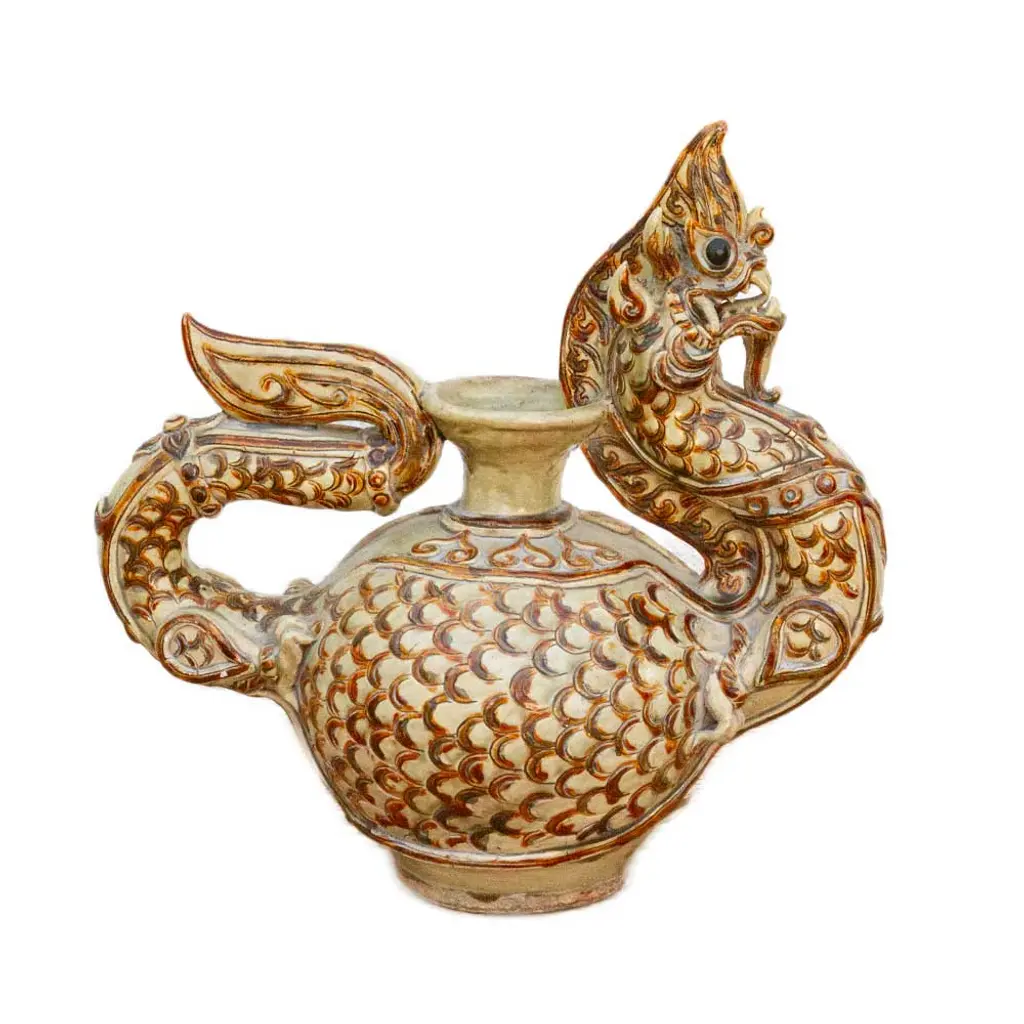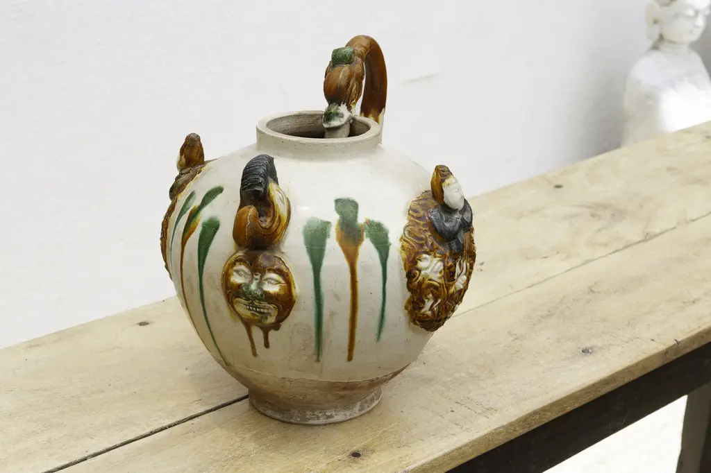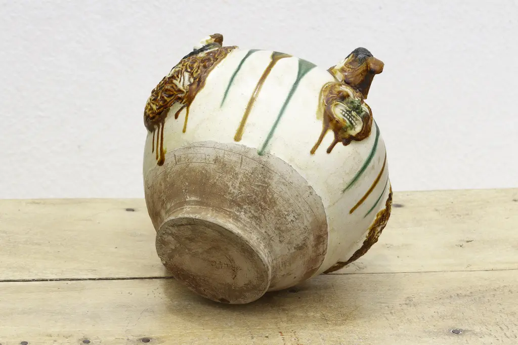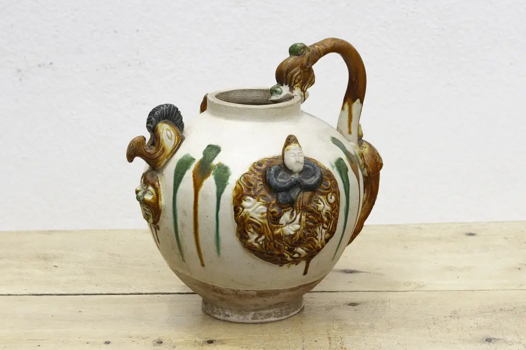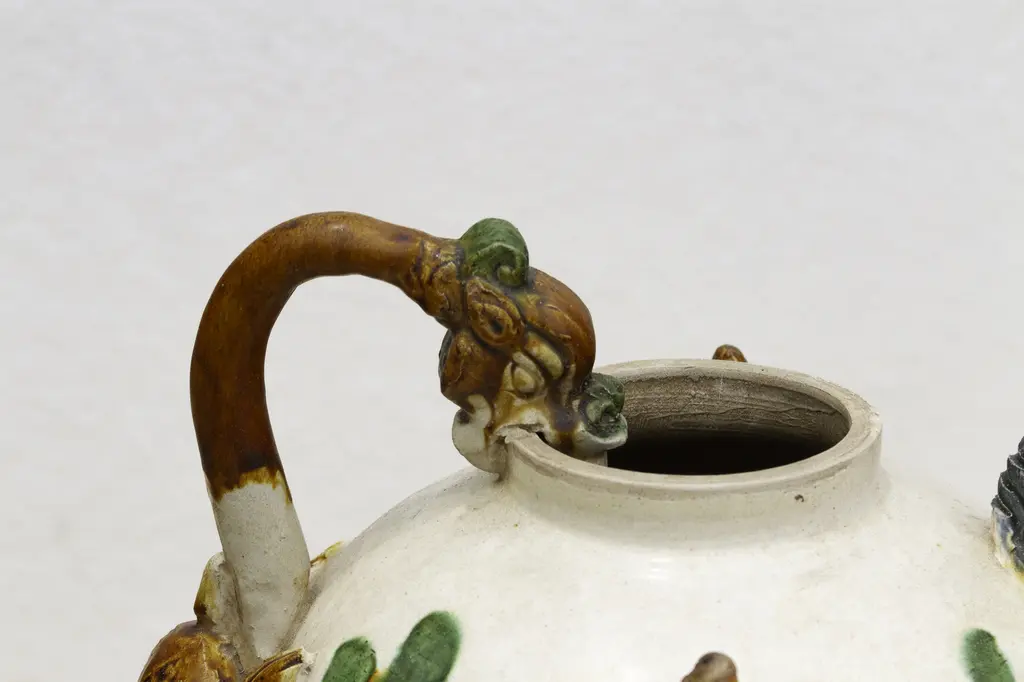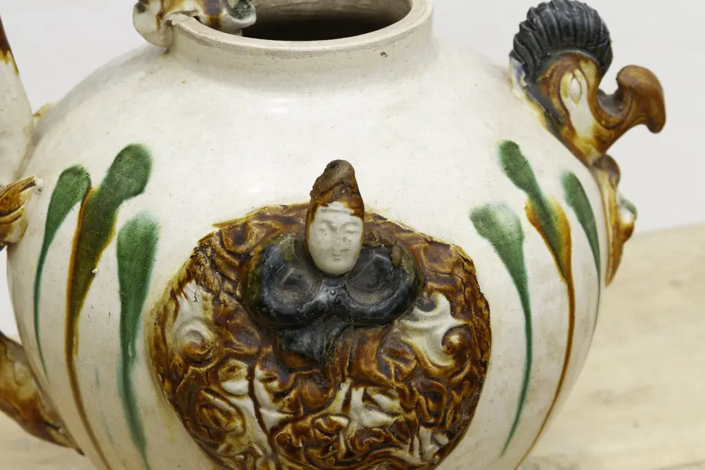 This captivating antique Chinese Sancai-style ceramic vessel, measuring 10 inches in diameter and 11 inches high, is a testament to vibrant East Asian artistry. Its unique form, with a prominent handle and decorative elements, is adorned with a distinctive Sancai (three-color) glaze, typically featuring earthy tones of brown, green, and cream/off-white, with characteristic glaze drips and textures.