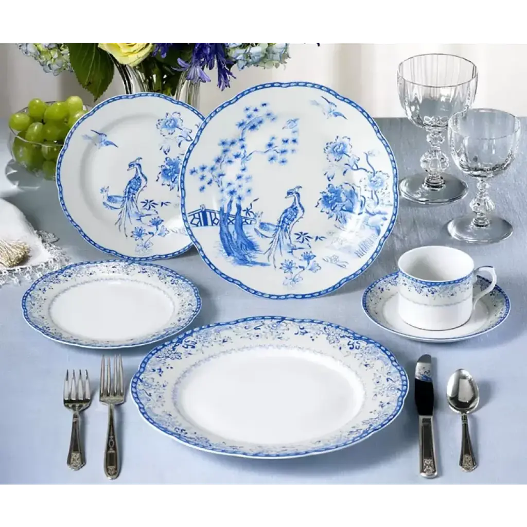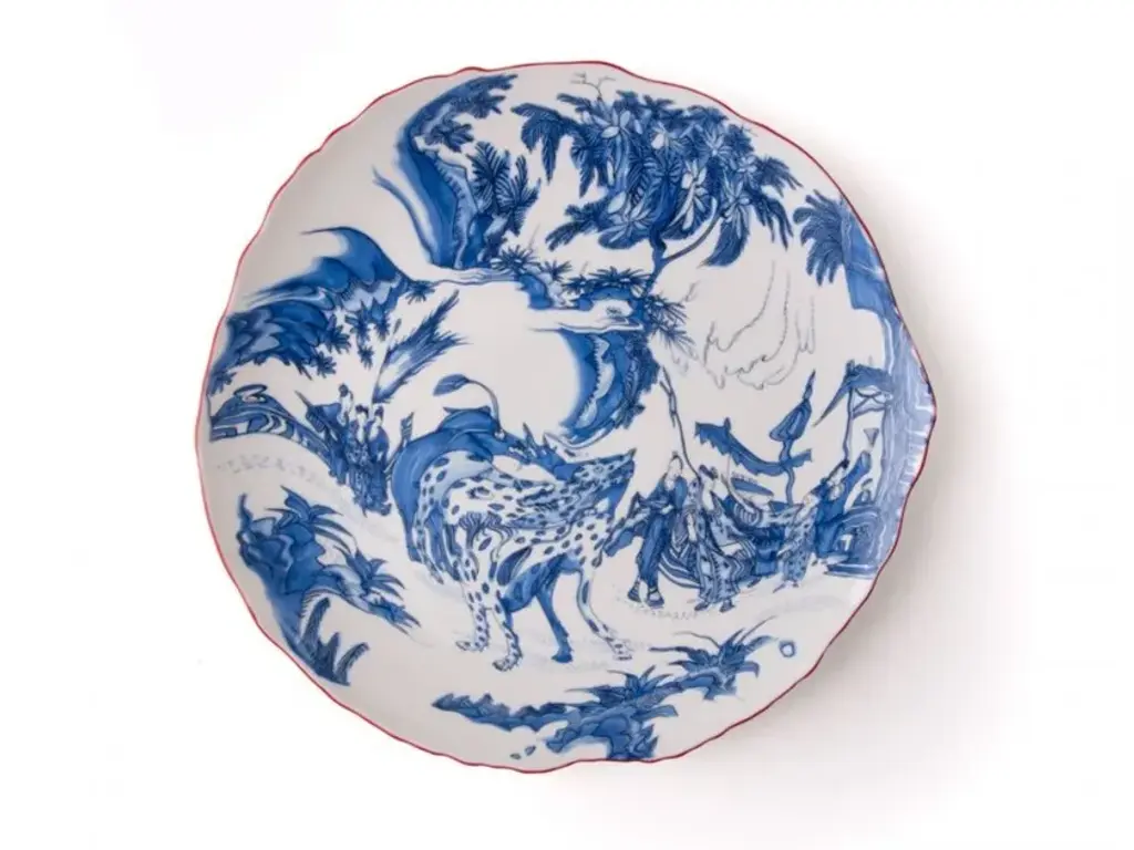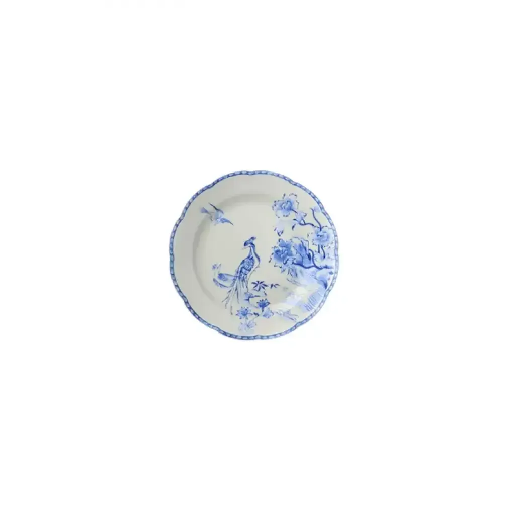 The dessert plate is adorned with a whimsical blue bird and vaious stylized trees. A favorite with brides, Mottahedeh specializes in luxurious patterns and unique, elegant shapes that are reproduced from china found in museums and historical societies. The patterns feature complex and vibrant colors, and hand-painted gold decoration. The pieces are surprisingly fresh and timely, and look wonderful in both contemporary and traditional dining rooms.