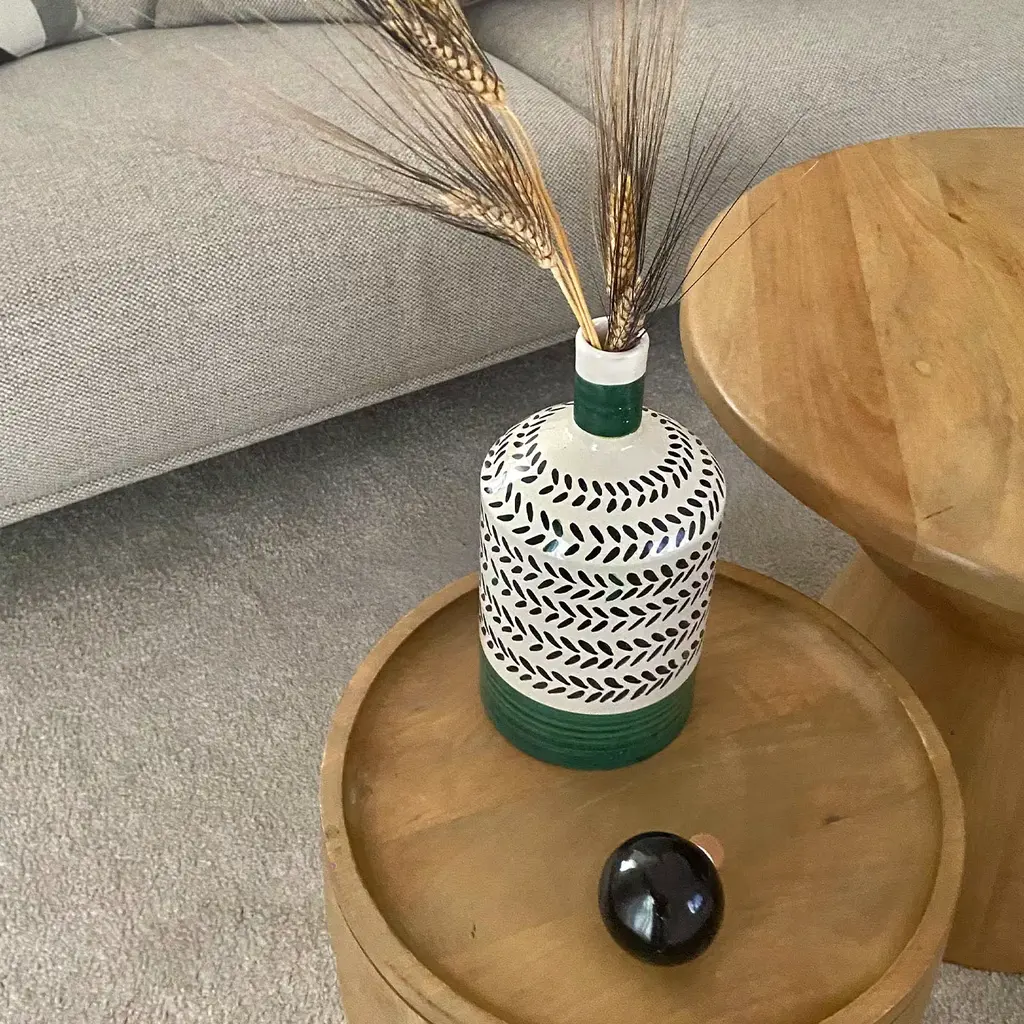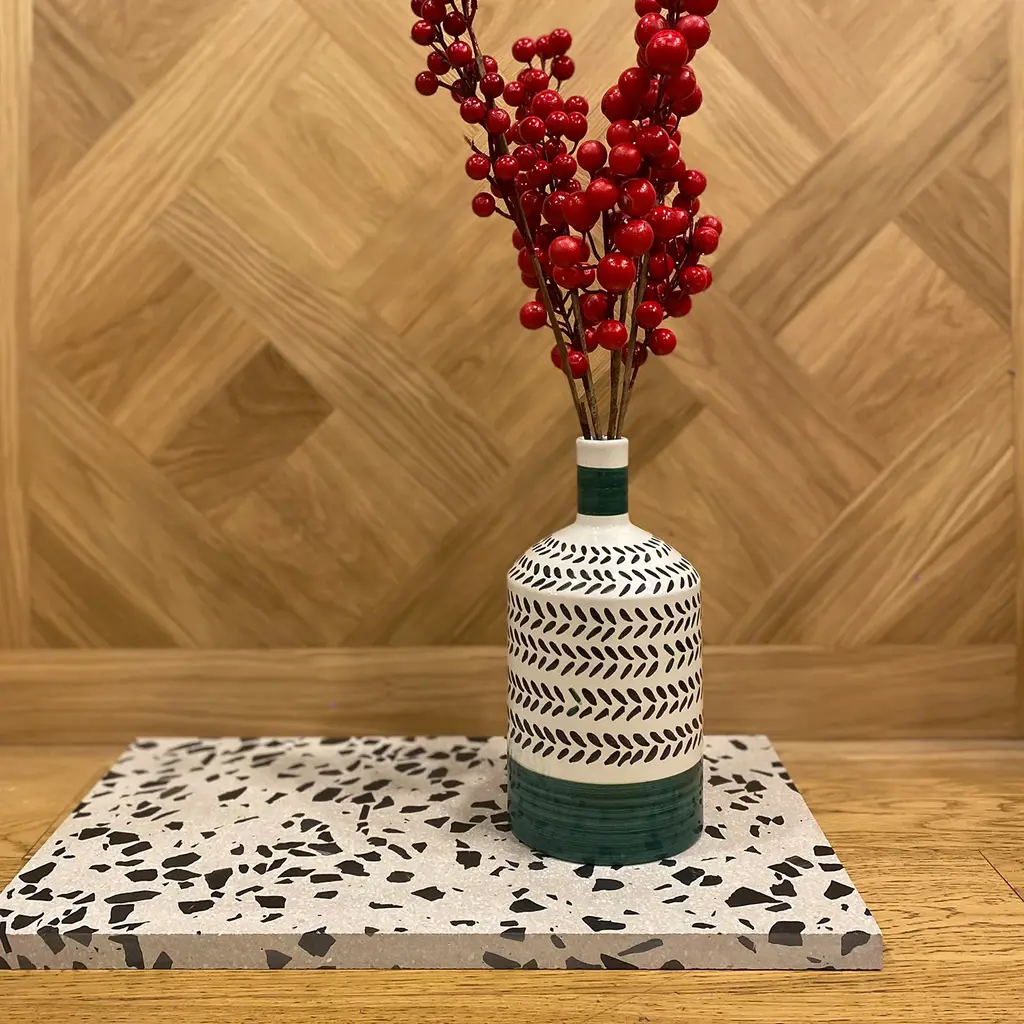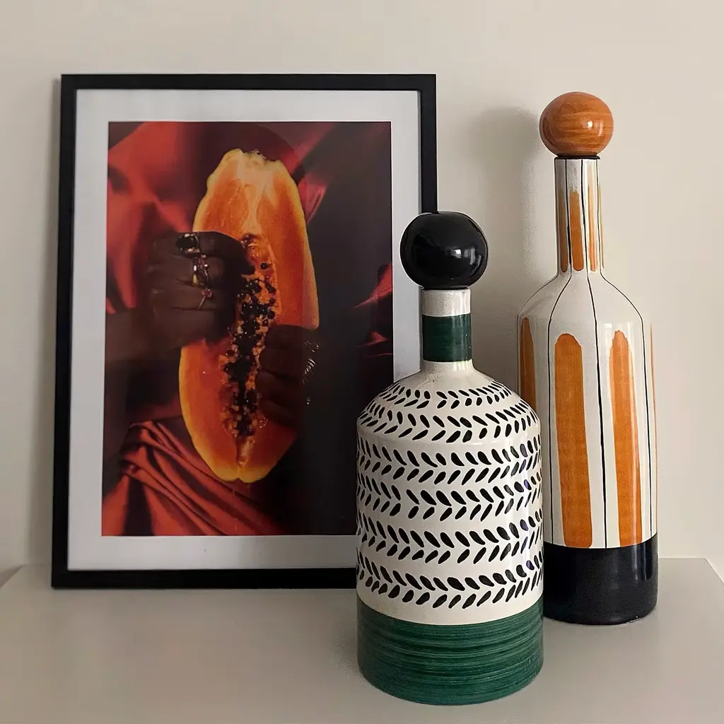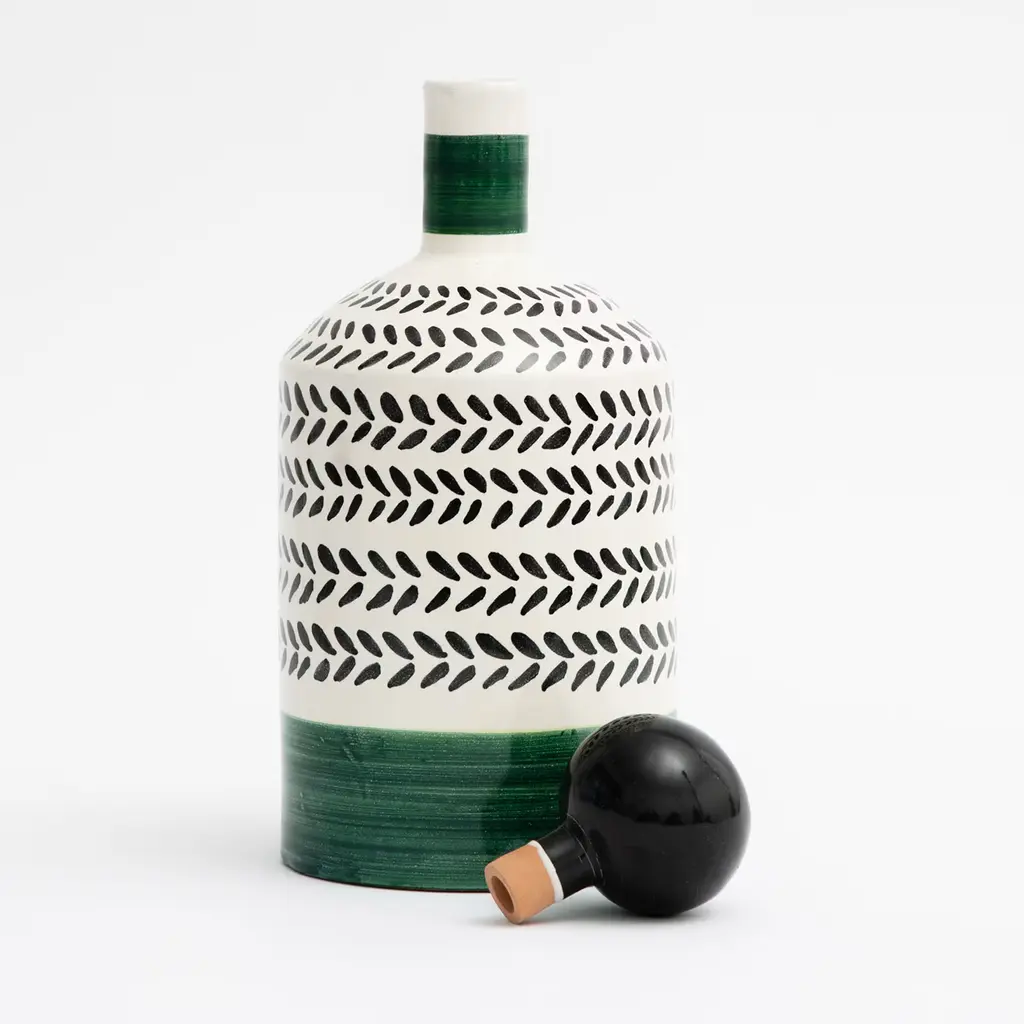 A sculptural ceramic bottle reminding of generously leafy olive branches. Minutely crafted and decorated by hand, the piece is rich in geometric references whose rigor gets counterbalanced by a fresh decoration of garlands that stand between a couple of green brushstrokes. A spherical black lid completes the design. Slight differences and imperfections attest to its artisan nature.