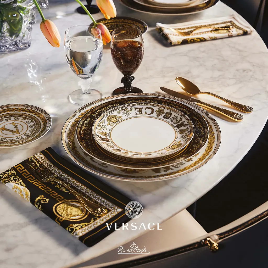 Rosenthal and Versace come together in the Virtus Gala Tableware Collection, featuring white, black and golden glazes fused on porcelain in a nod to Versace's iconic Barocco aesthetic. Designed to mix and match, various plates, bowls, platters and other pieces are embellished with Medusa Heads, stylized acanthus leaves and other motifs.