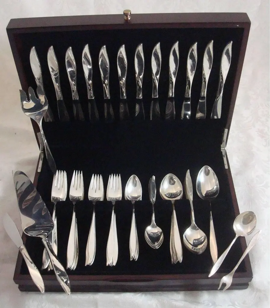 Beautiful Vivant by Oneida sterling silver flatware set of 66 pieces. This set includes: 12 knives, 9", 12 forks, 7 1/2", 12 salad forks, 7", 12 teaspoons, 6", 12 place soup spoons, 6 3/4", one serving spoon, 8 1/4", one cold meat fork, 8 1/4", one hollow handle master butter knife with stainless blade, 6 3/4", one pie server with stainless blade, 10 5/8", one sugar spoon, 5 1/2",one pickle fork, 5 1/2". Includes bonus brand new storage chest - styles vary.Excellent condition, no monograms. The set will be professionally polished to pristine condition and sealed in plastic sleeves prior to shipping. 100% satisfaction guaranteed!
