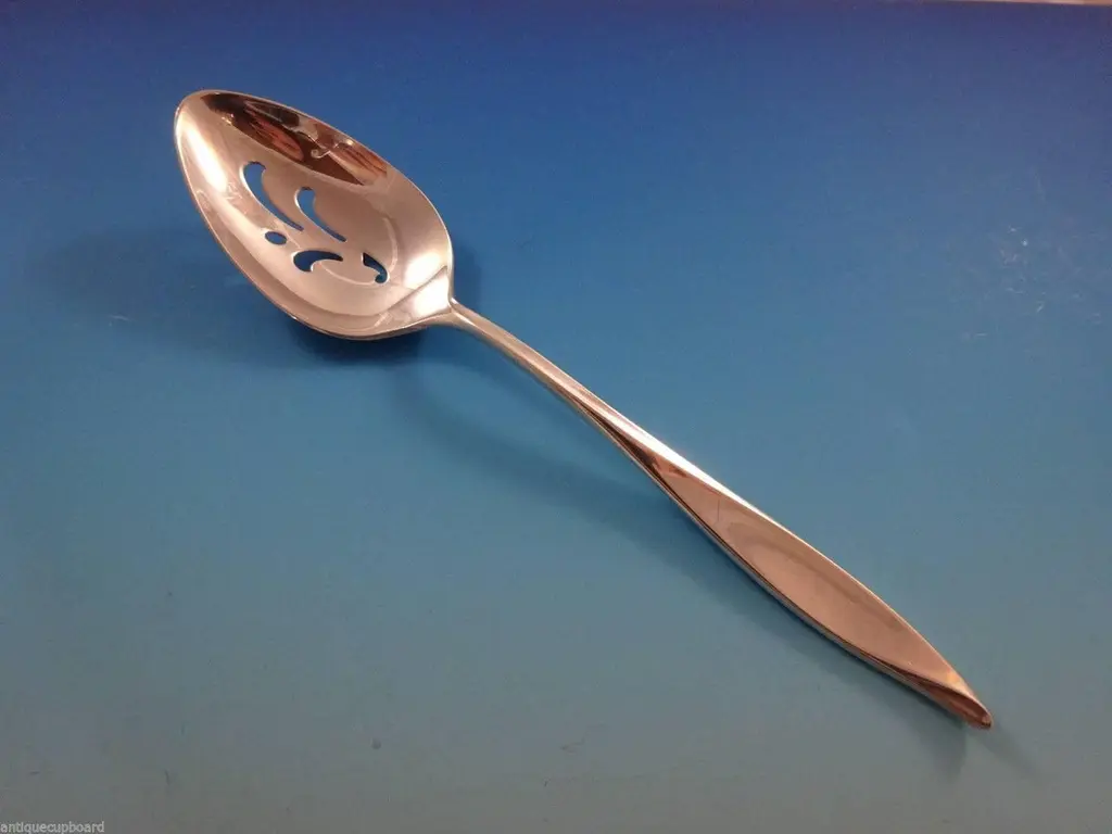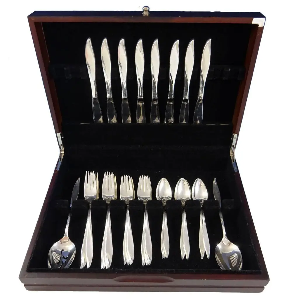 Vivant by Oneida sterling silver flatware set of 34 pieces. This set includes: Eight knives, 9", eight forks, 7 1/2", eight salad forks, 7", eight teaspoons, 6", one serving spoon, 8 1/4", one pierced serving spoon, 8 1/4".Includes bonus brand new storage chest - styles vary.Excellent condition, no monograms. The set will be professionally polished to pristine condition and sealed in plastic sleeves prior to shipping.100% satisfaction guaranteed!