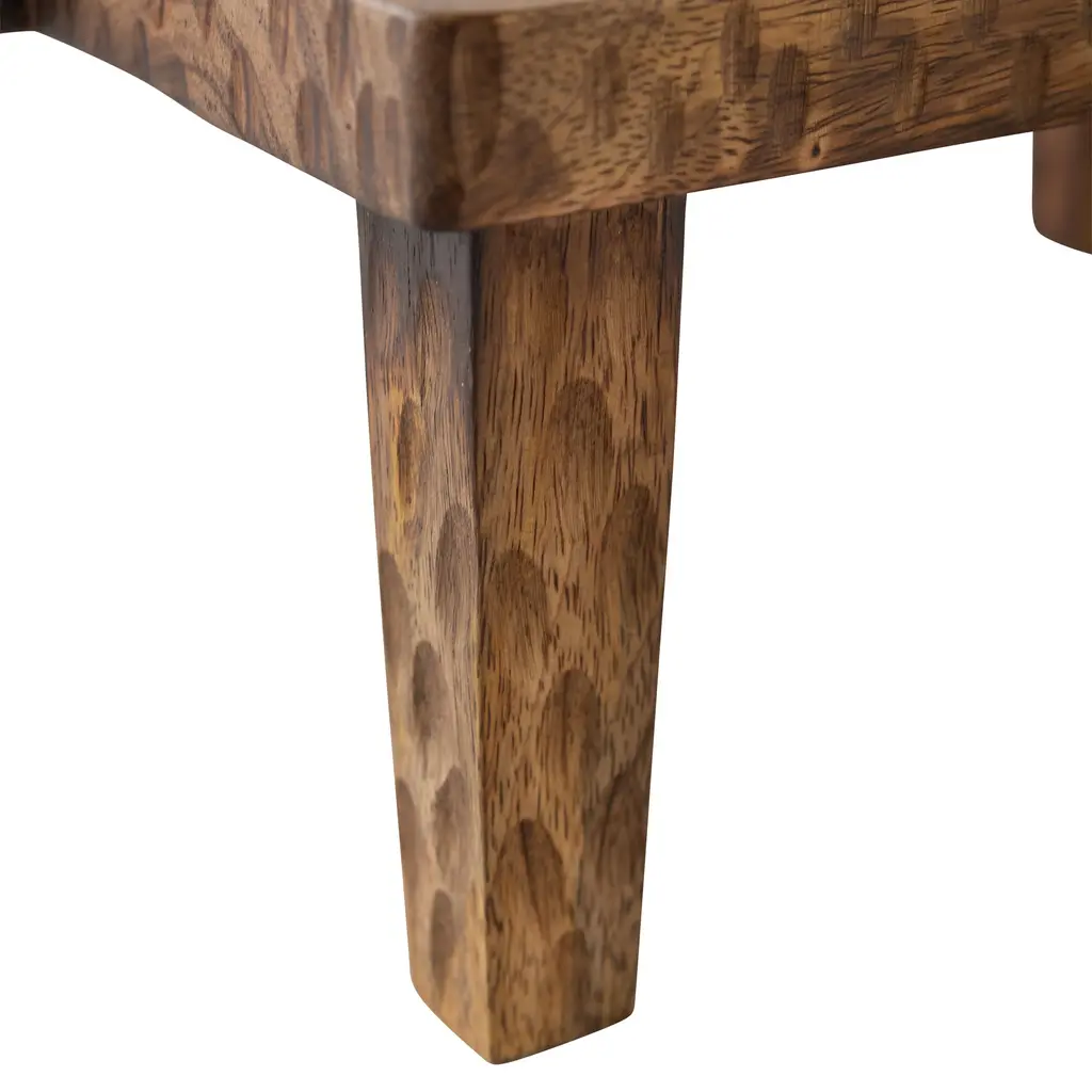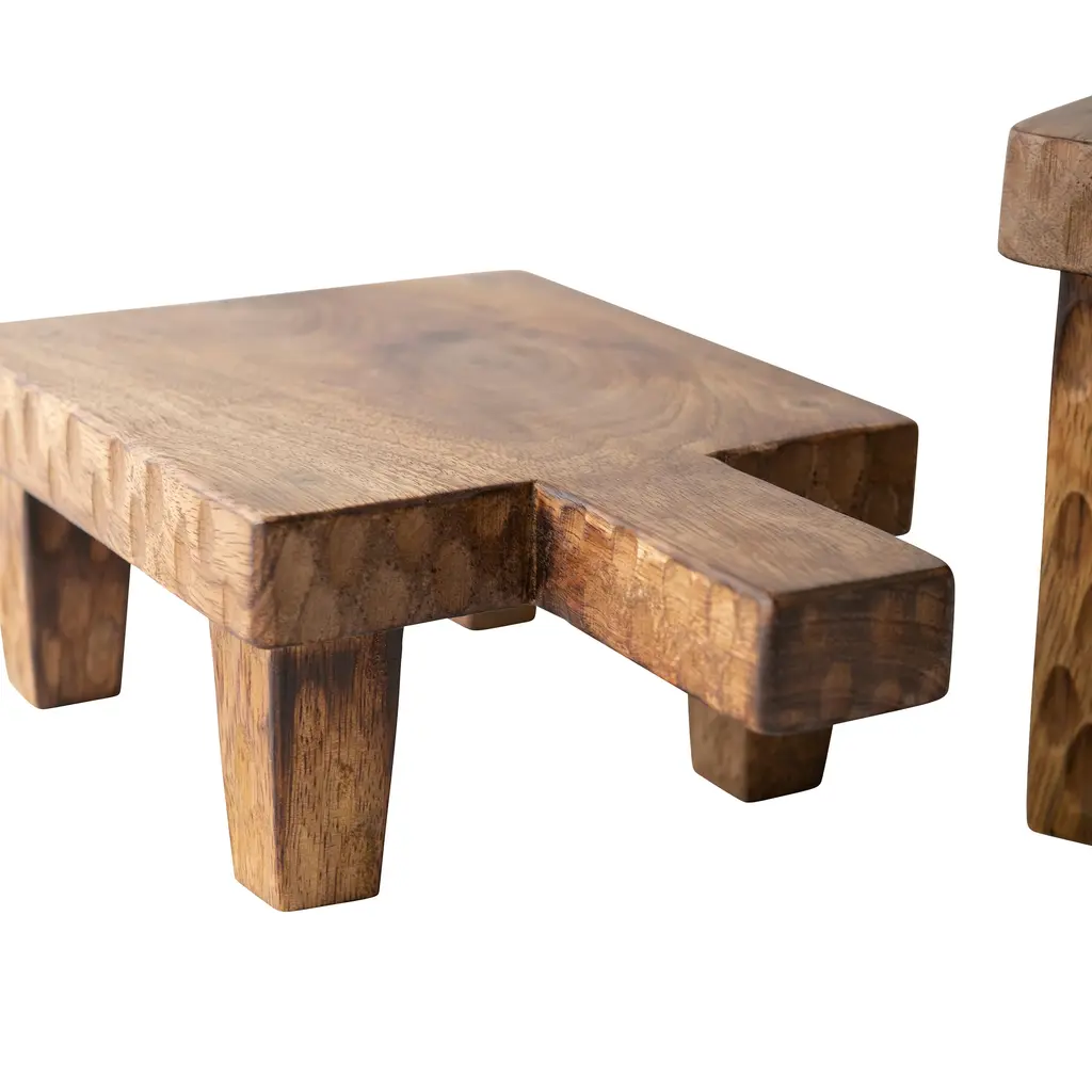 Our elevated boards from India are expertly crafted from a thick slice of naturally harvested mango wood and display variations in depth, grain, and carved side patterns, for an almost animal-like silhouette. Food safe.
