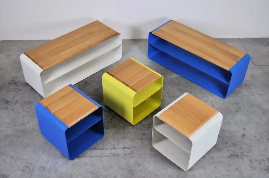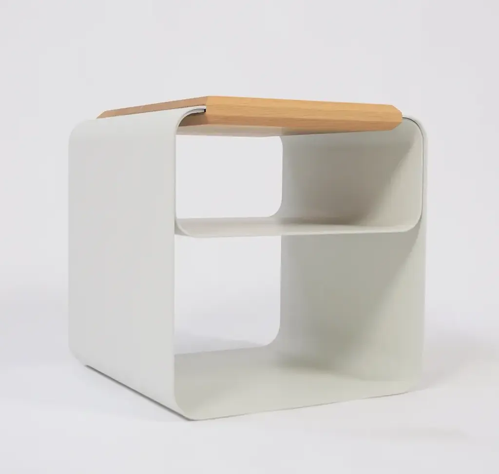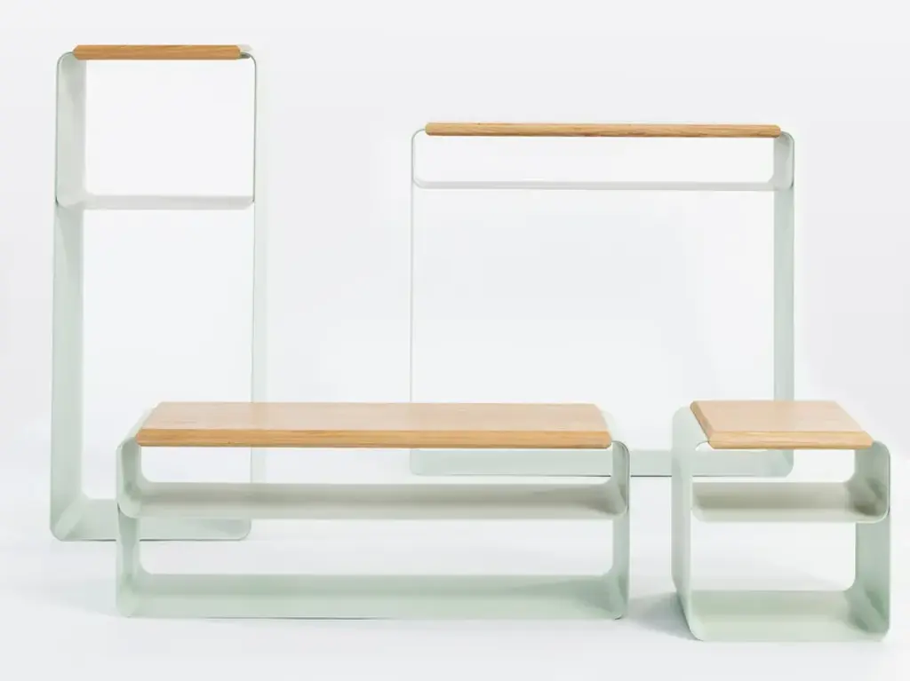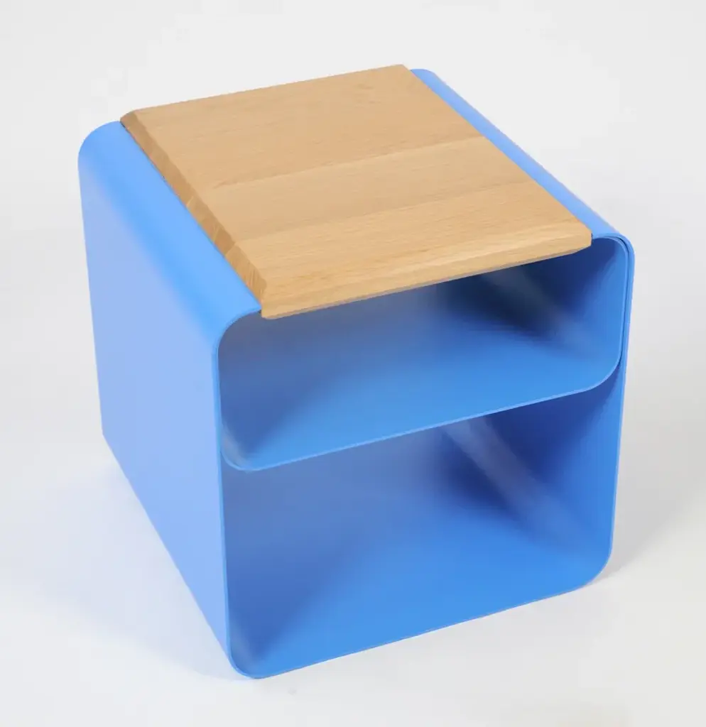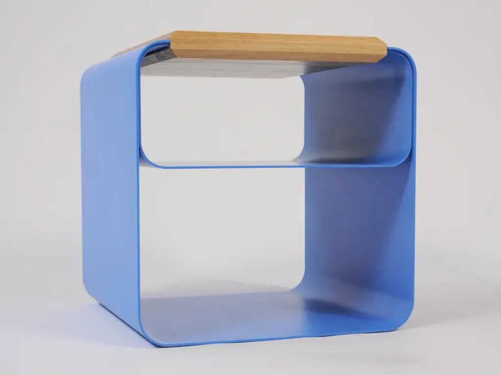 Vodo is a stool with structure in folded sheet metal and shelves in solid wood fixed by interlocking. Available in various colors and essences from the Medulum palette. A small stool, a coffee table or a bedside table, these objects of the Vodo family, are suitable for various functions in public or private environments, in a hotel as in a residence.Vodo, a line of furnishings that redefines interior landscapes. Folded metal plates, voids that create windows for living spaces, sculptures that become benches, bookcases, bedside tables and consoles. Essential forms provided by architecture.
