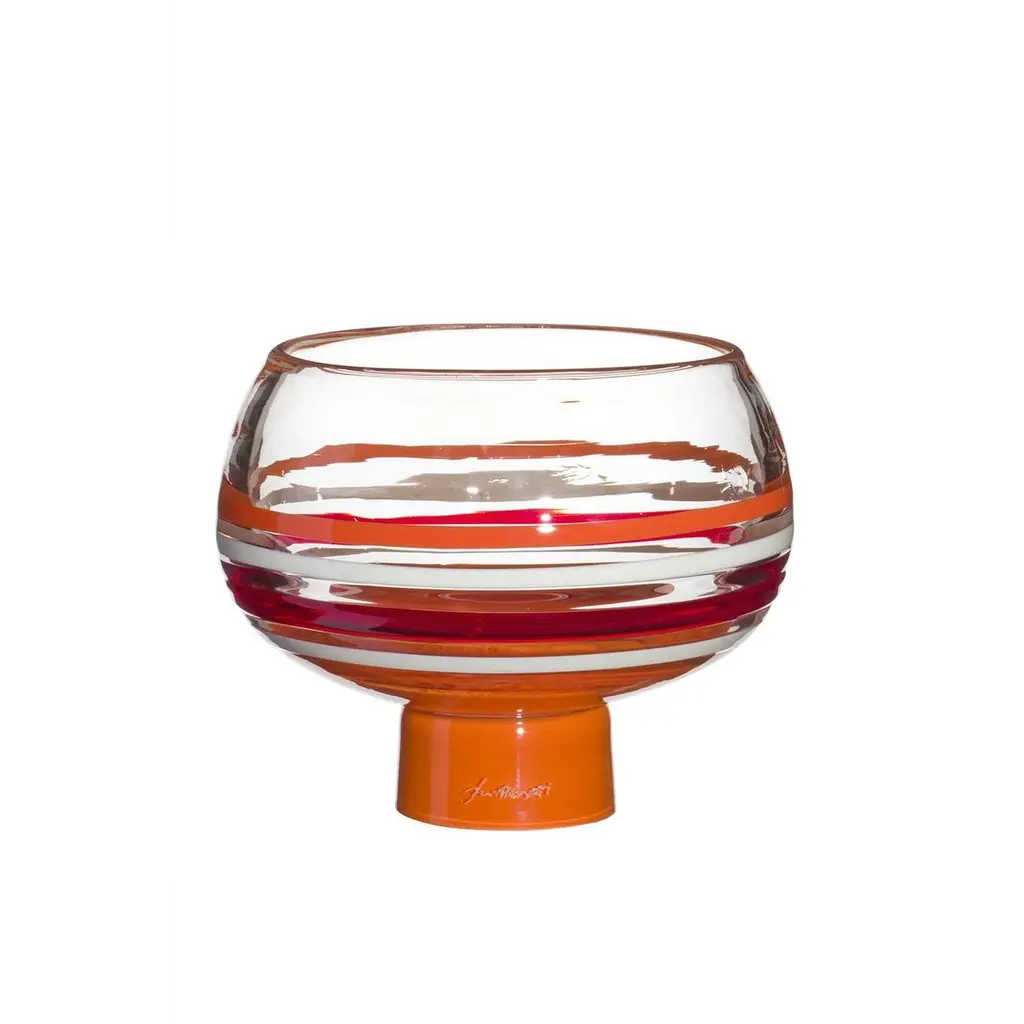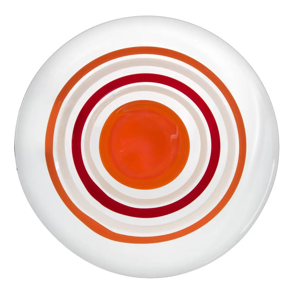 Carlo Moretti Vola flying glass technique Murano glass plate with stand in clear, orange, white and red It takes at least 20 years of experience to become a glass Master, but only the most skilled are able to learn the mano volante technique.