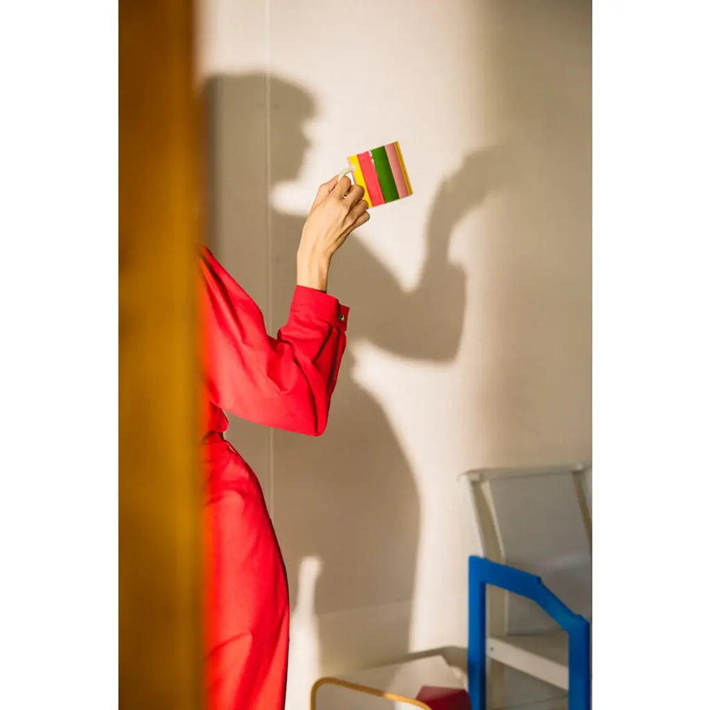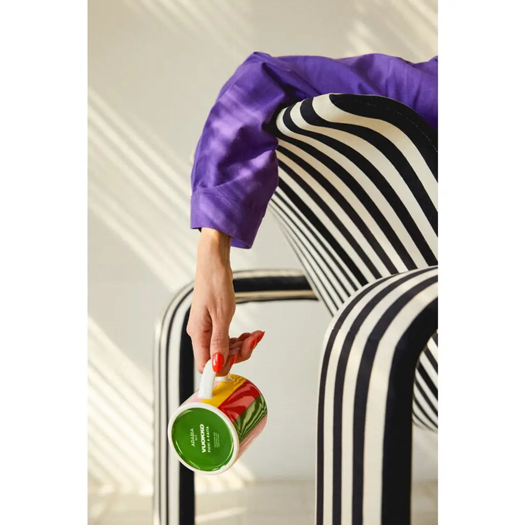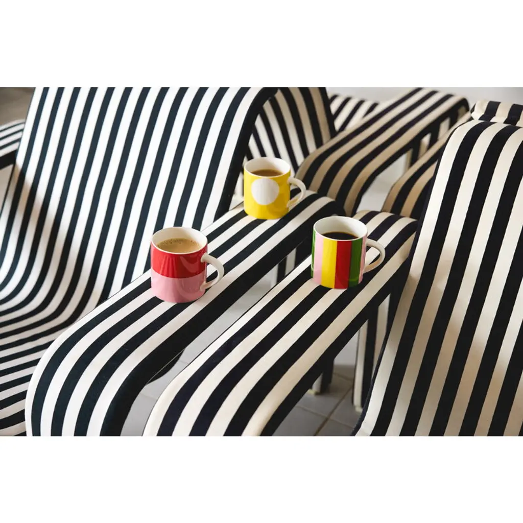 Arabia's Vuokko mug features a striped pattern designed by Vuokko Nurmesniemi in 1973. True to its name, Pieni 4-raita – or "Small 4-stripe" – consists of four playful, differently colored stripes and is one of Nurmesniemi’s most iconic designs. With a capacity of 3.5 decilitres, the Vuokko mug is perfect for enjoying everything from morning coffee and afternoon tea to hot chocolate topped with whipped cream. The Arabia X Vuokko collection connects two pioneers of Finnish design: Vuokko Nurmesniemi, known for her bold textile and fashion prints, and Arabia, renowned for its clean-lined, timeless ceramics. The colorful collection features ceramic tableware, a tray, napkins and a unique glass vase – a revived design by Nurmesniemi from the 1950s.