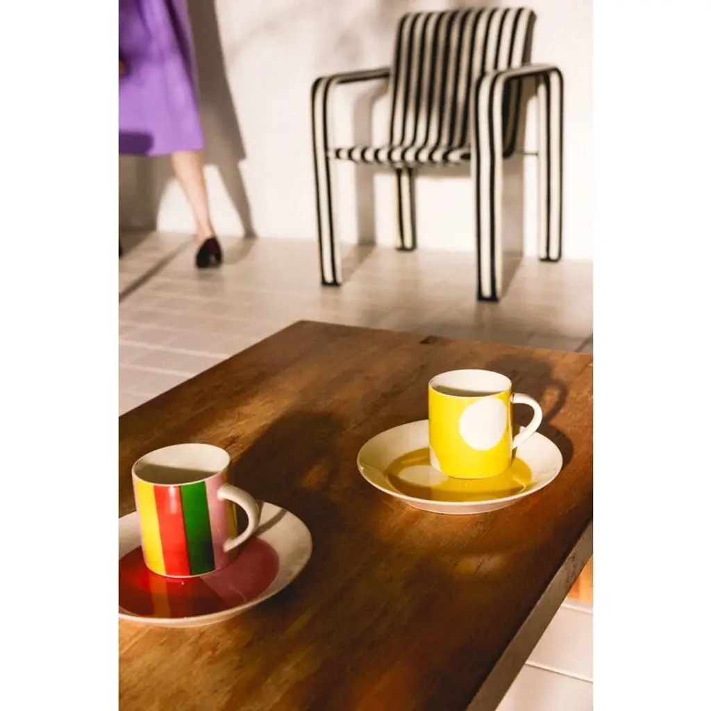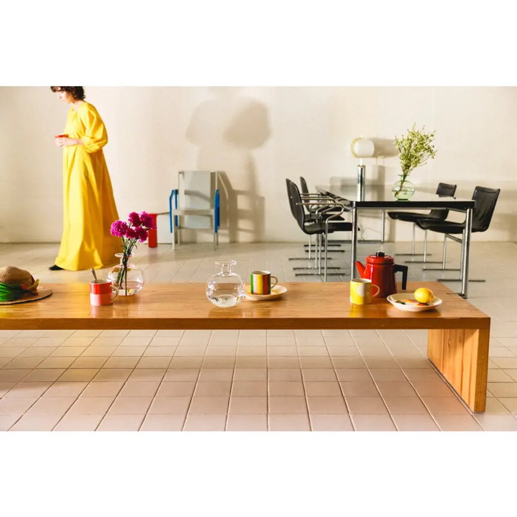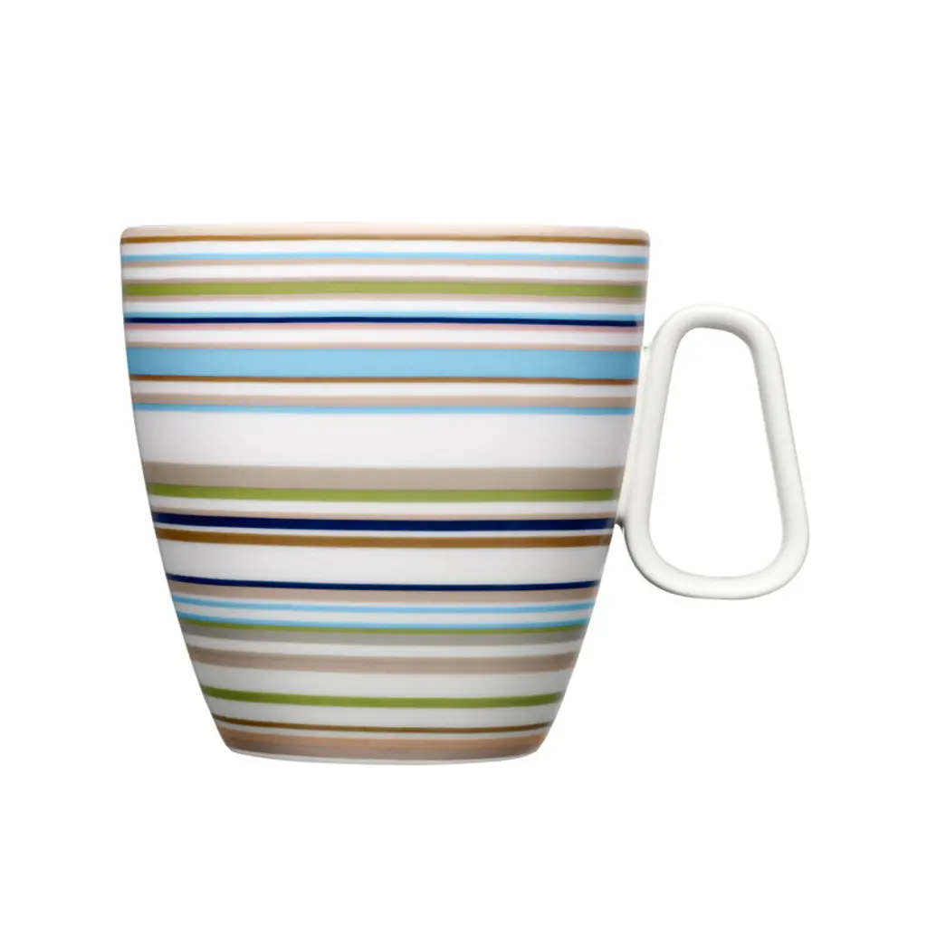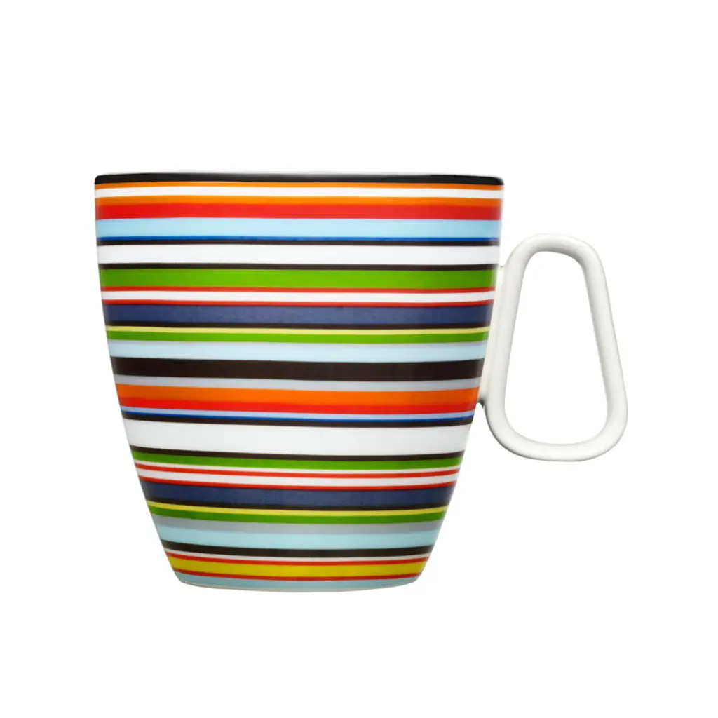 Arabia's Vuokko mug features a striped pattern designed by Vuokko Nurmesniemi in 1973. True to its name, Pieni 4-raita – or "Small 4-stripe" – consists of four playful, differently colored stripes and is one of Nurmesniemi’s most iconic designs. With a capacity of 3.5 decilitres, the Vuokko mug is perfect for enjoying everything from morning coffee and afternoon tea to hot chocolate topped with whipped cream. The Arabia X Vuokko collection connects two pioneers of Finnish design: Vuokko Nurmesniemi, known for her bold textile and fashion prints, and Arabia, renowned for its clean-lined, timeless ceramics. The colorful collection features ceramic tableware, a tray, napkins and a unique glass vase – a revived design by Nurmesniemi from the 1950s.