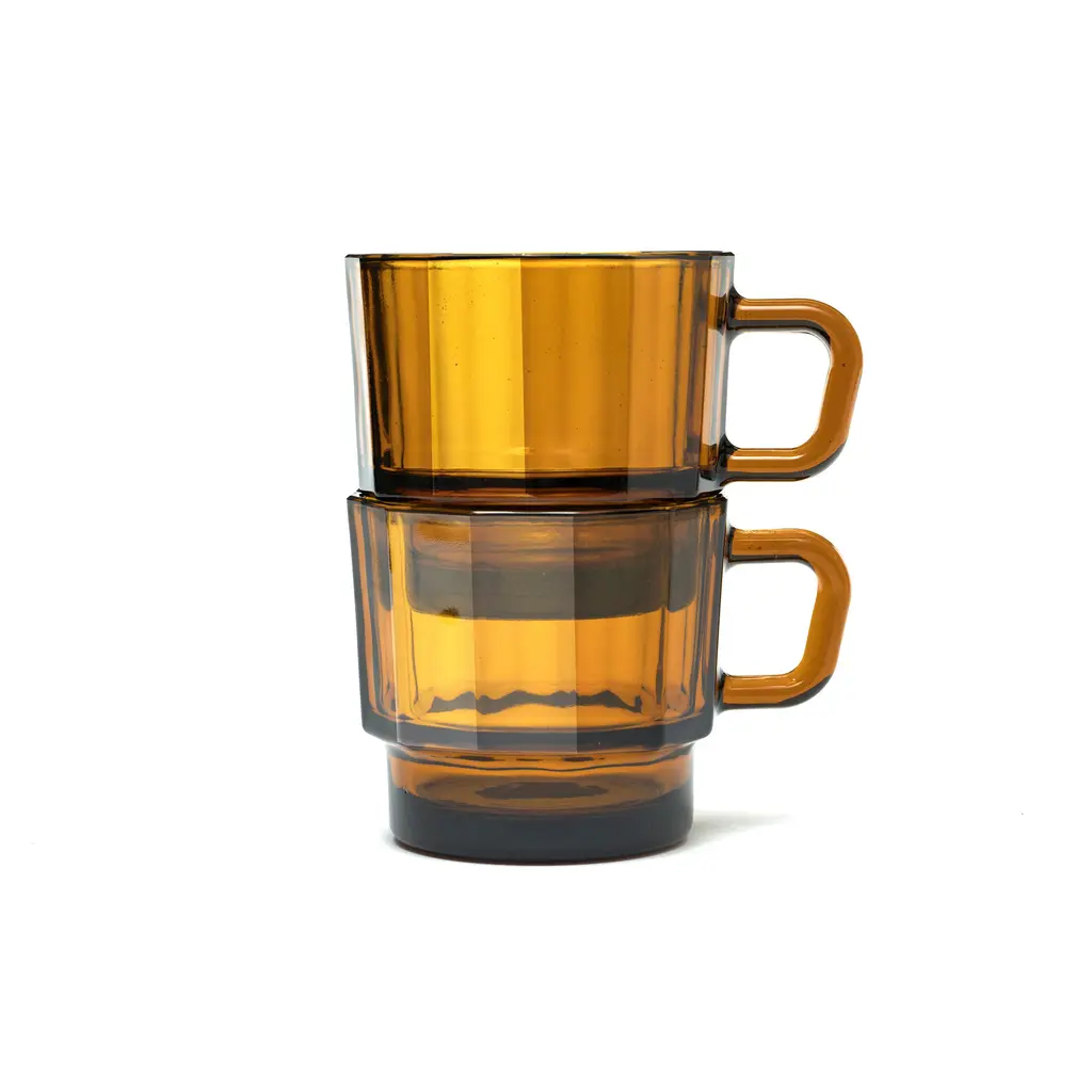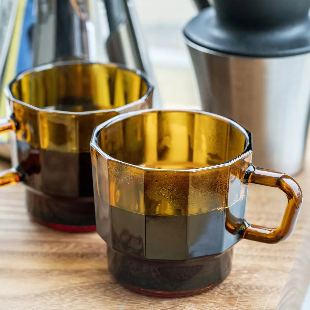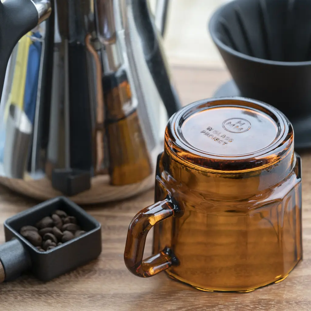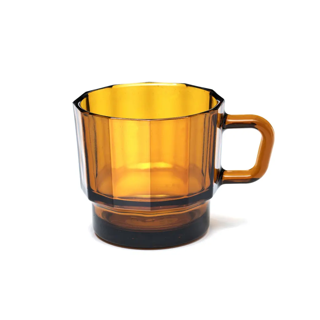 Inspired by the passage of time and the cycle of life, this recycled glass cup provides an elegant solution to energize your morning or relax with your daily tea making ritual. Simple and stylish, the HMM W Glass Coffee Cup Amber features twelve facets that reference the hours of a clock. The design also puts a focus on function. Apart from the tapered bottom that allows stacking, the glass features an angled exterior and a smooth, circular interior for easy cleaning. A heat-proof handle with a rounded shape for more comfort completes the design. Like the clear color version of this design, the HMM W Glass Coffee Cup Amber features recycled glass sourced from Spring Pool Glass. Each product is crafted locally by artisans in Taiwan according to eco-friendly, circular economy principles.