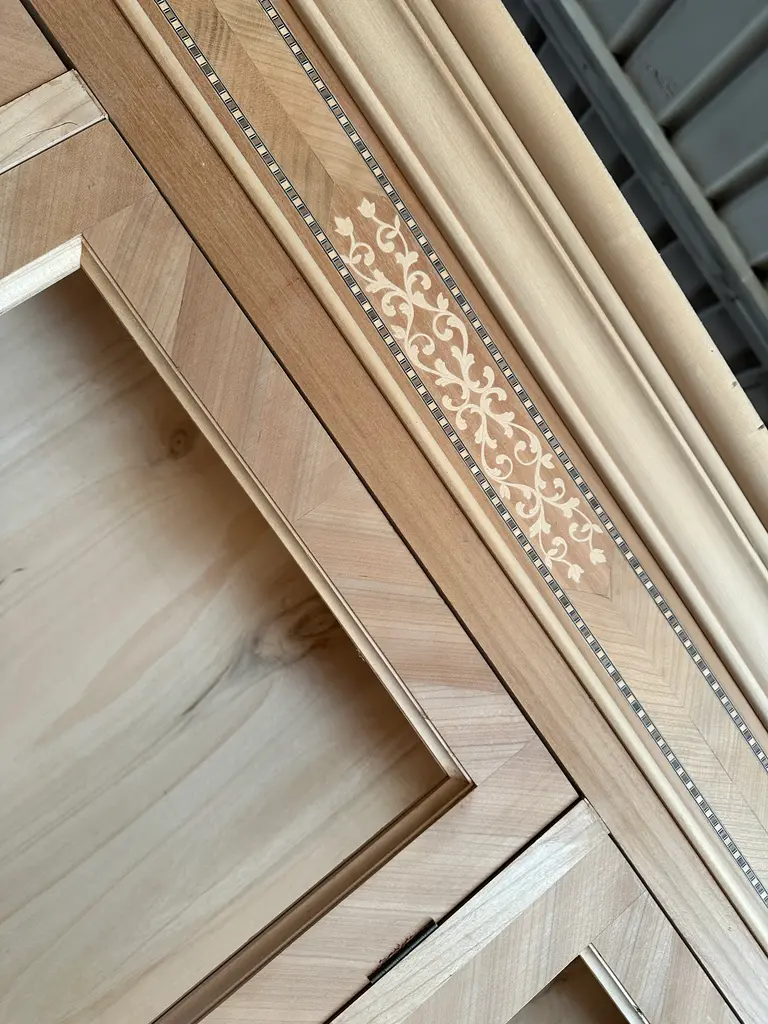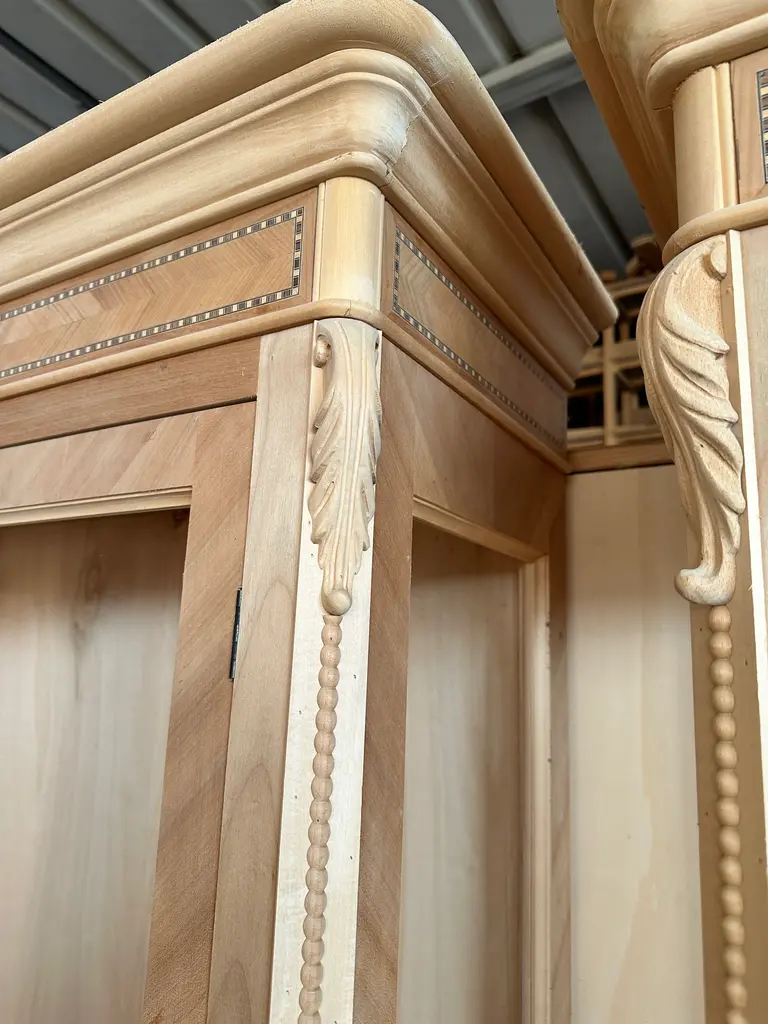 Italian natural walnut sideboard with cherry inlays in natural raw wood. Unpainted natural wood A piece of hight italian craftmanship. Natural finishing of wood give a touch of warm contemporary design. without handles and glasses For modern and classical interiors L.180x45 H 220cm /L 70.8" x 17.7" H 86.6" All made in Italy, ship from Italy