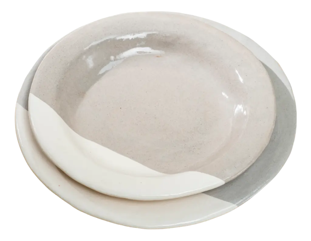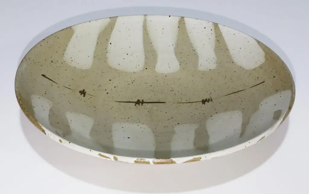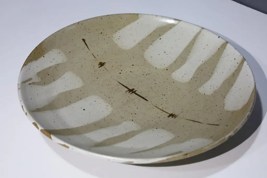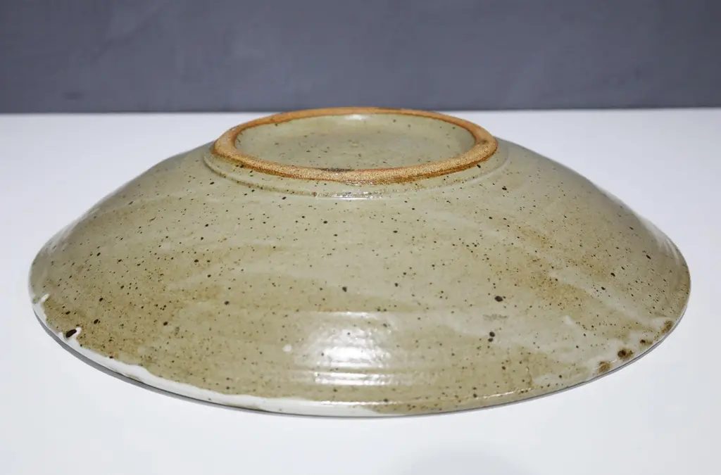 Large studio pottery platter with cream and brown decorative motif. Warren MacKenzie is known for simple, wheel-thrown functional pottery influenced by Bernard Leach and the Japanese aesthetic of the work of Shoji Hamada.In 1950 MacKenzie and his first wife Alix became the first American apprentices at the Bernard Leach pottery at St. Ives. They spent 2 years there where they met Shoji Hamada. The MacKenzies brought Leach and Hamada for a workshop tour of the United States in 1952. This tour had a far-reaching impact on the American studio pottery movement. MacKenzie is credited with bringing the Japanese Mingei, or folk, style of pottery to Minnesota, where it is known as the Mingei-sota style.Most of his pieces are produced in stoneware, although he worked in porcelain at times during his career. His first wife, Alix, decorated his pots until her death in 1962. At times during the 1970s and most of the 2000s, MacKenzie did not sign his work. He resumed the use of his chop at the end of 2009.