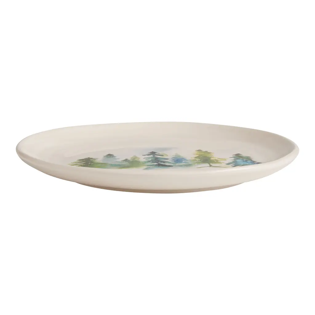 Adorned with green and blue watercolor pine trees set on snowy white ceramic, this exclusive small plate is a charming, wintry addition to your table. A timeless holiday dish that you'll want to bring out year after year, it adds a quaint touch to any Christmastime desserts or dinners.