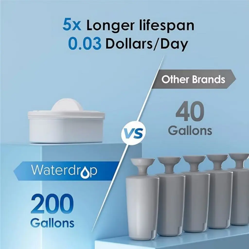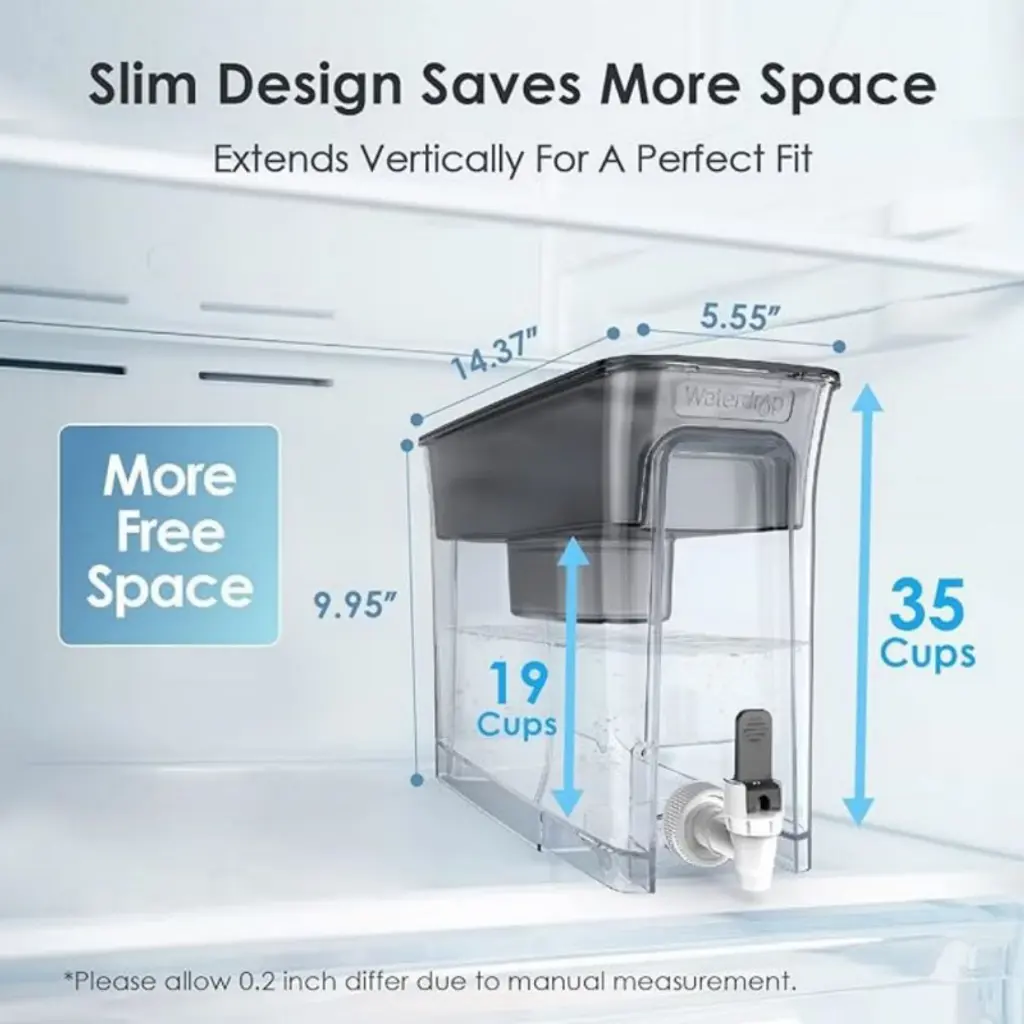 About this item โก๐๐ก๐ข๐ฌ ๐ฌ๐ฒ๐ฌ๐ญ๐๐ฆ ๐๐๐๐ ๐๐๐ ๐ฅ๐จ๐ฐ๐๐ซ ๐๐๐ ๐ฏ๐๐ฅ๐ฎ๐. If you prefer low TDS value, please choose Waterdrop 0 TDS Dispenser. (search model: WD-WFD-01L, WD-WFD-01W).[Fashionable and slim appearance]: This sleek and slim water filter dispenser is designed with space-saving dimensions of 14.37*5.55*9.95 inches. The 35-cup (19 cups in the body) capacity of this water filter dispenser can meet the water needs of the whole family. Please check the size of your refrigerator before purchasing to make sure the dispenser will fit perfectly.[Intimate detail design]: The top of the water filter pitcher is designed with a handle, which is easy to carry and lift, and the sliding cover design is convenient for adding water and can isolate the odor of the refrigerator. The arc design at the bottom makes it easy to move in the refrigerator. Equipped with the intelligent filter replacement indicator, you can change the filter in time and enjoy the freshness any time.[NSF-certified]: The water filter pitcher system replacement filter has passed NSF42 & 372 certification, adopts high-quality carbon fiber. Tested by the third party laboratory, the residual chlorine reduction rate is up to 97.4%. 3-pack replacement filters are available for purchase! (search model: WD-PF-01A Plus).[4X flow rate, 5X lifespan]: While ensuring the filtration effect, the carbon fiber adopted by this water filter pitcher has 4X flow rate of competing products, and it can be fully filtered within 5 minutes. The 200-gallon or 2-month life is also 5X that of competing products.[Safety material and high filtration performance]: The water dispenser is made of food-grade materials, lead-free, BPA-free. With the superior filtration performance, it can effectively reduce odor, iron, metal ions, calcium, magnesium, mercury, copper and other substances to improve the taste and ensure the wholesome of the water quality, every sip is safe. *The data come from a qualified third-party testing agency.