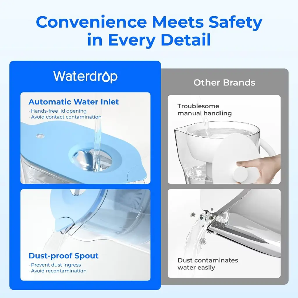 About this item [Multi-color options]: The modern, multi-color design of the Waterdrop water filter pitcher wih lid, an apartment essentials item, is coupled with a 7-cup filtration capacity and a compact body. The pitcher with a lid is perfectly fit for your refrigerator, an element crucial to any kitchen essentials and apartment essentials. A pitcher with lid keeps your water protected, enhancing the overall functionality in your dormitory, home, office.Replacement filters model: WD-PF-01A.[Exceptional quality] This pitcher's innovative design features a hands-free lid that allows for automatic water dispensing without the need to open the lid, ensuring convenience and hygiene by preventing dust accumulation. It is engineered to fit most refrigerators with its compact size. Product Dimensions: 9.7"*3.8"*10". Please verify your fridge dimensions for compatibility, as is recommended for all apartment essentials.[NSF certified filtration performance]: This Waterdrop filtered water pitcher wih lid has passed NSF42 and 372 certifications, confirming the use of high-quality activated carbon fiber only. The residual chlorine reduction rate is as high as 97.4%.[Dedicated filtration performance]: Using multi-stage water filter technology, this water filter pitcher can effectively reduce chlorine, PFOA/PFOS, odor, iron, and metal ions, tested by a third lab. The main purpose of the Waterdrop pitcher is not TDS reduction.[Induction indicator]: The inbuilt indicator in the Waterdrop filtered water pitcher lets you know when it’s time to replace the countertop filter. You can also check the filter status in real time while taking water from the system.
