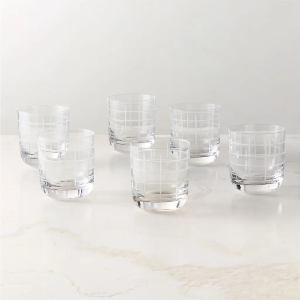 Crafted in Poland, sophisticated double old-fashioned glasses are distinguished by a crisp etched grid pattern. The modern glass feels great in hand thanks to its hefty rounded sham. Complete the collection with our Violeta cooler glasses. CB2 exclusive.