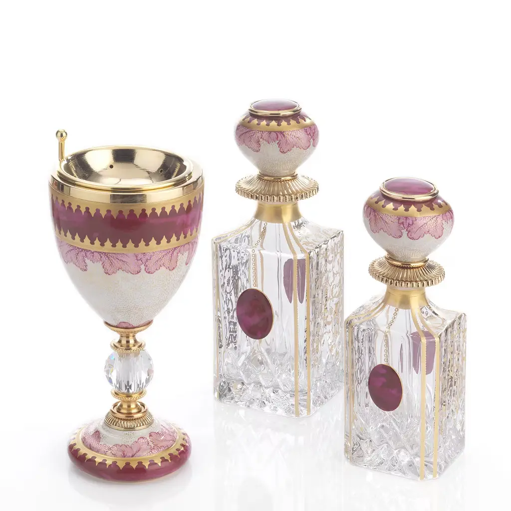 This precious crystal bottle is to fill 300 ml. of perfume because it has a crystal stick to smell it but can be a decorative object too. The engraved crystal is decorated with real gold details and the lid and the medallion are made in fine porcelain with an elegant purple and pink decoration, finished with gold motives. The brass parts are gold plated. Please ask the Concierge for customization options.