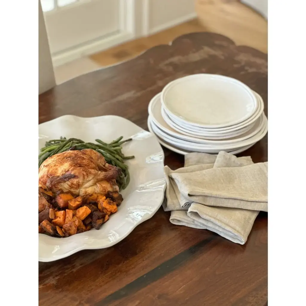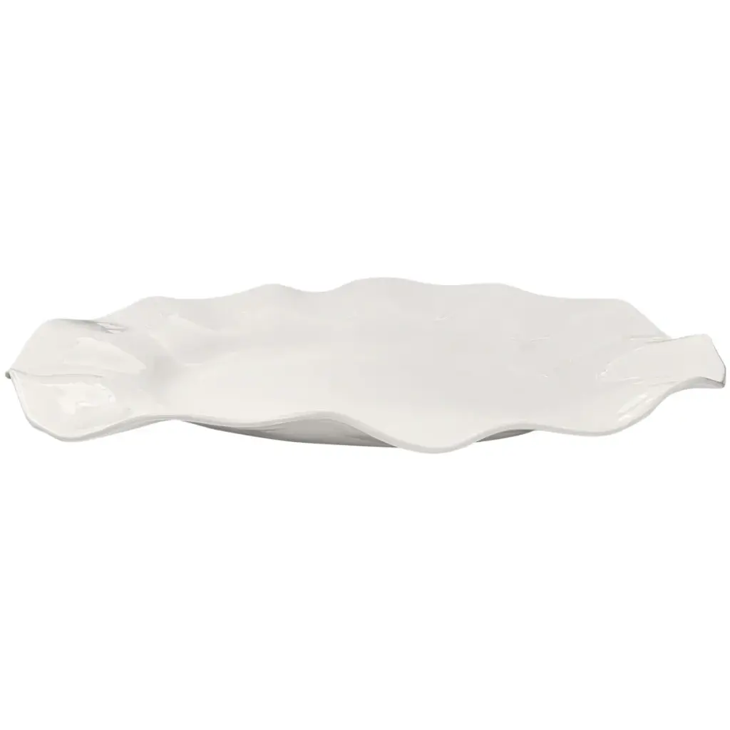 Whether dining indoors or out, this stunning platter will add delightful charm to your table. Featuring a wavy whimsical design, finished in white and made of melamine. Entertaining or everyday use will be worry free. Additional pieces are available to create a beautiful table.