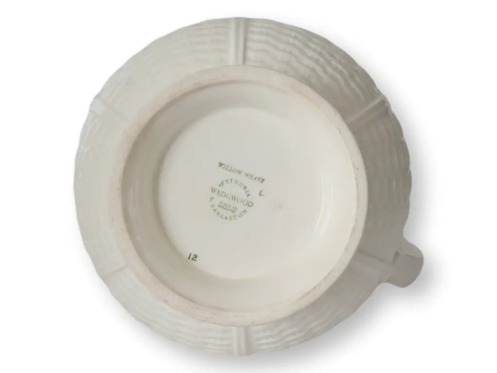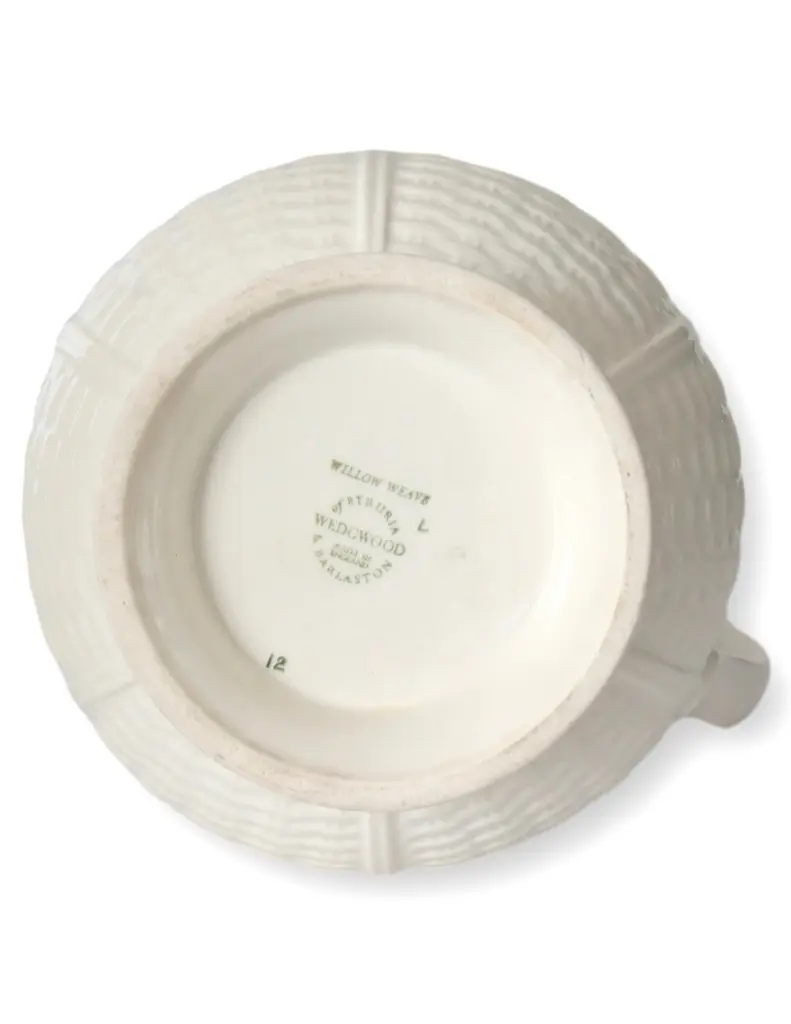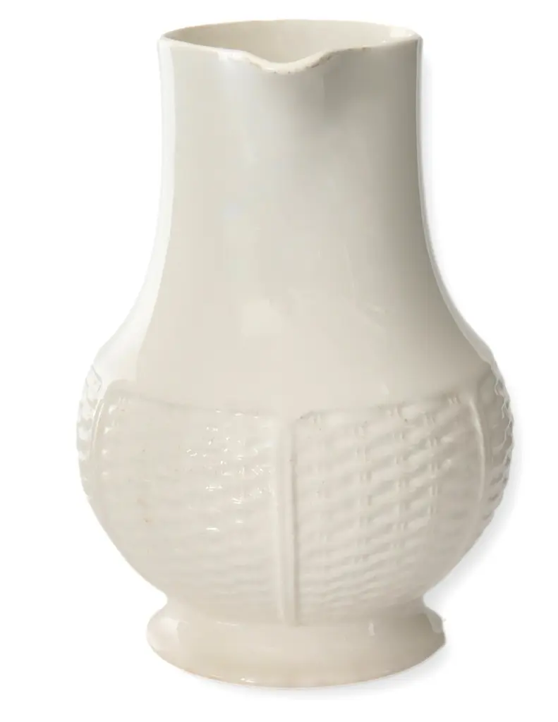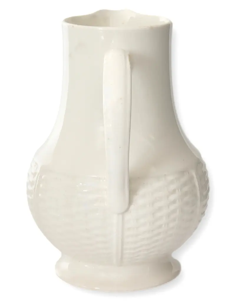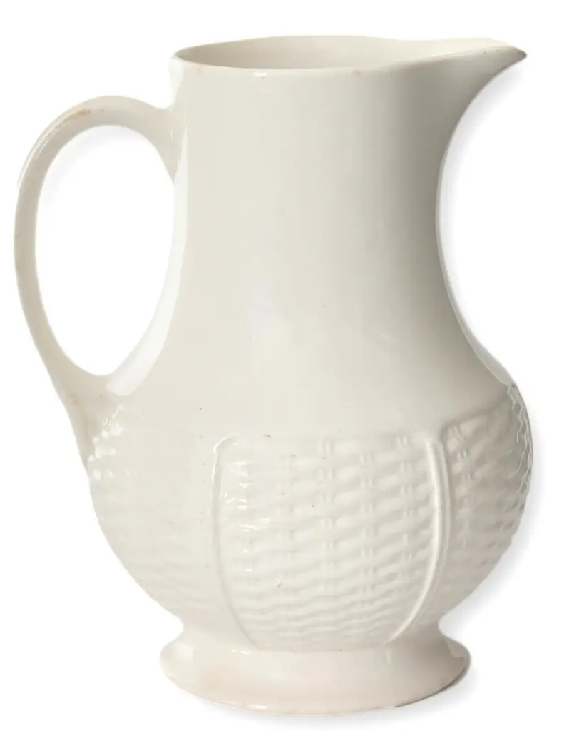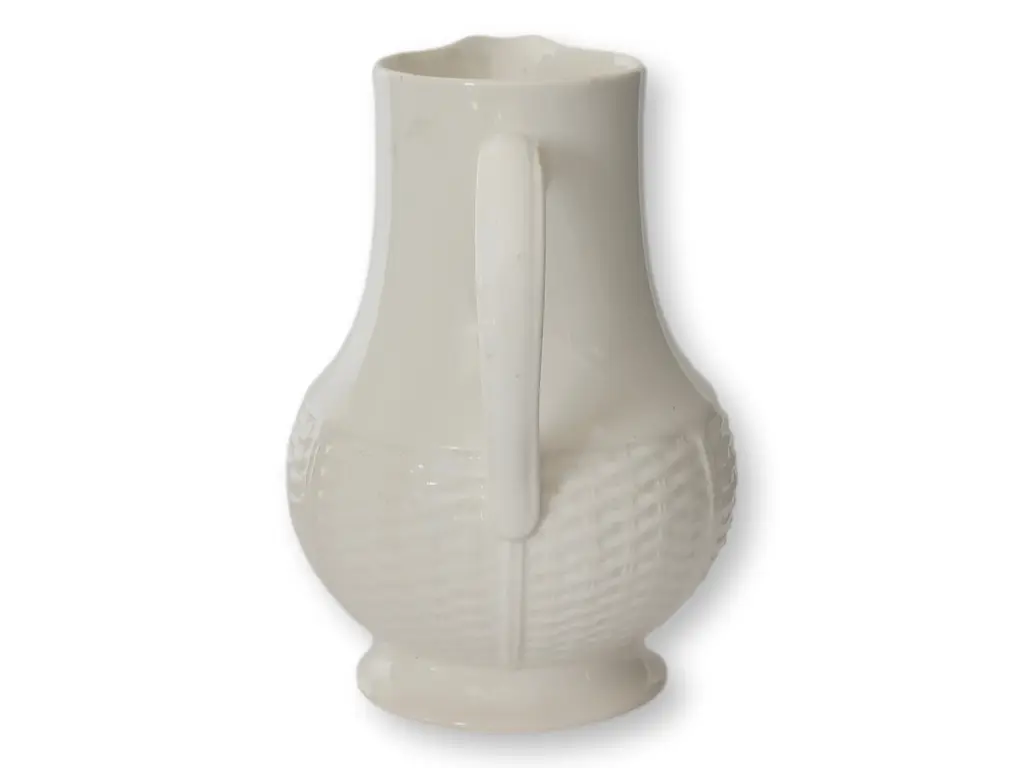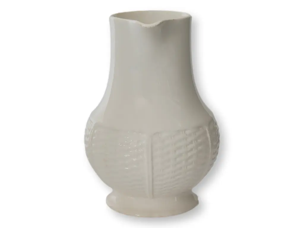 This elegant Wedgwood creamware jug features a charming basketweave pattern, showcasing the timeless craftsmanship of the renowned maker. The jug's delicate design and creamy hue make it a versatile addition to any table setting, perfect for serving beverages or as a decorative piece. The maker's mark on the underside authenticates its heritage, ensuring its value to collectors and enthusiasts of fine ceramics.