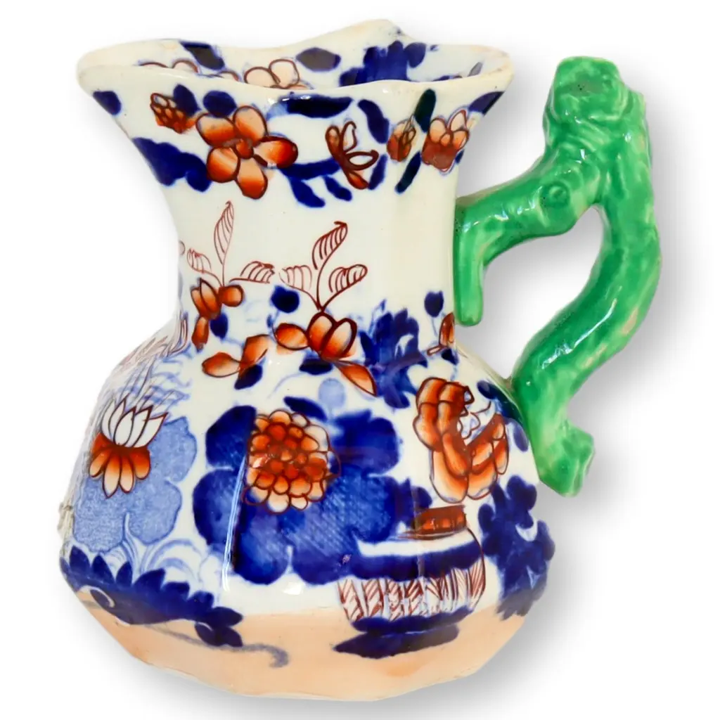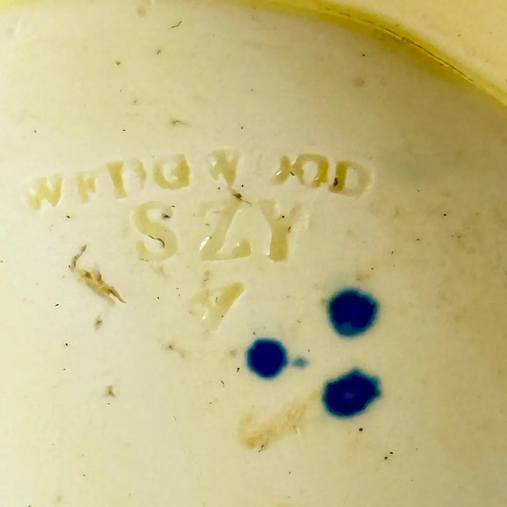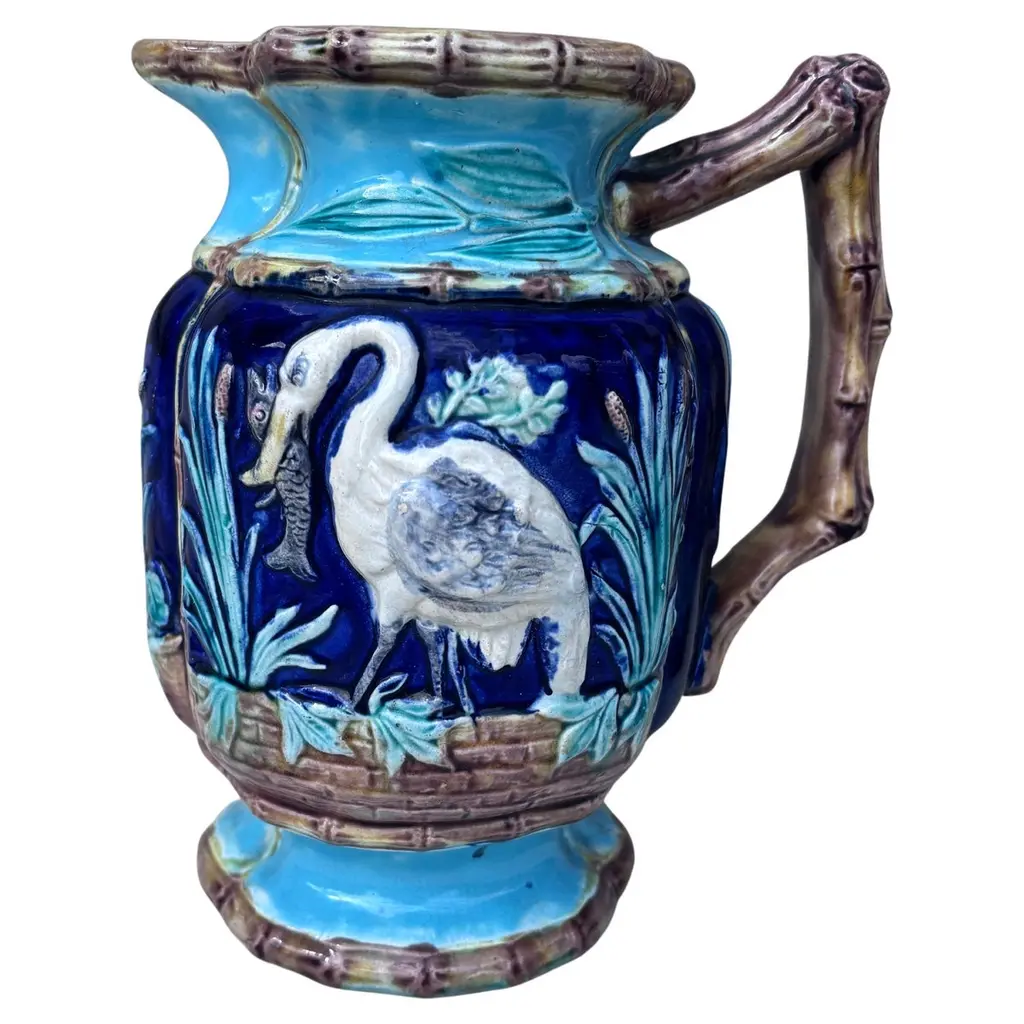 An English Wedgwood Majolica pitcher, an aesthetic movement mold showing a snail shell against sprays of climbing ivy on a tortoiseshell ground. A branch form handle, yellow ochre rimming and a sea-green interior. Amazing color and the crisp mold work Wedgwood is known for.Impressed Wedgwood mark along with a three digit date code, the ‘Y’ for the year 1870.Measures: 7.5 in. L x 6 in. W x 9.5 in. HIn excellent antique condition.