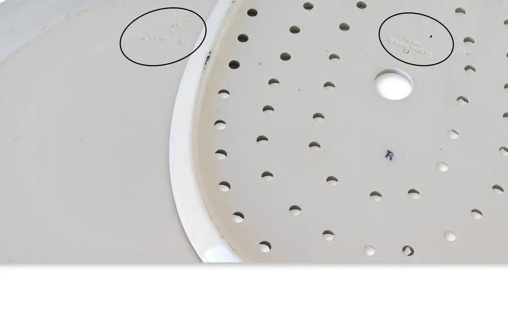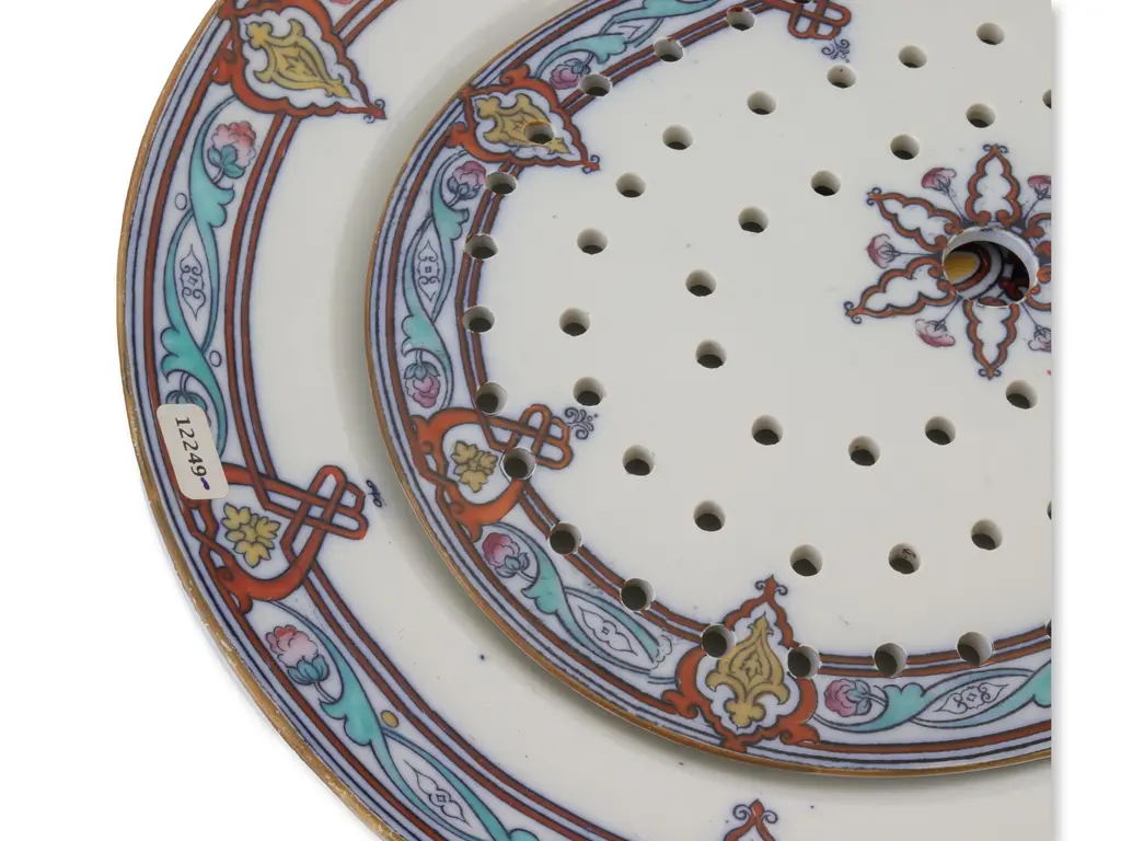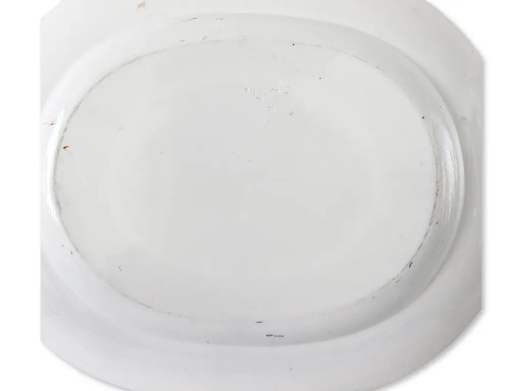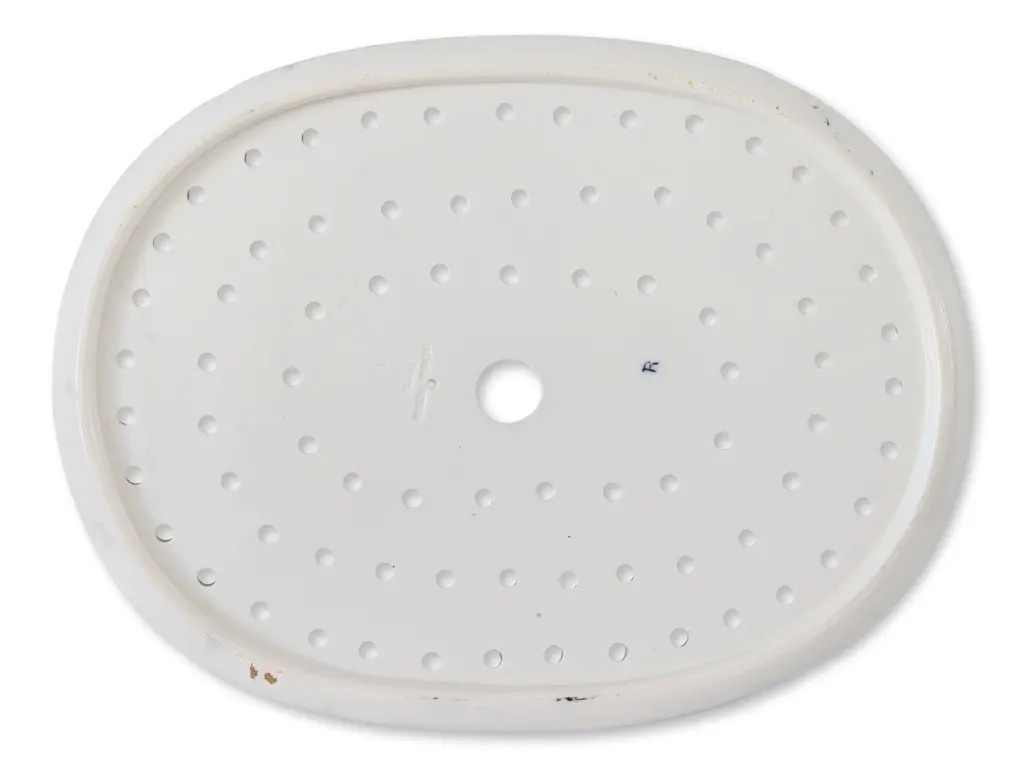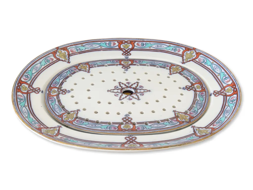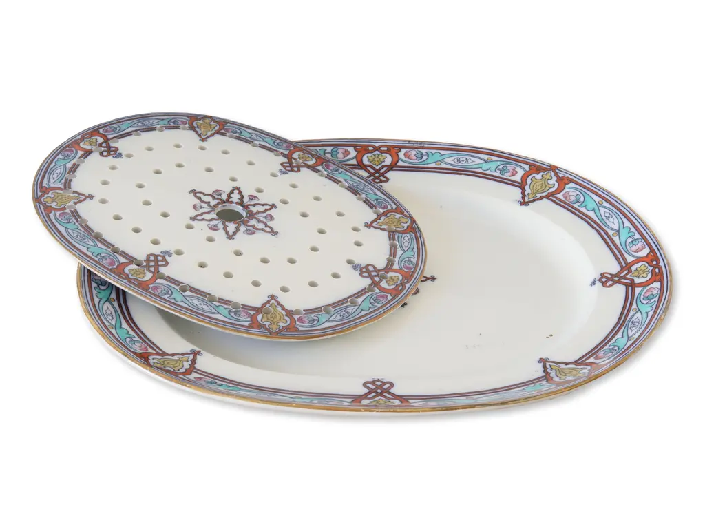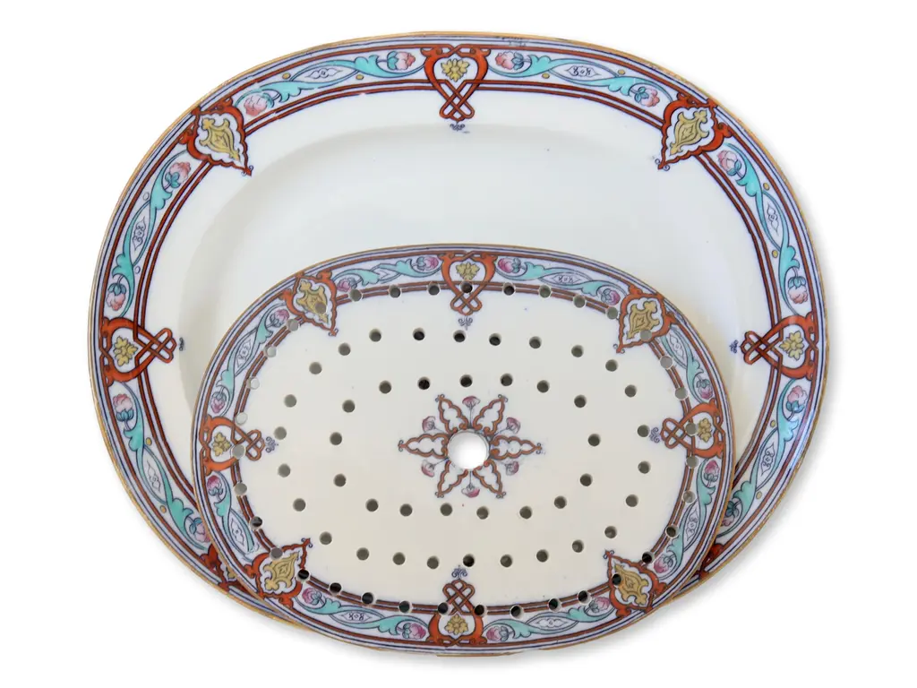 Antique Wedgwood pearlware platter with meat drainer. Drainer is used to drain the juice from a large roast or turkey as it is sliced. The durable Ironstone material ensures long-lasting beauty and functionality, while the convenient drainer effortlessly keeps excess liquids away, allowing you to serve your culinary creations with ease. Dimensions: Platter, 16.75"L x 14"W x 1.5"H; drainer, 12.25"L x 9.5"W x .5"H. Maker's mark on underside.