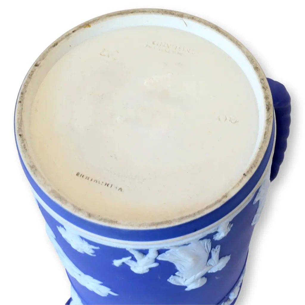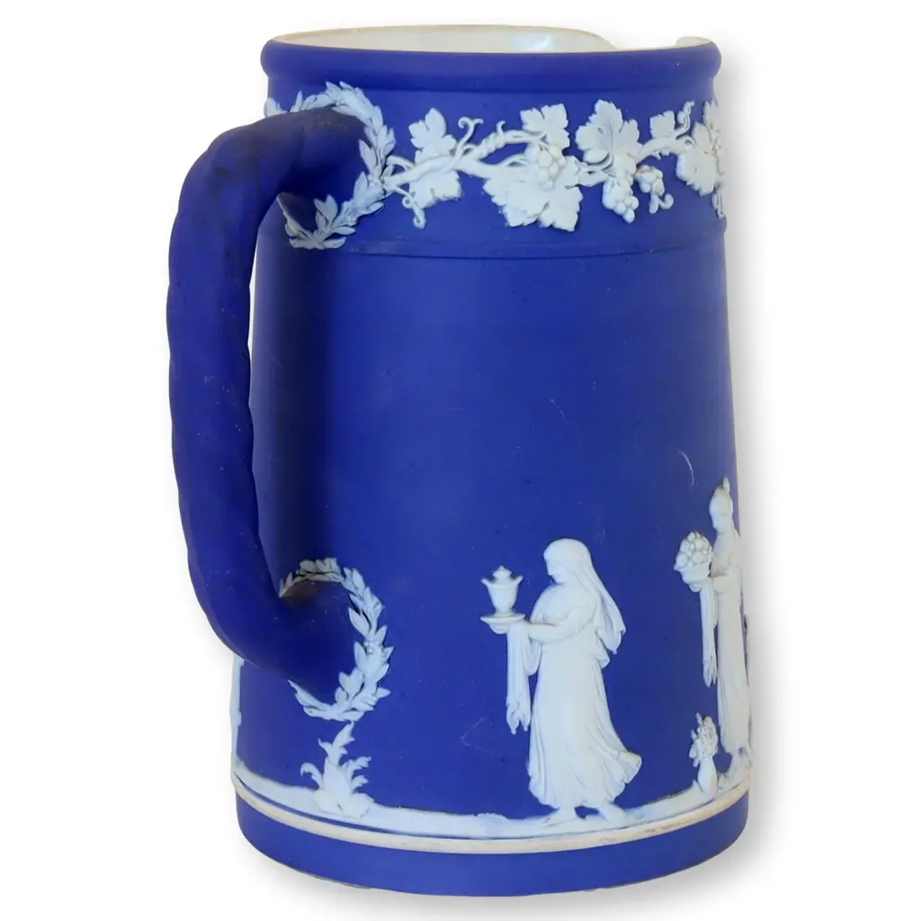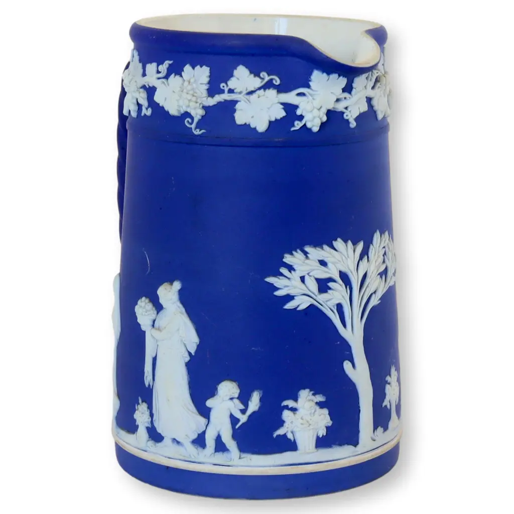 Antique Wedgwood dip glaze jug in deep Wedgwood blue and white. Pattern is raised and depicts classical and mythical figures and scenes. This one was made in the oldest Jasperware style, dip color glazed. The newer pieces are made of colored clay. Fully marked on underside.