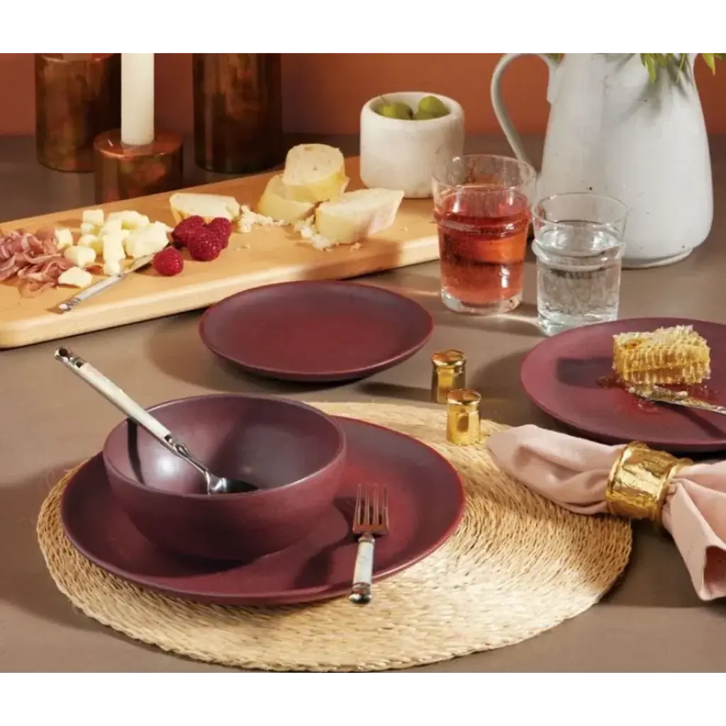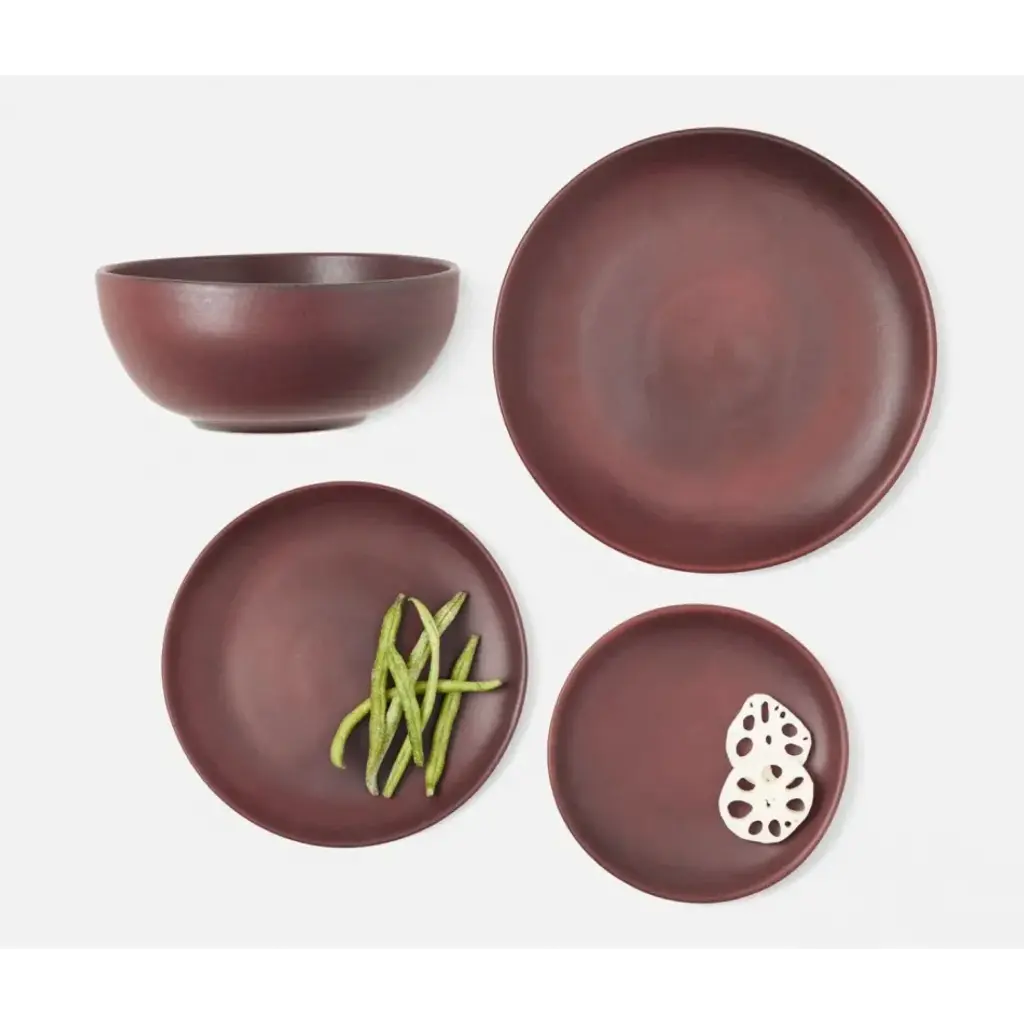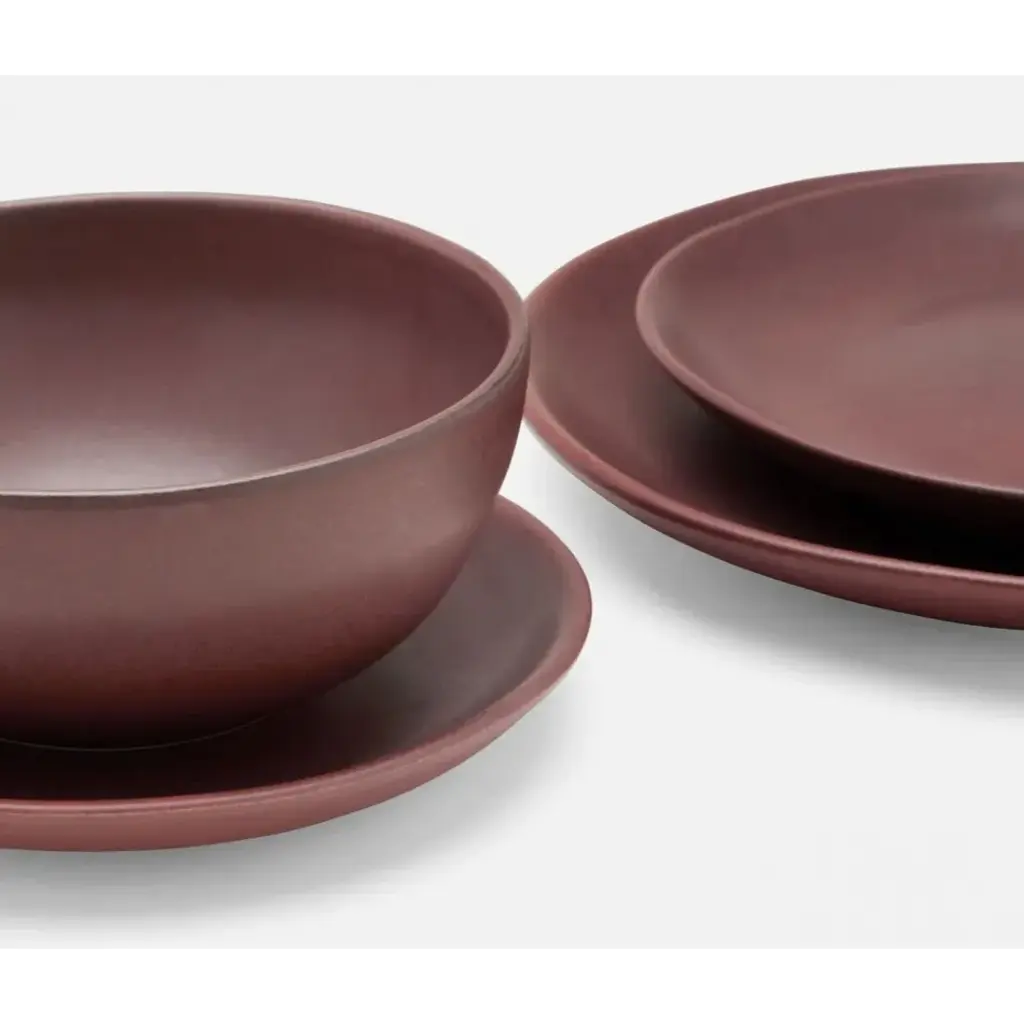 Finish: Oxblood Material: Porcelain Our Wellington dinnerware collection is an instant classic. These sturdy oxblood stoneware pieces nest beautifully, thanks to gently sloping rims, which also make it possible to fill plates, bowls, and cups all the way up. Blue Pheasant's products are handmade with care by artisans using natural materials. They are not mass produced, so variation between products should be expected, and this is why we love them! It is these irregularities that makes Blue Pheasant what it is—a special brand whose collections are distinctly handmade, full of charm and originality you’ll never find in machine-made products.