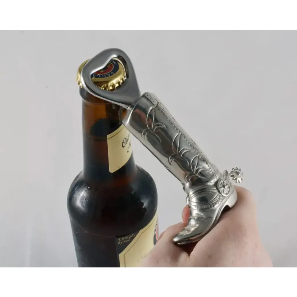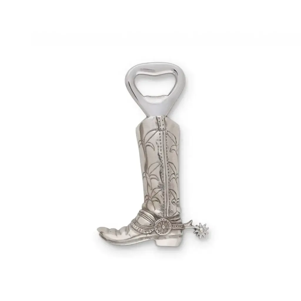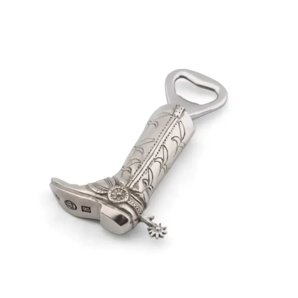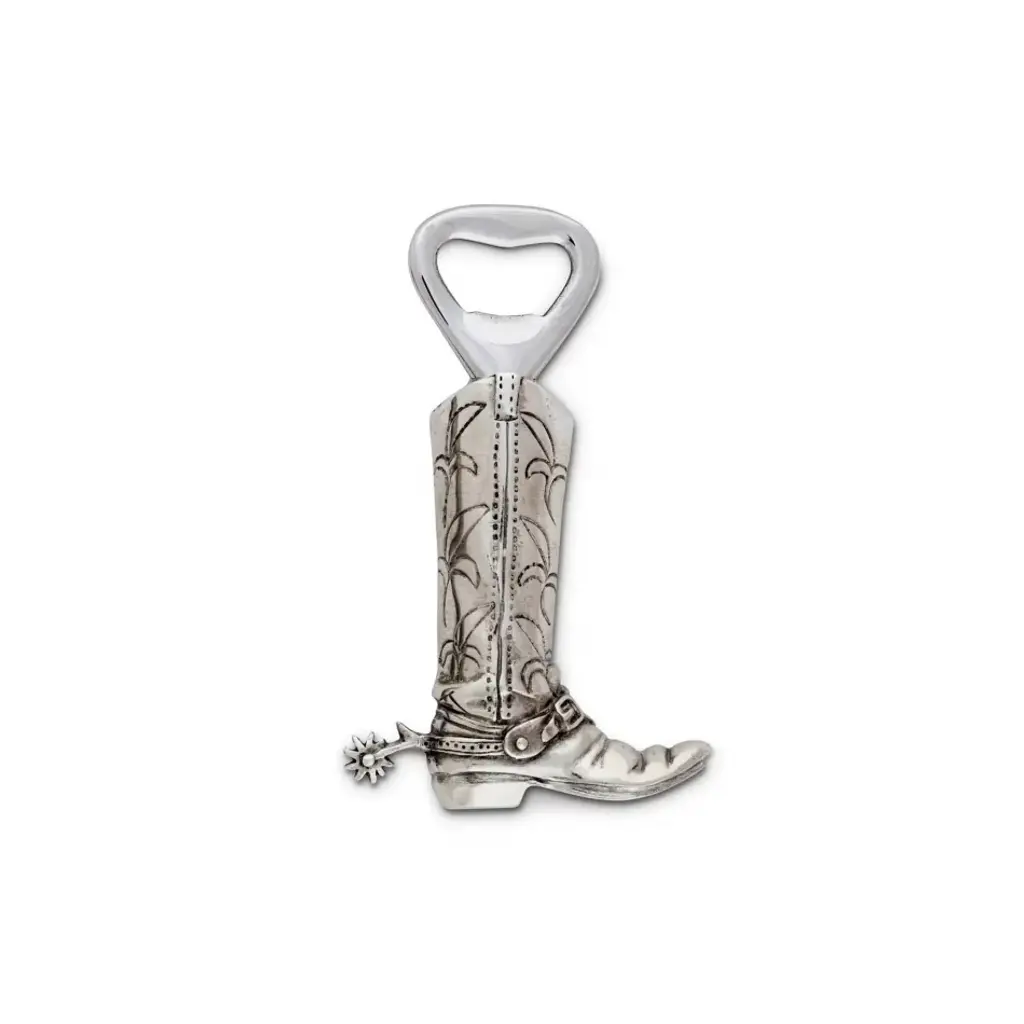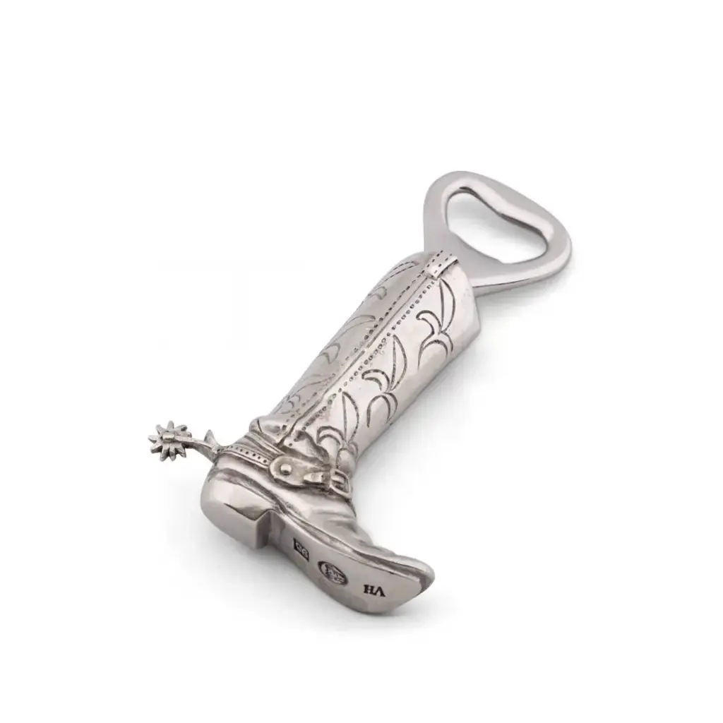 Spurs, buckles, tooled leather and wear marks can all be seen in the detailed pewter handle of Vagabond House’s Cowboy Boot Bottle Opener. A sturdy stainless steel head is ready to take on any bottle you care to challenge it with. Pair the bottle opener up with partners from the Vagabond House Western Frontier Collection for a wild, wild west bar. Celebrate the freedom of the Wild West with Vagabond House’s Western Frontier Collection. Slip into boots, strap on spurs and invite your gang to a chuck wagon feast not easily forgotten. Rugged, western designs combine pure pewter, sturdy stoneware and sustainable antler. Vagabond House is a family-owned American company specializing in fine pewter tableware, servingware and giftware. Largely inspired by nature, their exclusive products are designed to be unique, functional heirlooms for those who seek to express tradition and style in both family and formal entertaining.