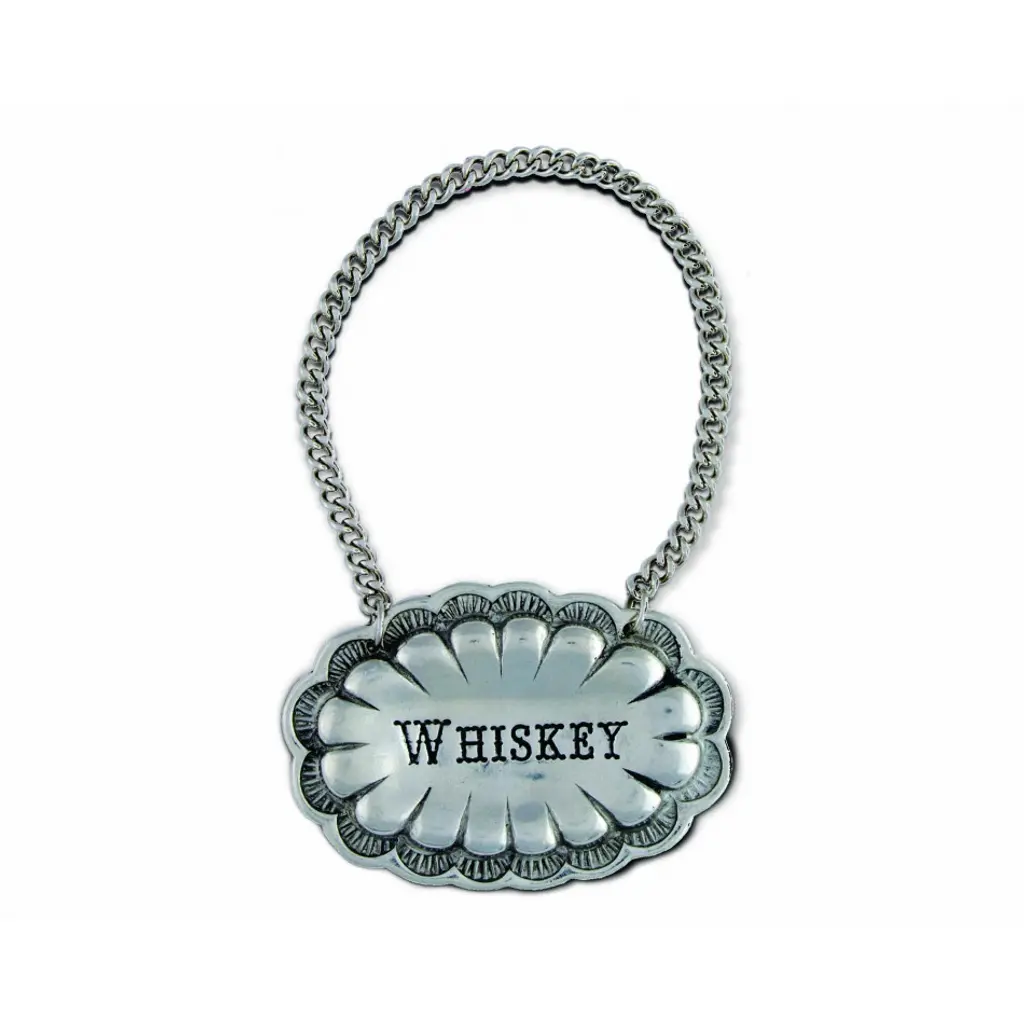 Our suite of old west style spirit decanter tags are crafted from pure pewter. Each tag features a weighted metal chain to ensure a perfect fit for your decanter of choice. The scallop edged, oval sunburst style tag features a repoussé plate with the spirit name of your choice captured in an old west typeface font. Choose from the following spirits: Bourbon-Gin-Rum-Scotch-Tequila-Vodka-Whiskey Vagabond House is a family-owned American company specializing in fine pewter tableware, servingware and giftware. Largely inspired by nature, their exclusive products are designed to be unique, functional heirlooms for those who seek to express tradition and style in both family and formal entertaining.