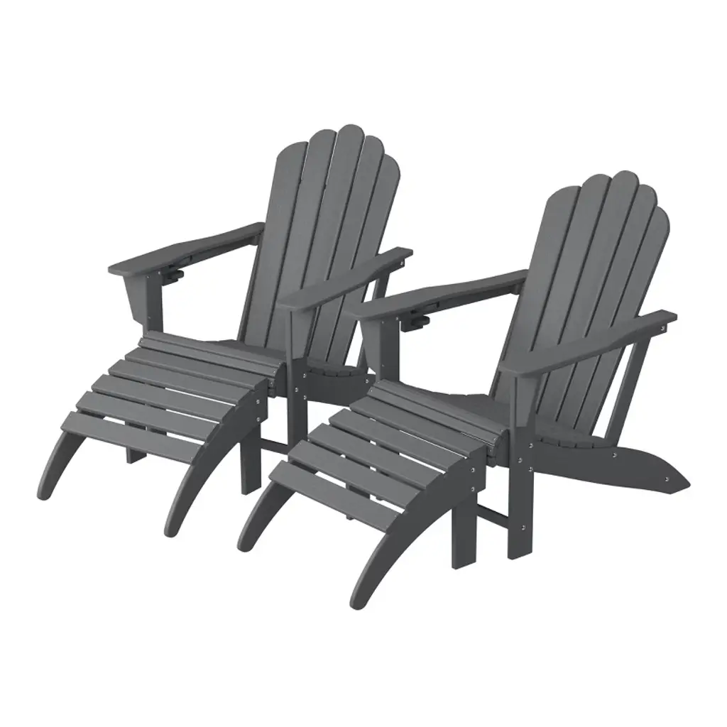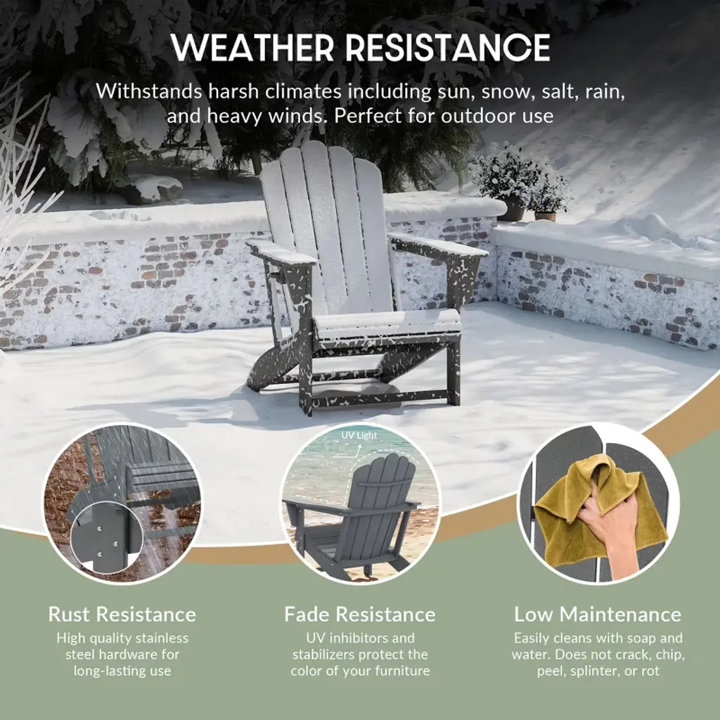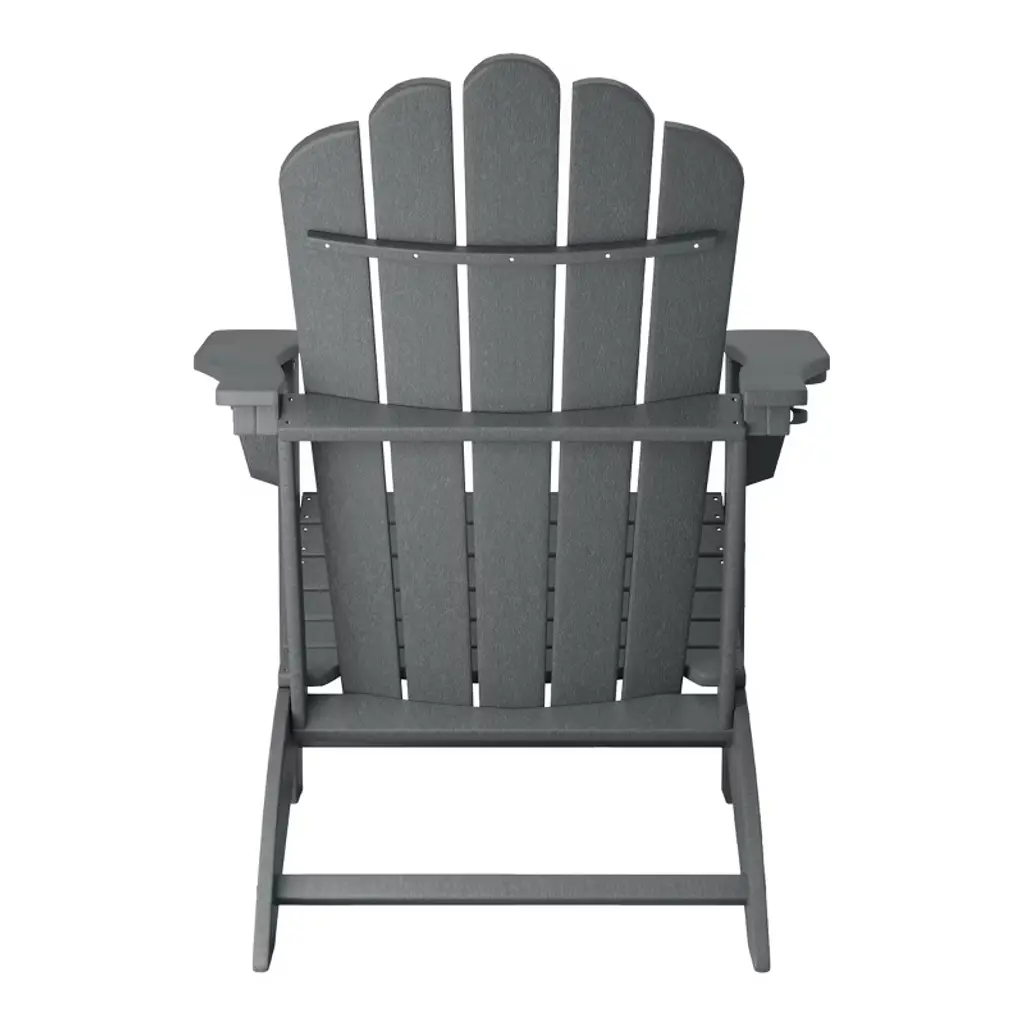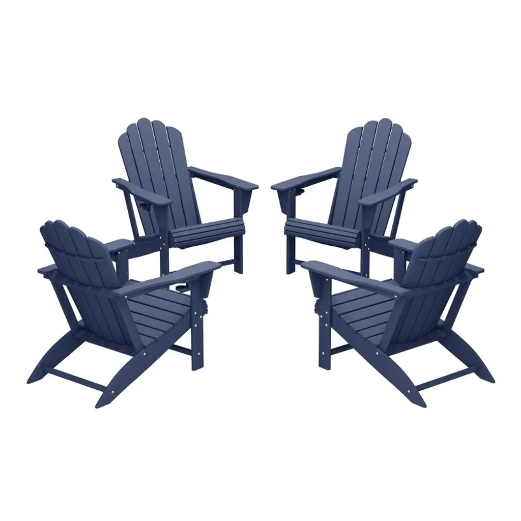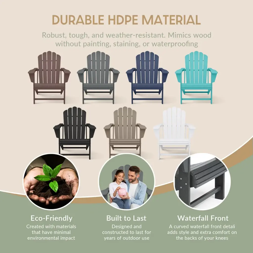 Pull up a chair and relax around the firepit with friends or loved ones with our set of four classic Adirondack chairs, featuring a hidden cup holder for ultimate convenience. Crafted from durable, weather-resistant, UV and fade-resistant HDPE, these chairs are designed to withstand the elements and provide lasting comfort. The contoured seat and backrest offer optimal support, while the hidden cup holder keeps your drink within reach.While we strive to accurately represent product colors, please be aware that actual colors may vary slightly due to individual screen settings and lighting conditions. FeaturesSet includes: (Four) 4 Outdoor Adirondack Chairs with Cup HoldersConstructed from durable HDPE material and designed to be stable and sturdyWeather resistant to protect against the harsh outdoor elementsFade and UV resistant to protect against the sunHidden cup holder to hold your drinks on those warm or cold afternoons20" Inch wide seat for a spacious seat wth a contoured seatInclined seat and curved backrest for a more ergonomic and comfortable designDetails:Product Type: Adirondack ChairsWhat's Included: (4) Adirondack ChairAdirondack ChairDimensions: 29.5" W x 33" D x 36.75" HWeight: 38 lbs.Seat Width: 20.75"Seat Depth: 19.5"Seat Height: 15"Weight Capacity: 450 lbs.
